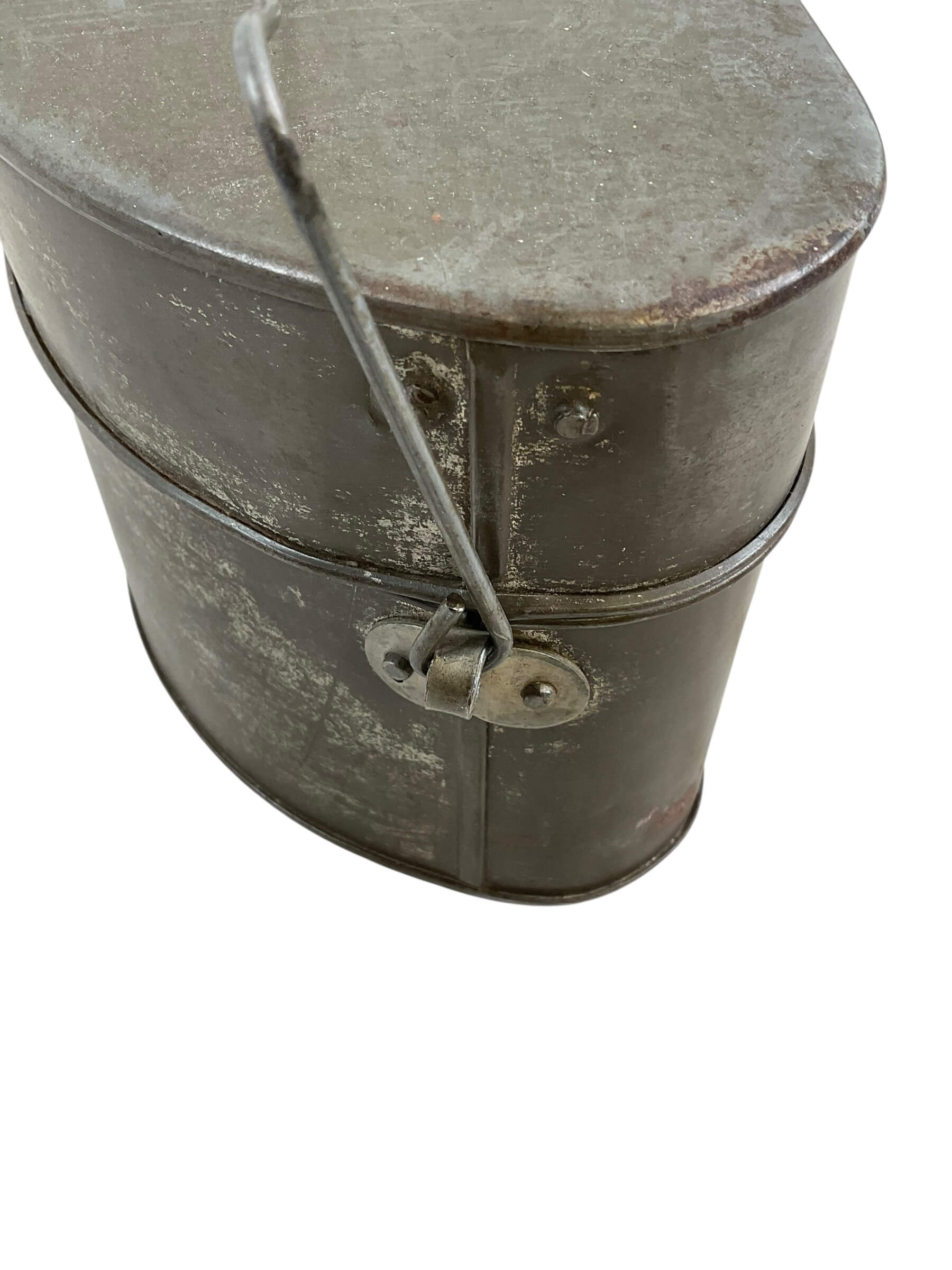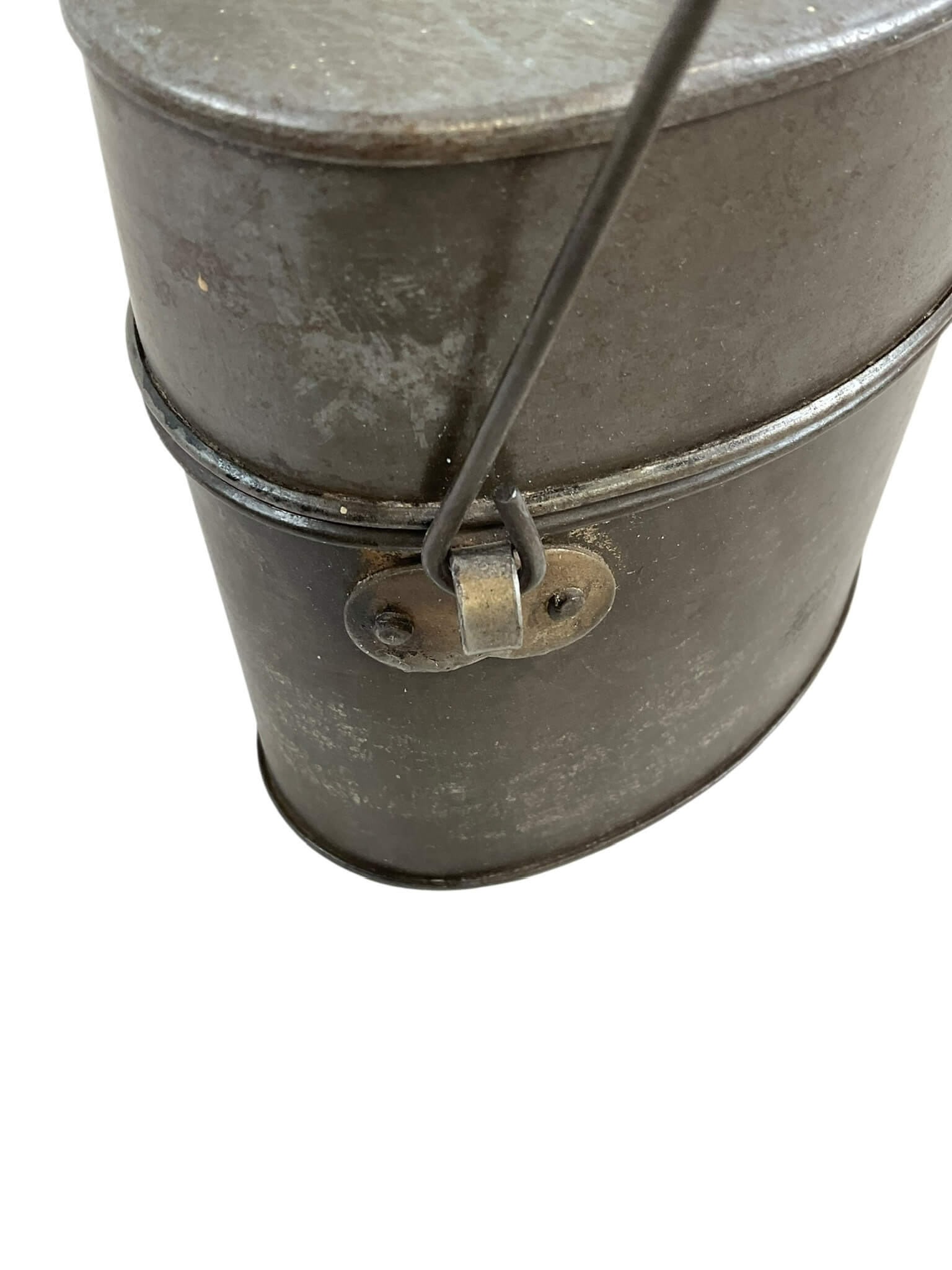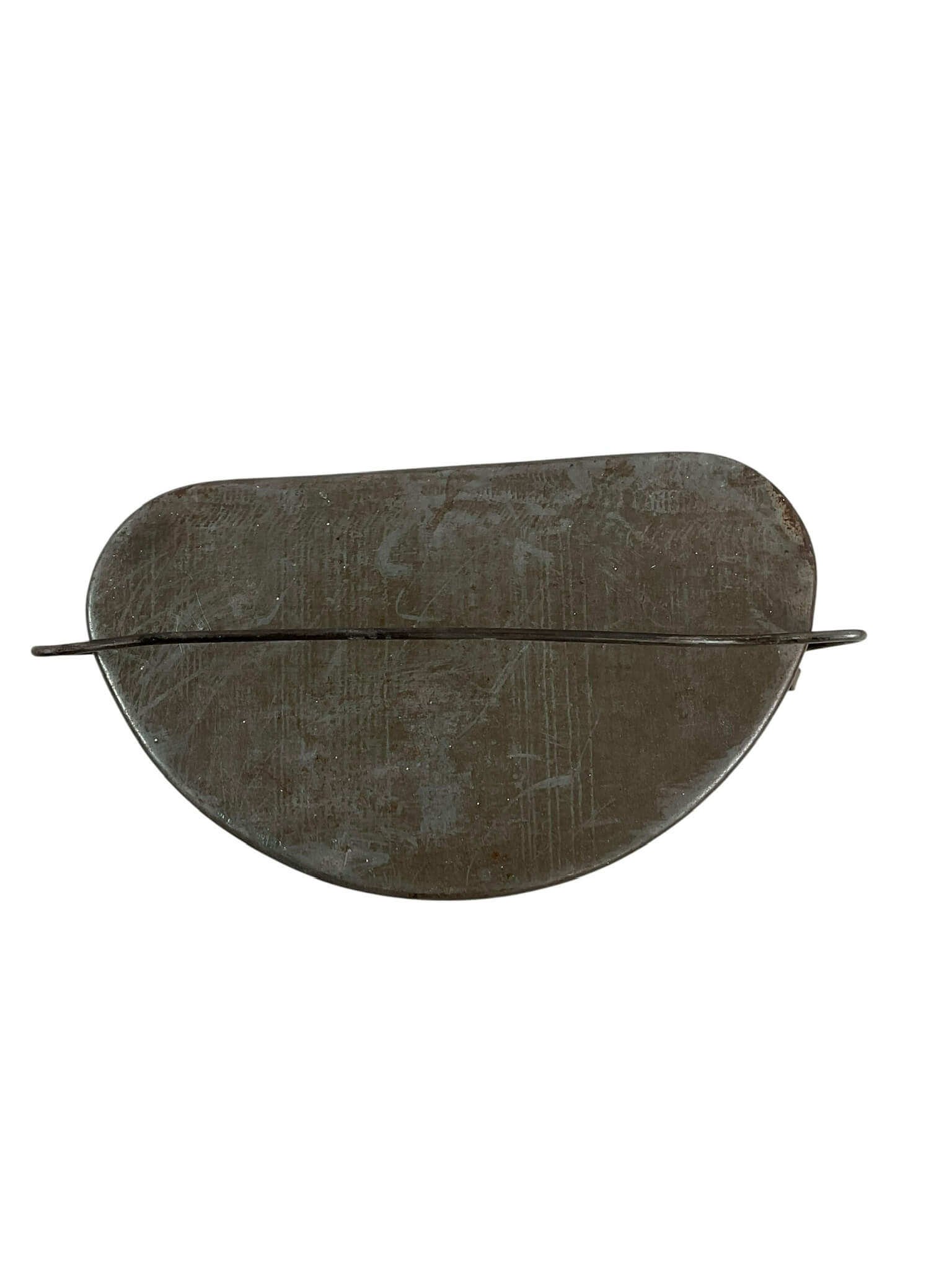 ‘WW1 Canadian CEF D-Shaped Mess Tin C Broad Arrowed’ is a historical artifact that reflects the courageous efforts of the Canadian Expeditionary Force (CEF) during World War I. This D-shaped mess tin is a testament to the survival and resilience of the soldiers in the harshest of conditions. The broad arrow mark on the tin signifies its military issue status, a common symbol used by the British Commonwealth to denote government property. Crafted with sturdy materials and a practical, collapsible design, the mess tin was an essential item for soldiers in the trenches, used for both cooking and eating. This artifact not only offers a glimpse into the daily life of a WW1 Canadian soldier, but also serves as a tangible piece of Canada’s rich military history.