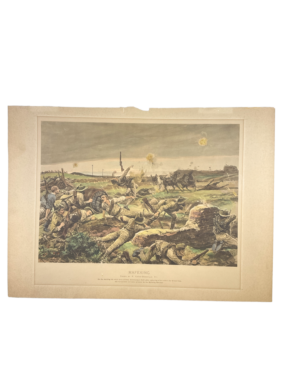 This exquisite lithograph print captures a momentous scene from the Boer War, specifically the famous Siege of Mafeking, a landmark event in British Victorian military history. Measuring 10 x 12 inches, the vibrant colour print brings to life the intense battle that captivated the British public and showcased the strategic brilliance of Colonel Robert Baden-Powell, the siege’s stalwart defender. The artwork vividly illustrates the resilience and tactical maneuvers of British forces during one of the most celebrated battles of the conflict. An exceptional piece for historians and collectors alike, this Victorian-era print not only serves as a decorative treasure but also as a poignant reminder of the heroism and challenges faced during the Second Boer War. Its finely detailed depiction and historical significance make it a coveted artifact for those with an interest in British military history.
