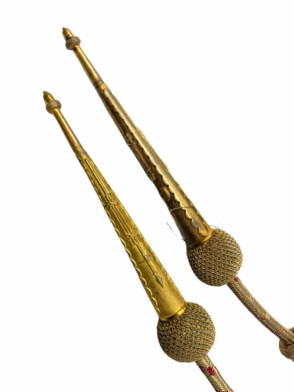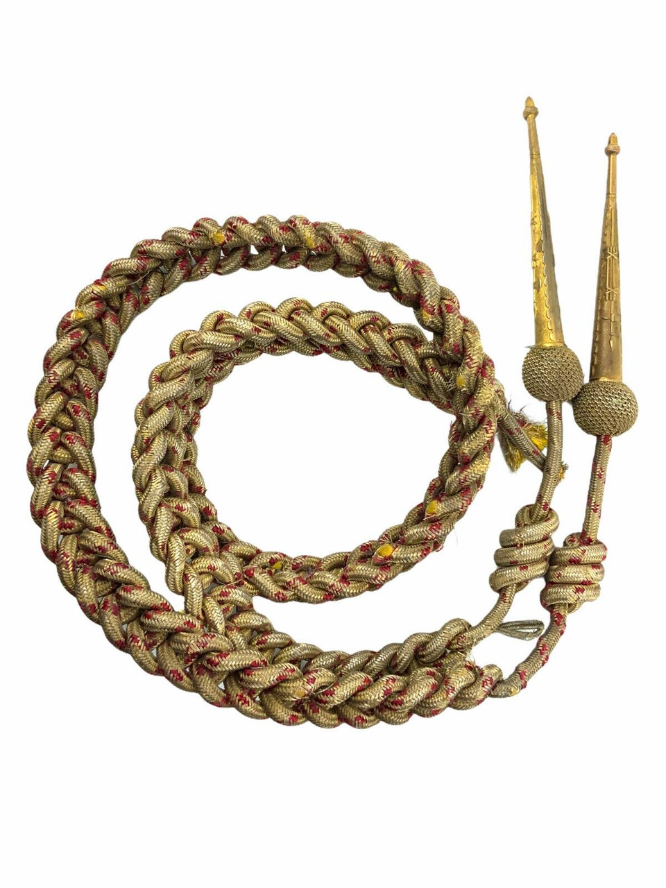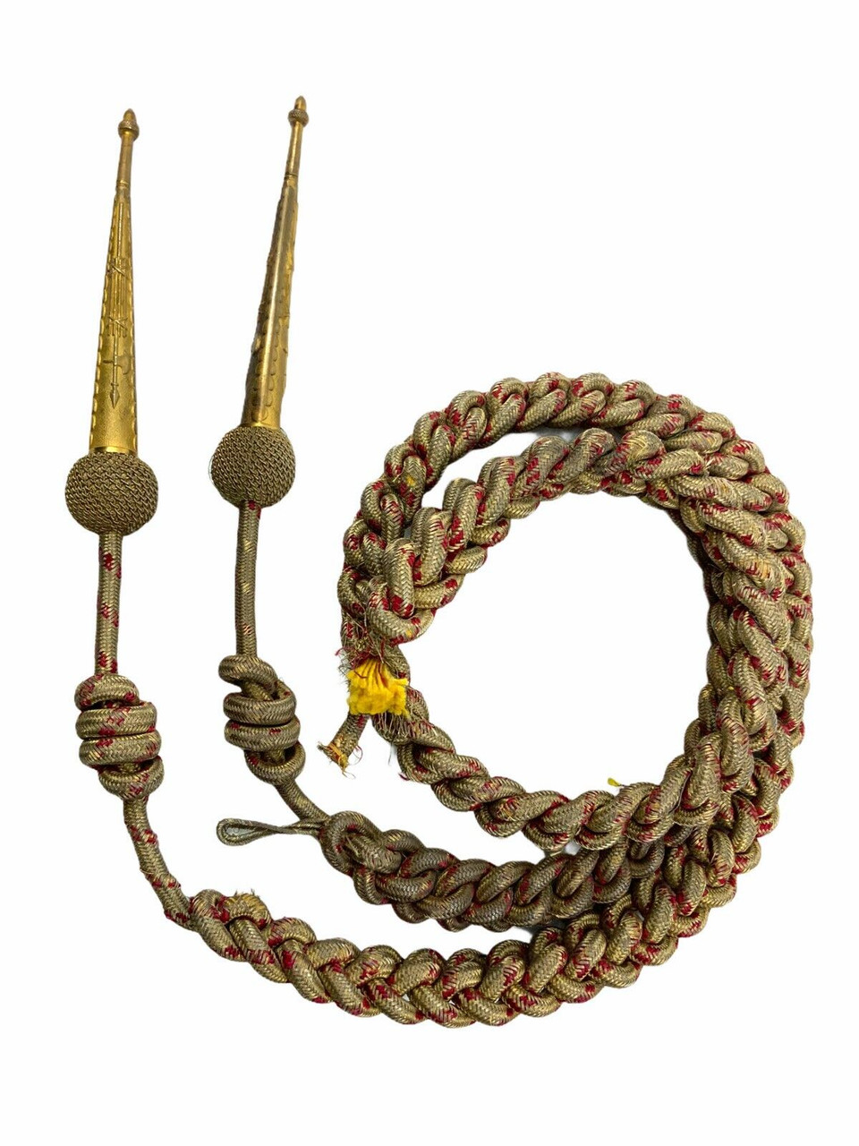 Title: Victorian British Regimental Aiguillettes w/ Brass Fittings Description: These Victorian British Regimental Aiguillettes with Brass Fittings represent the epitome of 19th-century military elegance and tradition. Traditionally worn by officers and distinguished personnel, these ceremonial cords exemplify the intricate craftsmanship of the Victorian era. The aiguillettes feature meticulously braided cords, enhanced with high-quality brass fittings that showcase the historical flair and attention to detail characteristic of the period. Perfect for collectors of military memorabilia, reenactors, or history enthusiasts, these shortened aiguillettes not only serve as a striking visual piece but also symbolize the proud heritage and regalia of the British military. Their preserved condition offers a tangible connection to the past, making them a valuable addition to any collection.
