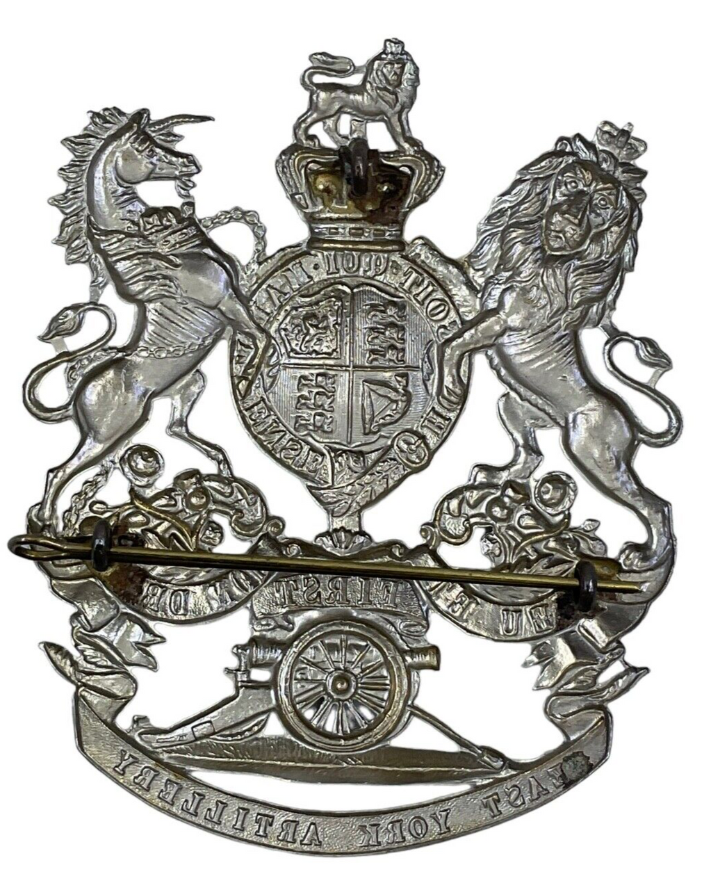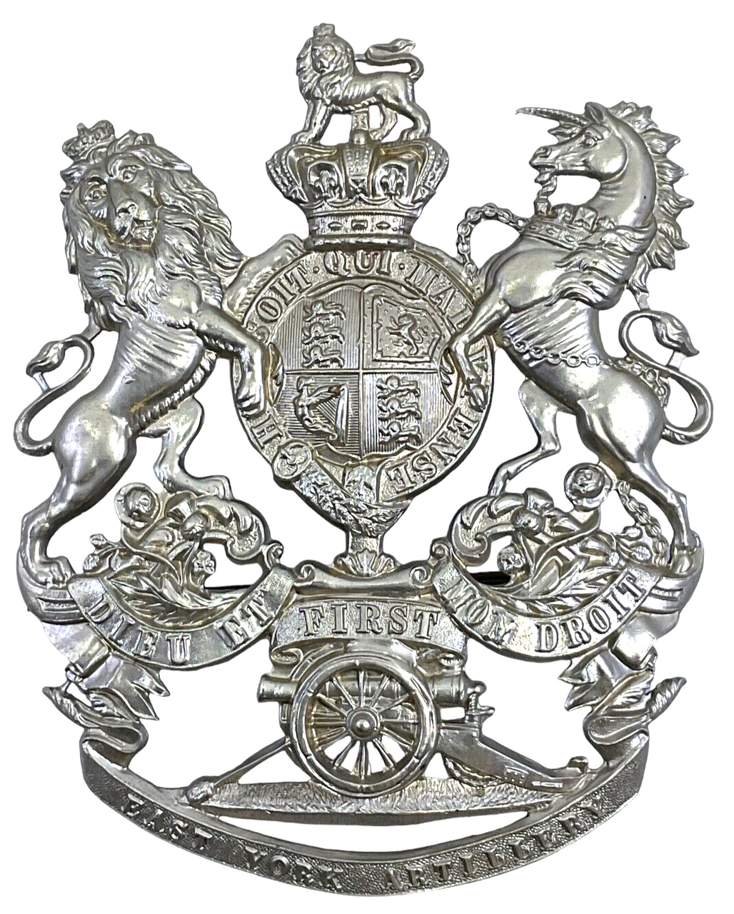 The “Victorian Canadian First East York Artillery Helmet Plate” is a remarkable piece of military history, emblematic of the esteemed Victorian era. This intricately designed helmet plate was used by the First East York Artillery, a distinguished regiment in Canada. Crafted with meticulous detail, the plate features traditional Victorian motifs, showcasing the heraldic insignia and symbols of artillery prowess. Made from high-quality materials, it would have adorned the helmets of artillery personnel, reflecting their dedication and the regiment’s storied heritage. Rich in history, this artifact not only signifies the martial pride and decorum of its time but also serves as a tangible connection to Canada’s military past, particularly in the East York region. Collectors and historians alike cherish such items for their rarity and the fascinating stories they encapsulate, offering a glimpse into the valor and tradition of Victorian-age Canadian artillery forces.