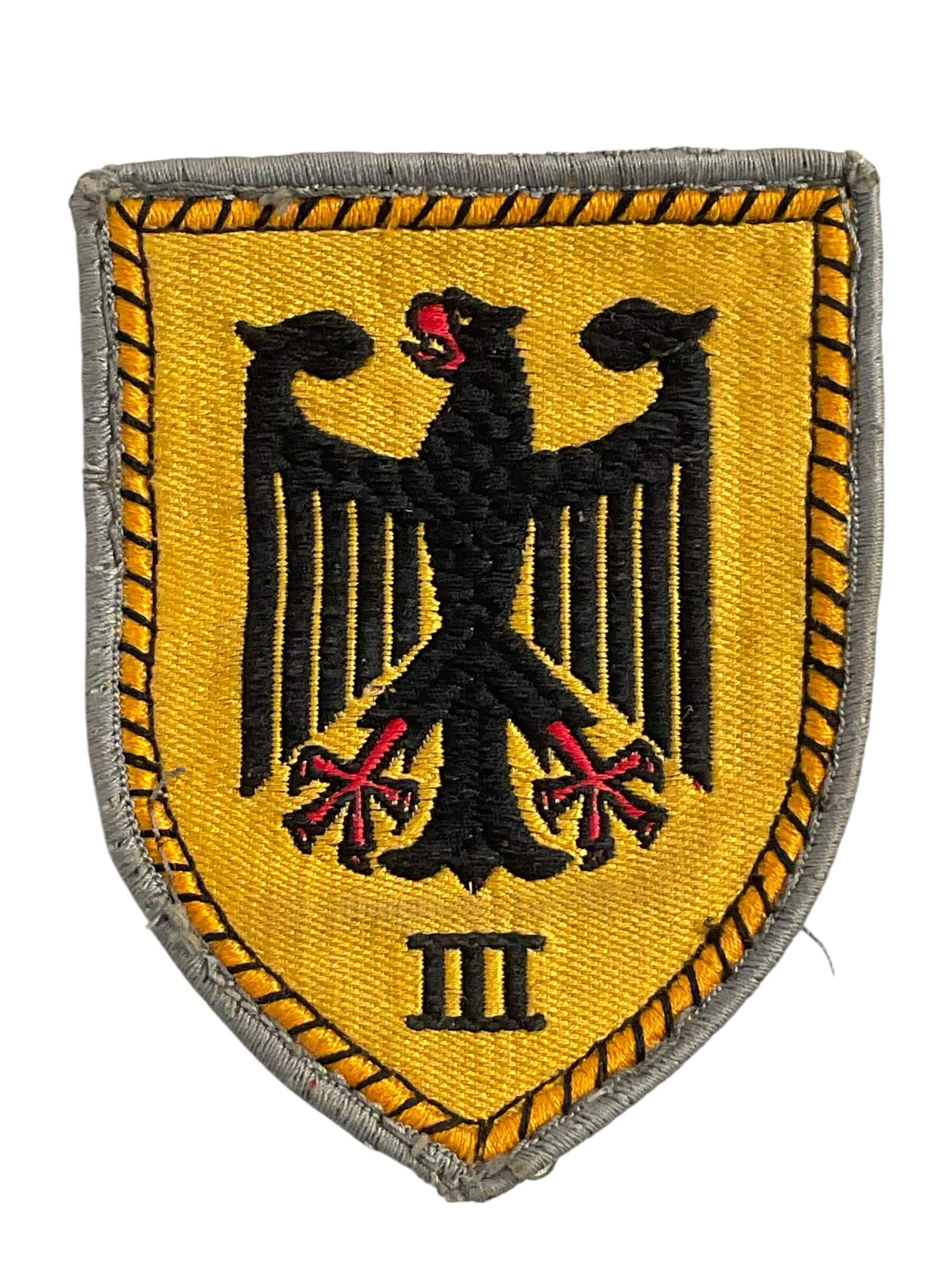 The West German Army Bundeswehr 3 Corps Patch is a military insignia used by personnel assigned to the III Corps of the Bundeswehr, the armed forces of the Federal Republic of Germany. Established during the Cold War period, III Corps played a key role in the defense structure of West Germany as part of NATO’s Central Army Group. The patch typically features a shield-shaped design with distinctive colors and symbols representing the corps’ identity. Worn on the uniform’s sleeve, this embroidered cloth badge signified membership and unit affiliation for soldiers within the 3 Corps. Items such as these are of interest to collectors, historians, and researchers studying military organization and insignia. The West German Bundeswehr adopted standardized uniform insignia following its formation in 1955, and this patch is representative of that era. The design and construction reflect military specifications for durability and clarity of identification during service use.