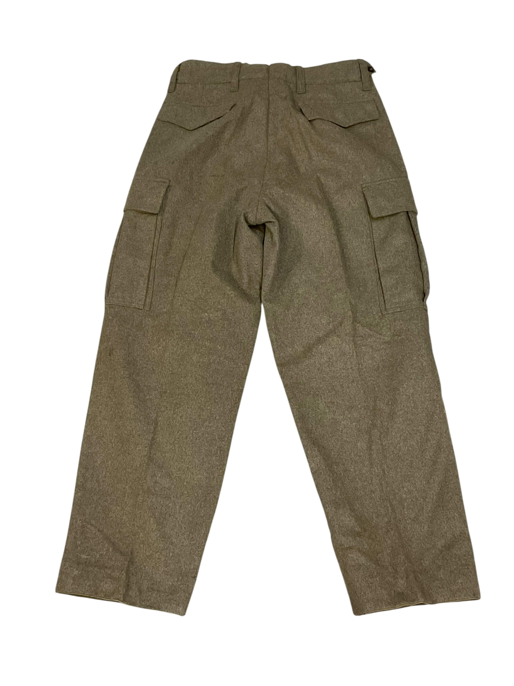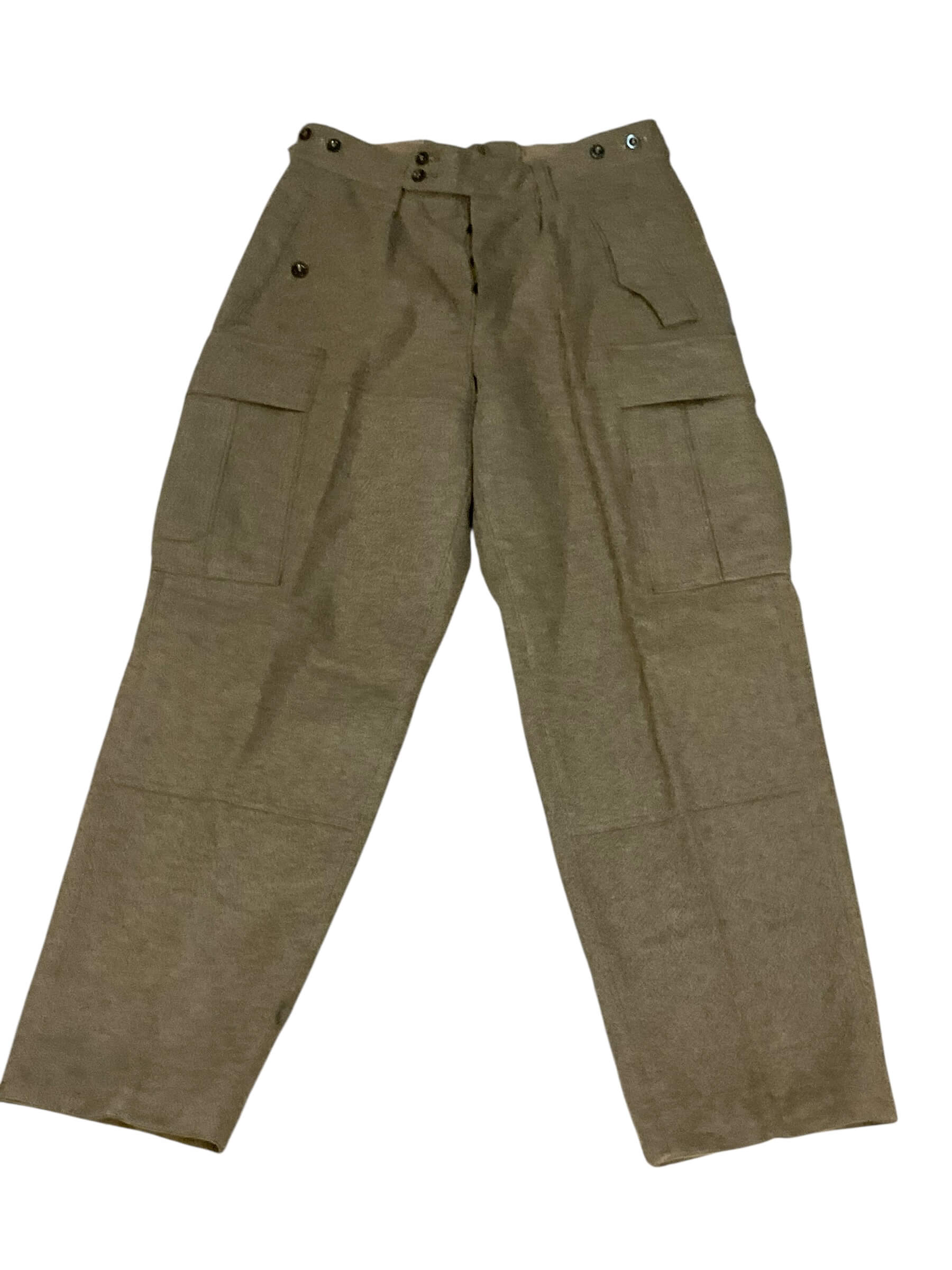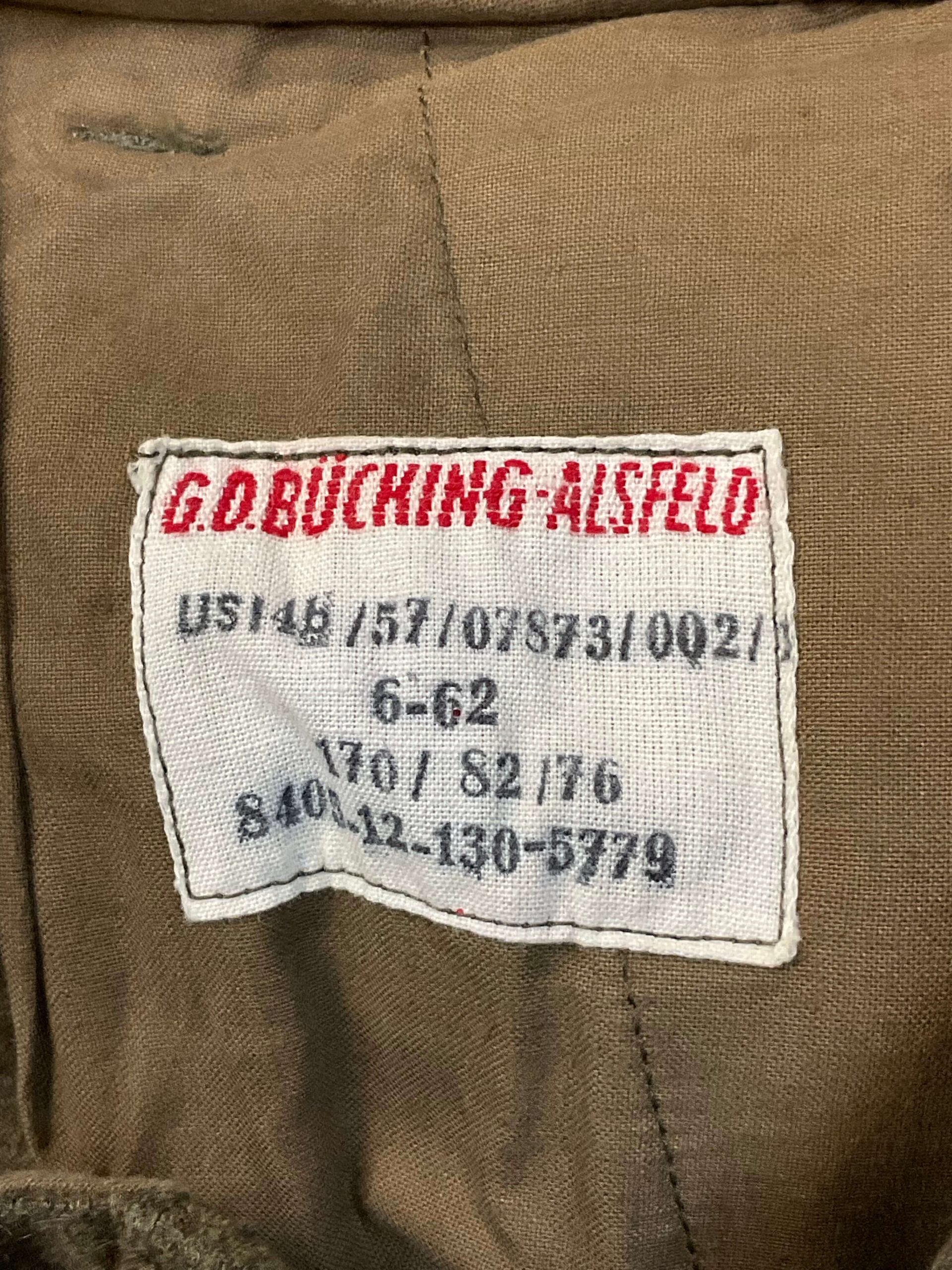 The West German Army Trousers in size 34″ x 30″ are standard-issue military pants originally produced for the Bundeswehr—the armed forces of West Germany—during the Cold War era. Constructed from durable, mid-weight fabric, these trousers were designed for daily military use and field operations. The trousers typically feature a button fly, reinforced seat and knees, and adjustable waist tabs for a secure fit. Standard elements include belt loops, slanted hip pockets, and buttoned rear and cargo pockets for practical storage. The overall cut is intended to offer mobility and functionality in various operational environments. The color is commonly an olive drab or similar military green shade, consistent with Bundeswehr uniform regulations of the period. These trousers reflect period-specific tailoring and materials used from the late 20th century and may show minor wear consistent with previous service. They are suitable for historical study, uniform collecting, or display within a military antiques context.