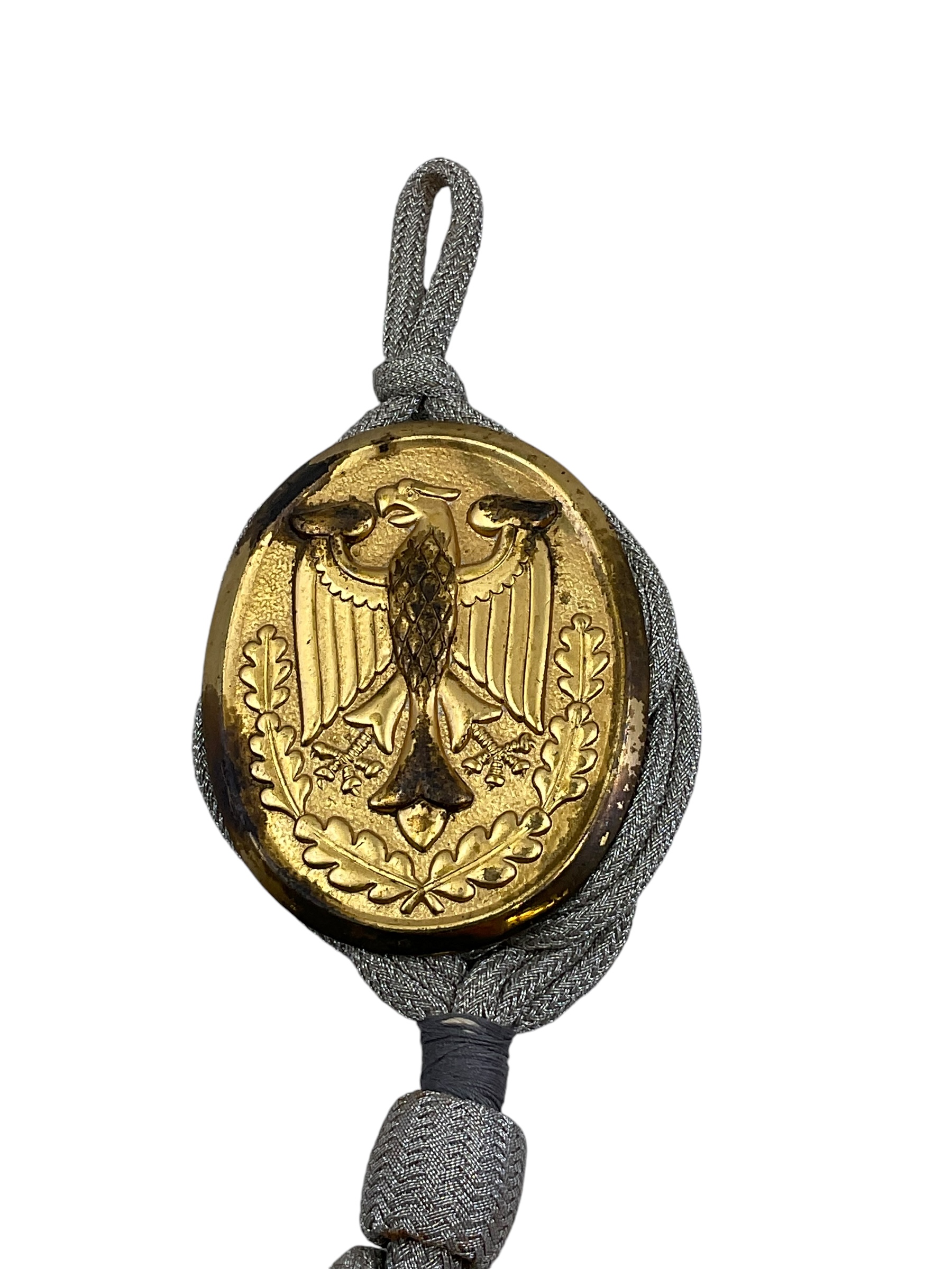 The ‘West German Gold Shooting Award Lanyard’ is a highly collectible piece of memorabilia that hails from the period of post-war West Germany. This distinctive lanyard is often sought-after by collectors and enthusiasts of shooting sports, military history, and German artifacts. The lanyard, primarily used for carrying an identification card or keys, features an exquisite gold medallion. The medallion is embossed with an intricate design that reflects the traditional shooting sports in Germany. The lanyard itself is made of a robust and high-quality material, usually in a shade of green or black, which gives it a durable and strong finish. This item not only represents a prestigious award in shooting sports but also serves as a fascinating historical artifact that symbolizes a unique era in Germany’s history.