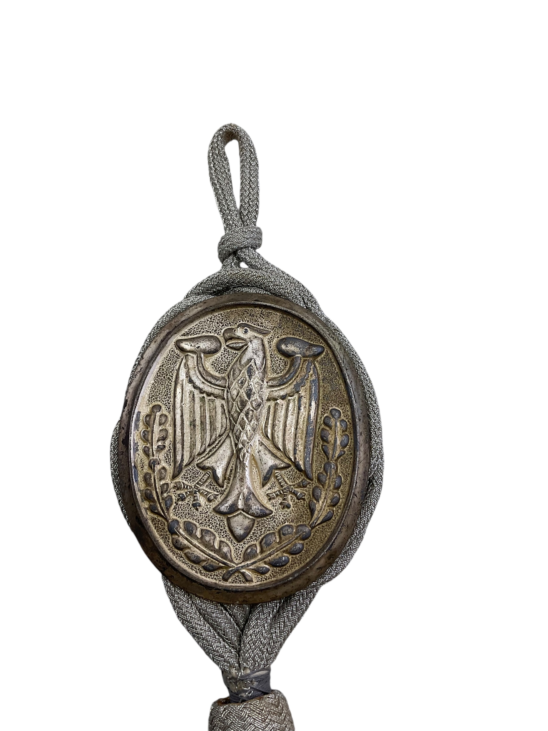 This is a distinctive, vintage West German Silver Shooting Award Lanyard, a cherished memento from the post-WWII era. The lanyard is crafted with meticulous detail, adorned with sterling silver medallions, each symbolizing a different level of marksmanship achievement. The design mirrors the rich heritage and disciplined precision of German shooting clubs. The silver medallions are beautifully embossed with traditional Germanic motifs, showcasing the extraordinary craftsmanship of the time. This piece not only represents a unique part of West German history but also serves as an emblem of personal achievement in the sport of shooting. It’s an excellent collectible for history enthusiasts, shooting sports aficionados, or those who appreciate unique, antique accessories. The West German Silver Shooting Award Lanyard is a tangible connection to the past, celebrating the spirit of competition and excellence in a bygone era.