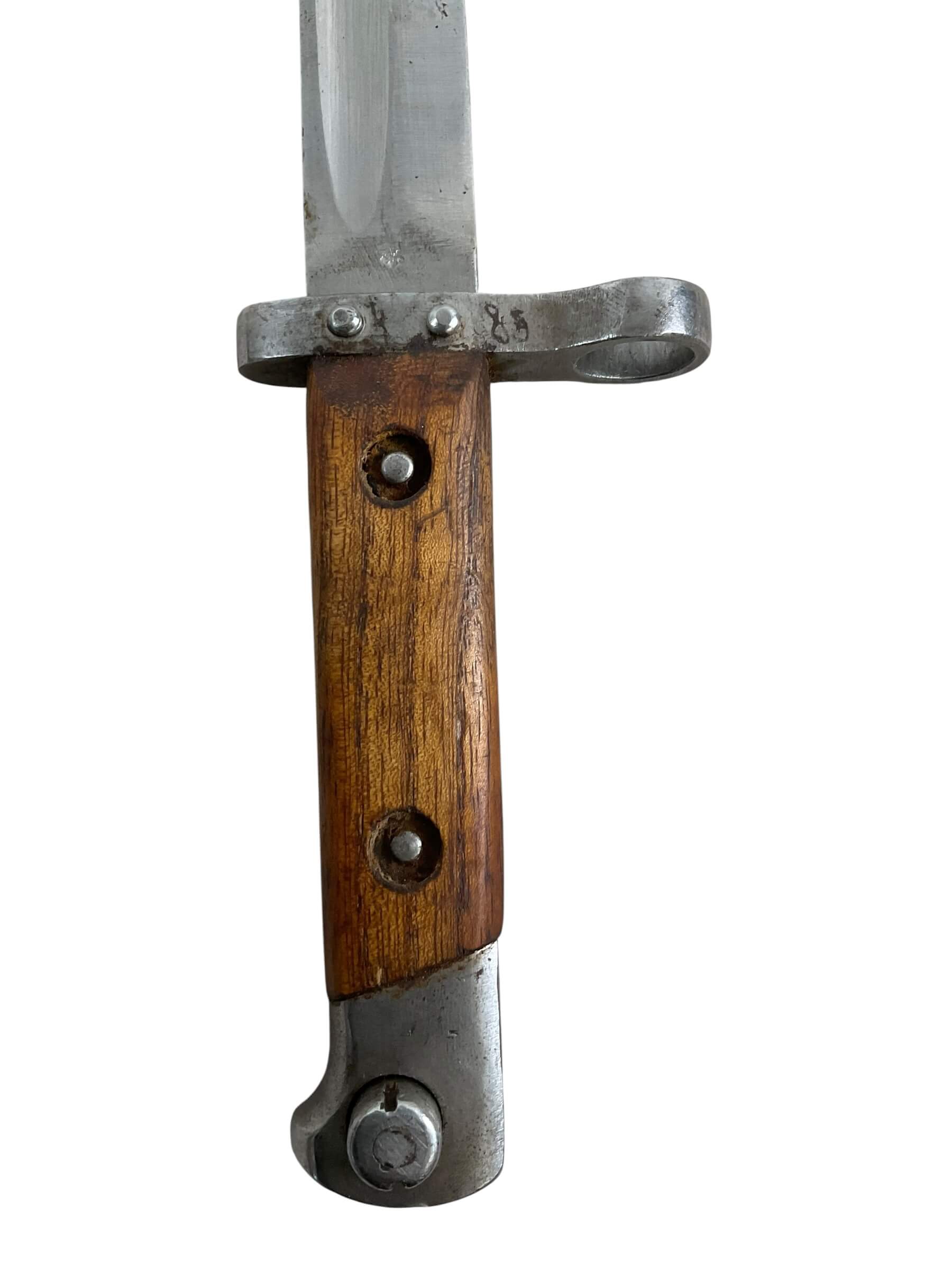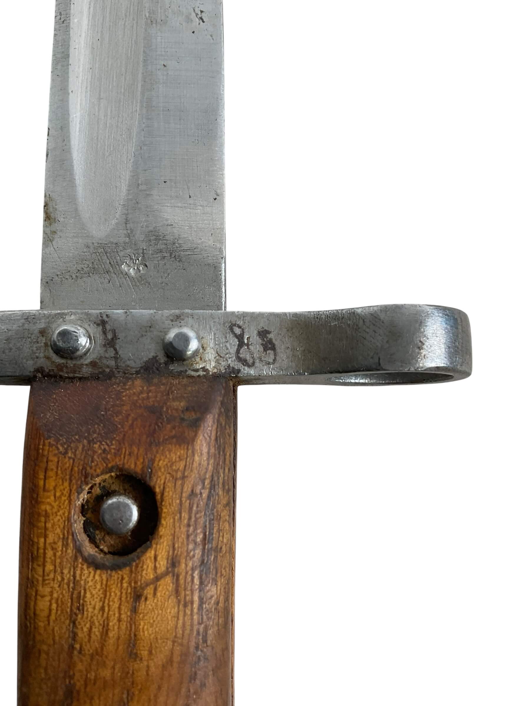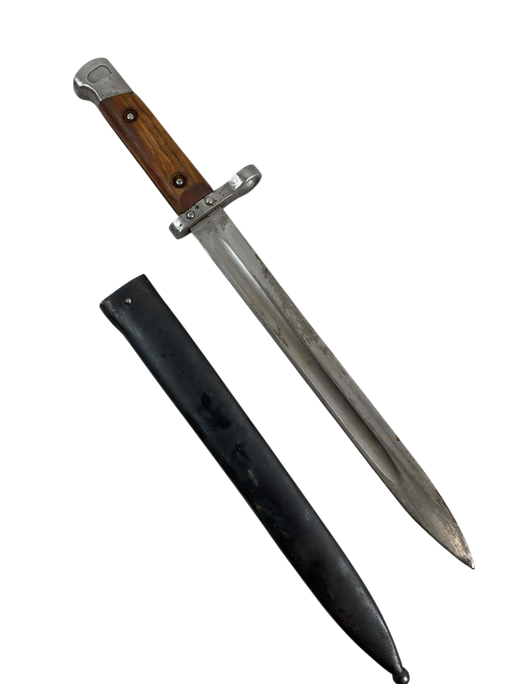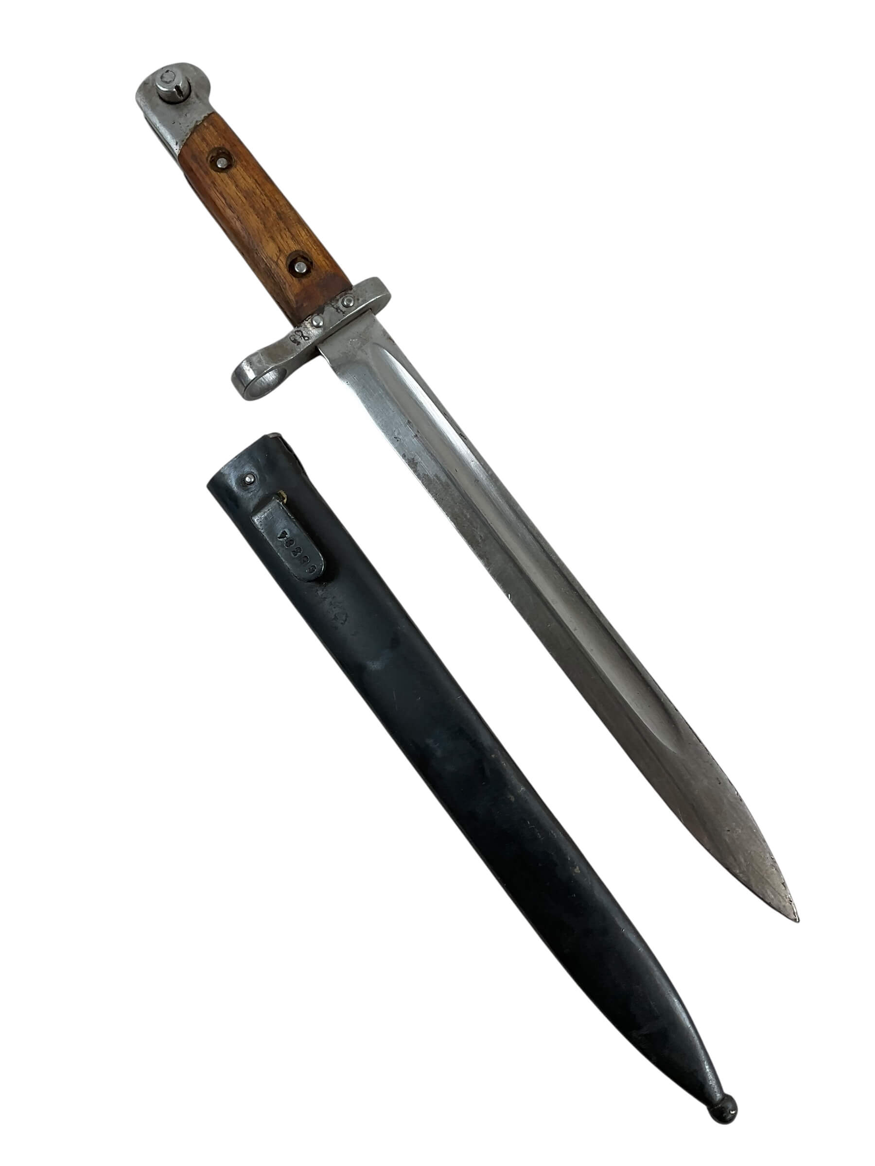 The WW1 Austrian M95 Mannlicher Steyr Bayonet with Scabbard is an exceptional piece of military history. This bayonet, produced for the Austrian-Hungarian army, was part of the standard equipment for the Mannlicher M95, a bolt-action rifle widely used during World War I. The bayonet features a sturdy steel construction, a single-edged blade, and a hooked quillon crossguard, which adds to its distinctive design. Its scabbard, typically made of metal, is designed to protect the blade and ensure its longevity. The M95 bayonet, with its unique craftsmanship and historical significance, is not only a must-have for collectors of World War I memorabilia but also a fascinating artifact for anyone interested in military history. Its connection to one of the most tumultuous periods in world history makes it a truly captivating collectible.