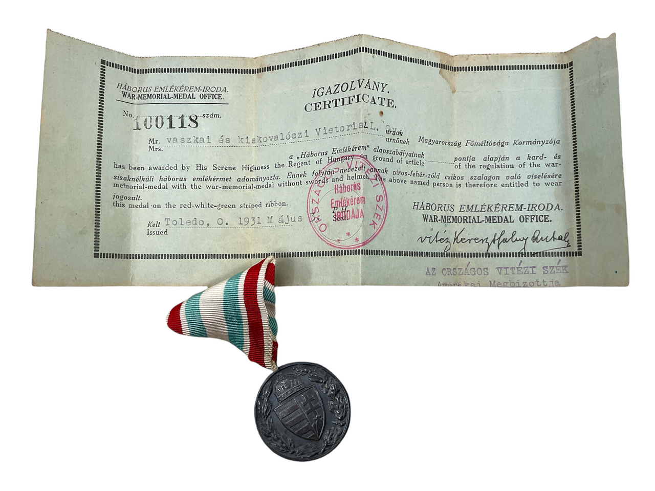 WW1 Austro Hungarian War Medal & Ribbon With Certificate Non Combatant