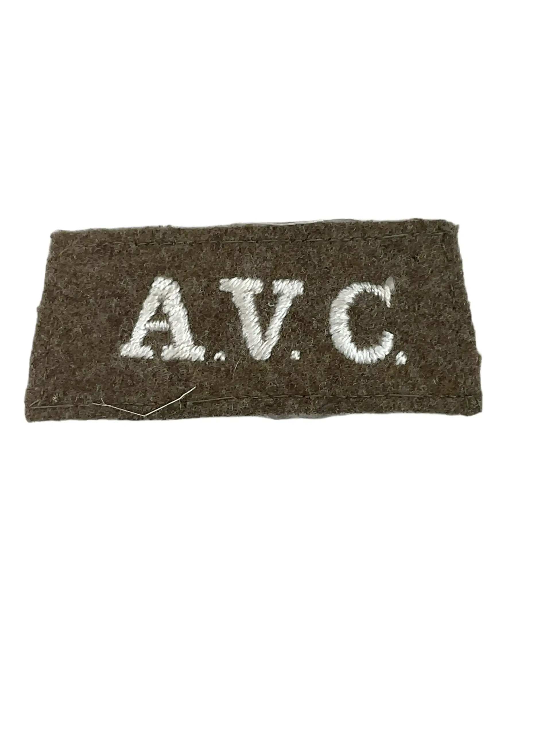 This listing is for a single WW1 British Army Veterinary Corps (A.V.C.) slip-on insignia. The Veterinary Corps was responsible for the care and treatment of horses and other animals integral to military operations during the First World War. This slip-on insignia would have been worn on the shoulder strap of the uniform, identifying the wearer’s corps affiliation. The piece consists of cloth construction, typically featuring dark blue or black lettering “A.V.C.” embroidered or woven onto a khaki or drab background to match the standard British Army service dress of the era. The slip-on design enabled easy removal for washing or change of uniform, a practical feature adopted during the war. Such insignia formed an essential part of the uniform regulations and highlighted the specialized nature of military veterinary services in the British Army during WW1. This item is offered as a single original slip-on insignia.