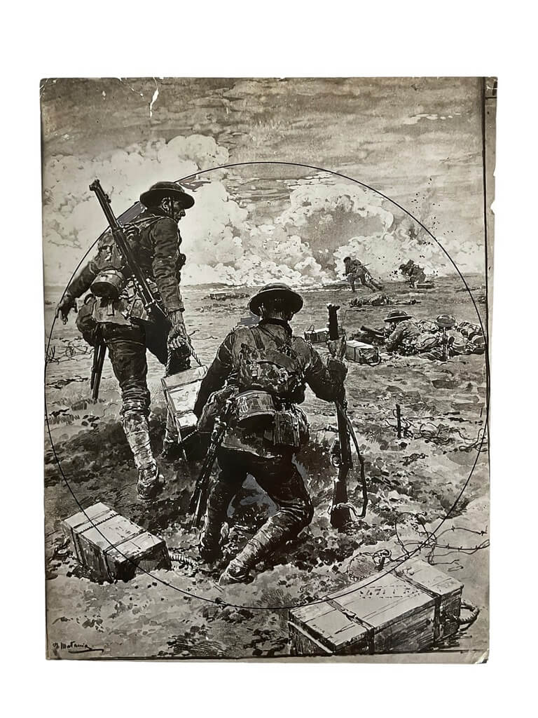 This is an original, authentic photograph measuring 8 1/2″ X 6 1/2″. It features a WW1 British BEF (British Expeditionary Force) ammunition carrier, offering a vivid glimpse into the harsh realities of the First World War. The image has been pressed onto high-quality photographic paper, preserving it for over a century. The clarity of the photo is remarkable, capturing the grit and resolve of the soldiers as they transport ammunition in the midst of war. Despite its age, the photograph is in excellent condition, showcasing the intricate details and nuances of this historical moment. This piece represents a striking piece of military history, a testament to the strength and bravery of the British BEF during World War I. It serves as a powerful reminder of the sacrifices made during one of the most challenging periods in history. Ideal for collectors, historians, or anyone with an interest in military history.