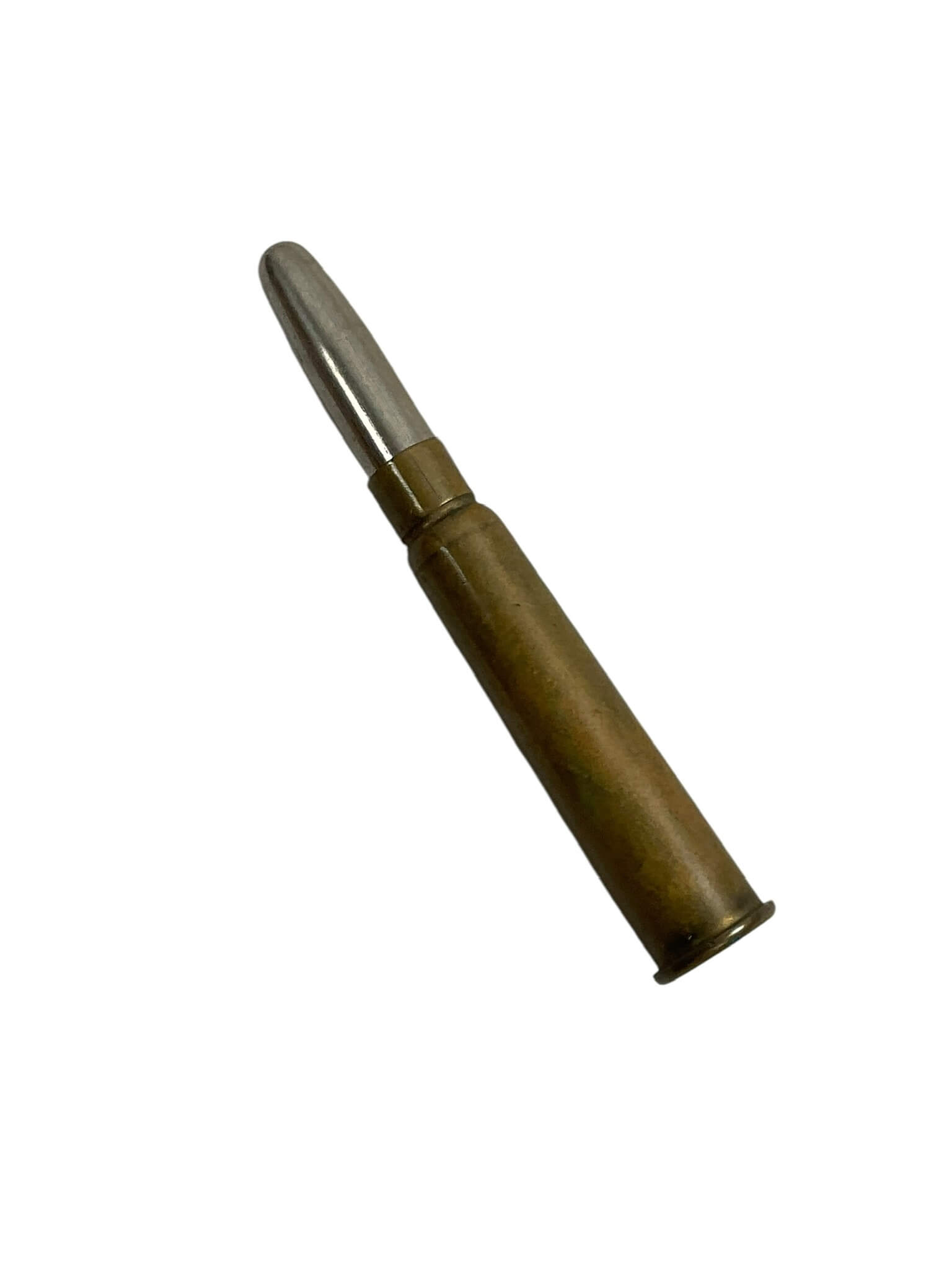 The WW1 British BEF Bullet Pencil is an artifact associated with British forces during the First World War. These bullet pencils were typically created from spent cartridge cases, often .303 British, with a pencil core fitted inside and a cap fashioned from a bullet or a reproduction thereof. Issued or acquired by British Expeditionary Force (BEF) soldiers, bullet pencils served as functional writing implements in the field, combining resourcefulness and practicality amid wartime conditions. The item’s compact size made it easy to carry in a pocket or kit, while its construction from cartridge components reflects the adaptation of military materials for everyday use by servicemen. Many examples from the period may include minor markings or engraved initials, though these features vary. Bullet pencils remain of interest to collectors of military memorabilia for their connection to trench life and personal equipment carried by British troops during the Great War. Please note this is missing the pencil.