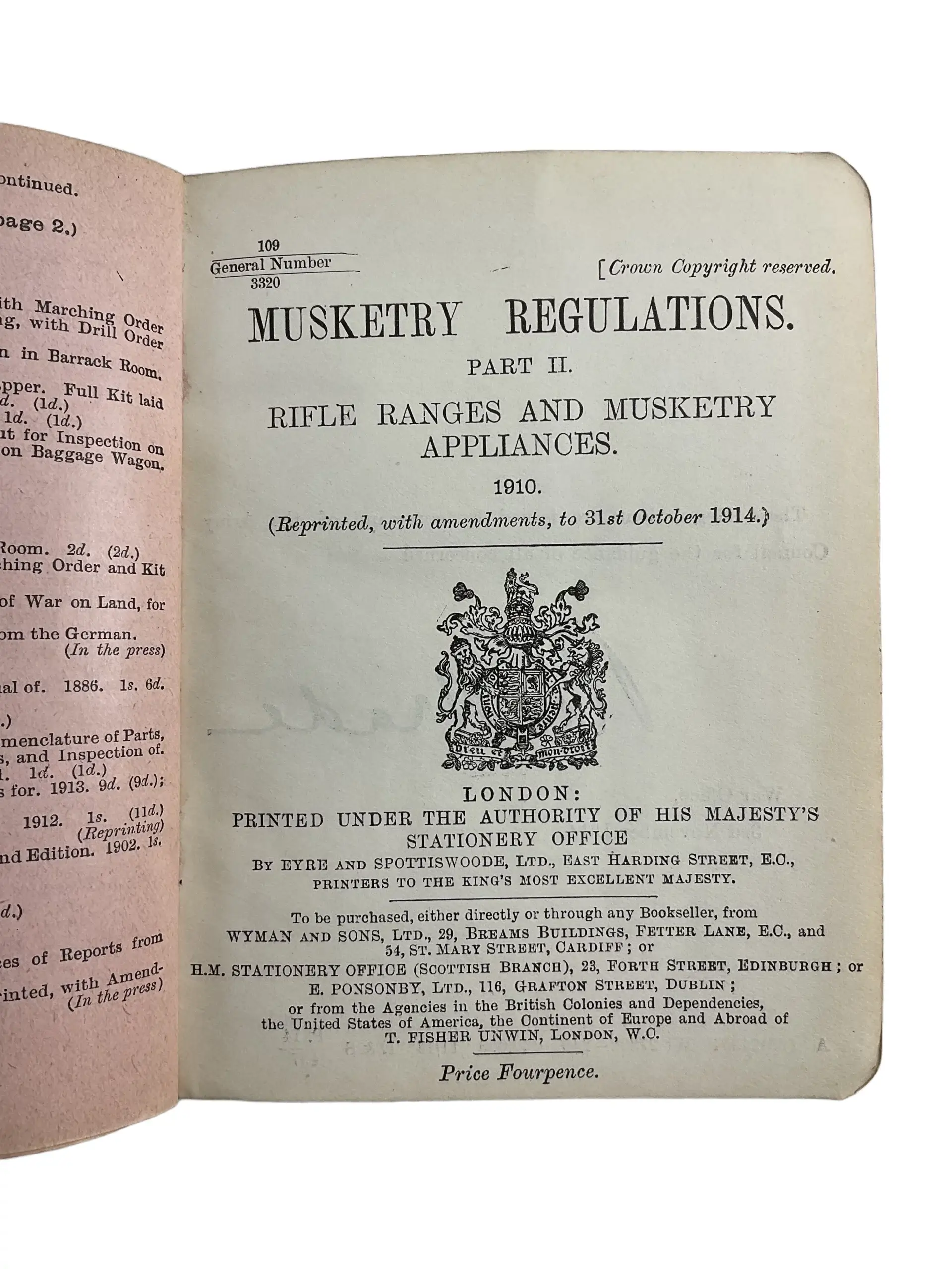 The WW1 British BEF Musketry Regulations Part 2 Manual, dated 1910, is a hardcover reference book originally issued to the British Expeditionary Force before and during the First World War. This manual outlines the military standards and procedures for musketry, detailing training methods, operational guidelines, and firearm handling specific to the period. The content covers drills, aiming techniques, range exercises, and maintenance routines, reflecting British Army doctrine on marksmanship and small arms use in the early 20th century. Used by officers and soldiers alike, the manual played a central role in standardizing instruction across the ranks. The 1910 edition provides valuable insight into pre-war military practices and forms an important part of British military regulatory literature. This used copy features period binding and exhibits signs of wear consistent with age and use. It serves as a resource for researchers, historians, and collectors interested in early 20th-century military training and doctrine.