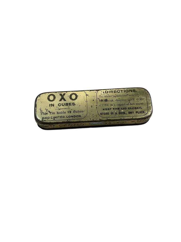 The WW1 British BEF OXO In Cubes Tin EMPTY 4 is a vintage collector’s item. It is an empty tin that was once filled with OXO cubes, a type of beef stock, issued to British Expeditionary Force soldiers during World War I. The tin shows a distressed, authentic patina indicative of its historical significance.