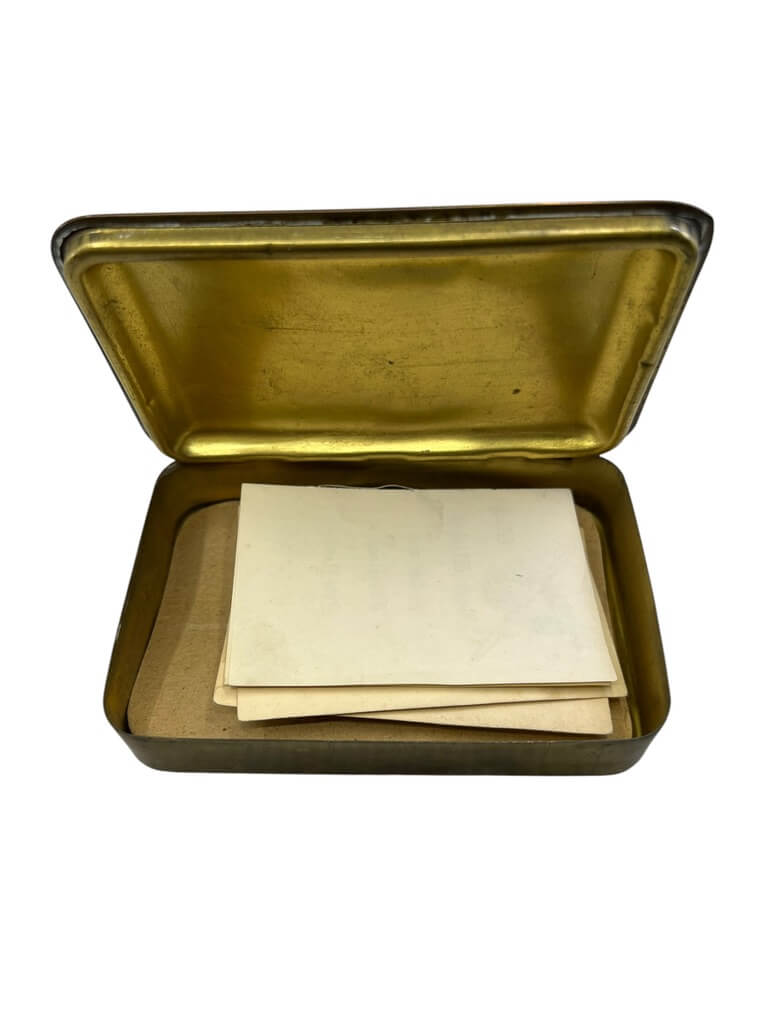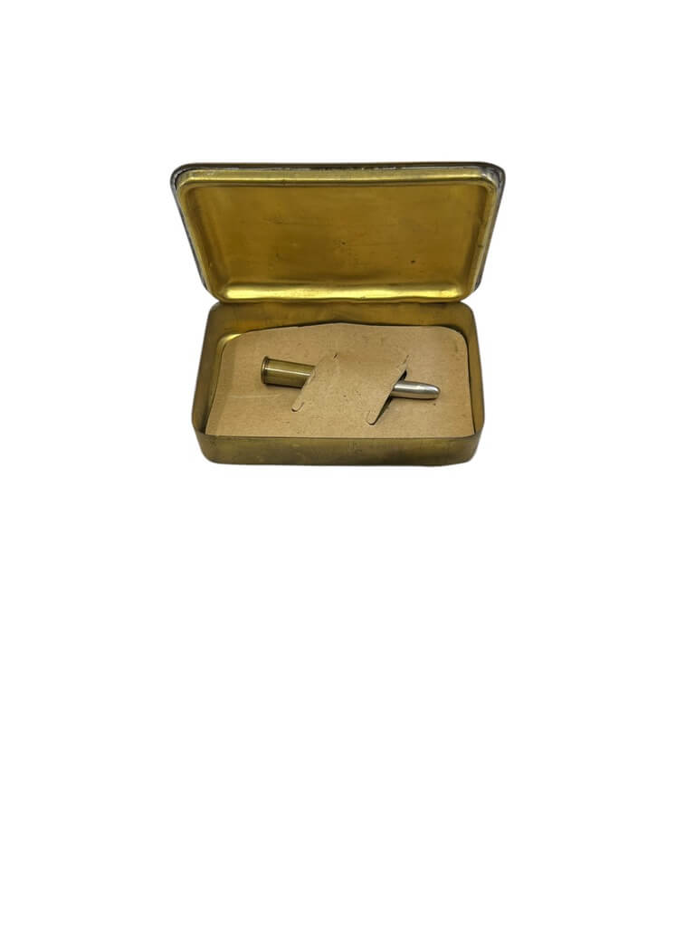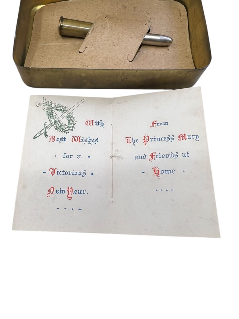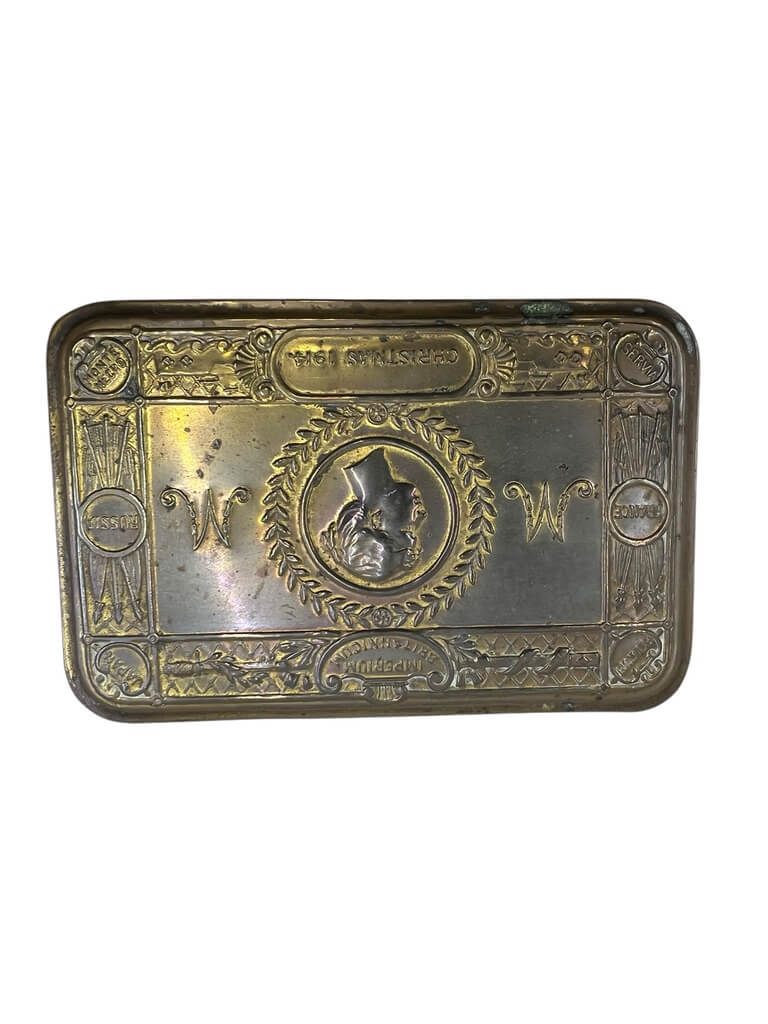 This item is a rare piece of WW1 history, a British BEF Princess Mary Tin with Pencil, dated from 1914. The British Expeditionary Force (BEF) was the initial British force deployed during the First World War. The tin, named after Princess Mary, the daughter of King George V and Queen Mary, was part of a morale-boosting initiative she championed. These tins were filled with various items like tobacco, chocolate, and pencils and sent to all British soldiers and sailors as a Christmas gift during the first year of the war. This particular item not only includes the tin, but also the original pencil inside, both in good condition. The tin features an embossed profile of Princess Mary on the lid. This is an exceptional piece of military memorabilia, reflecting a poignant moment in British history.