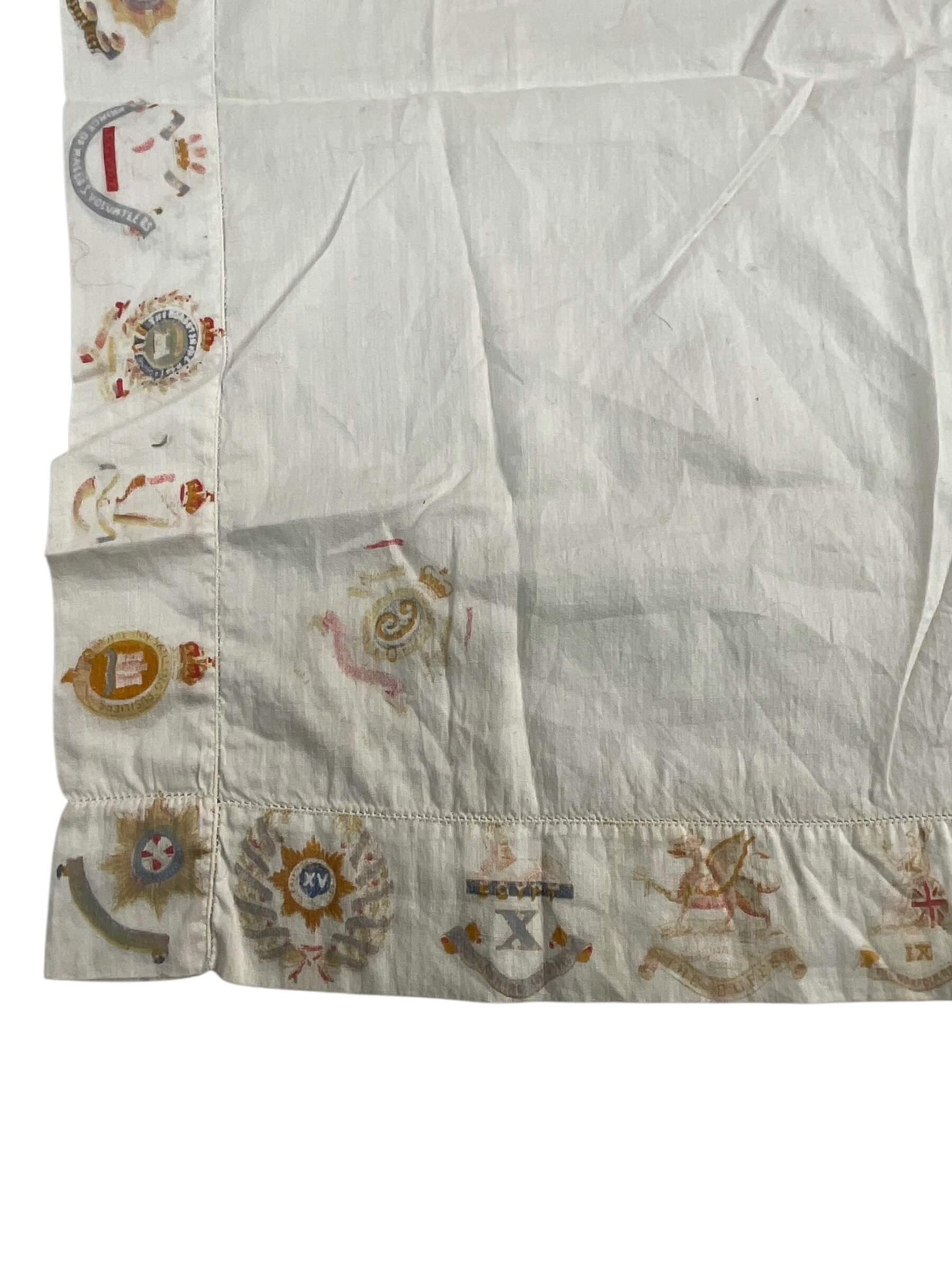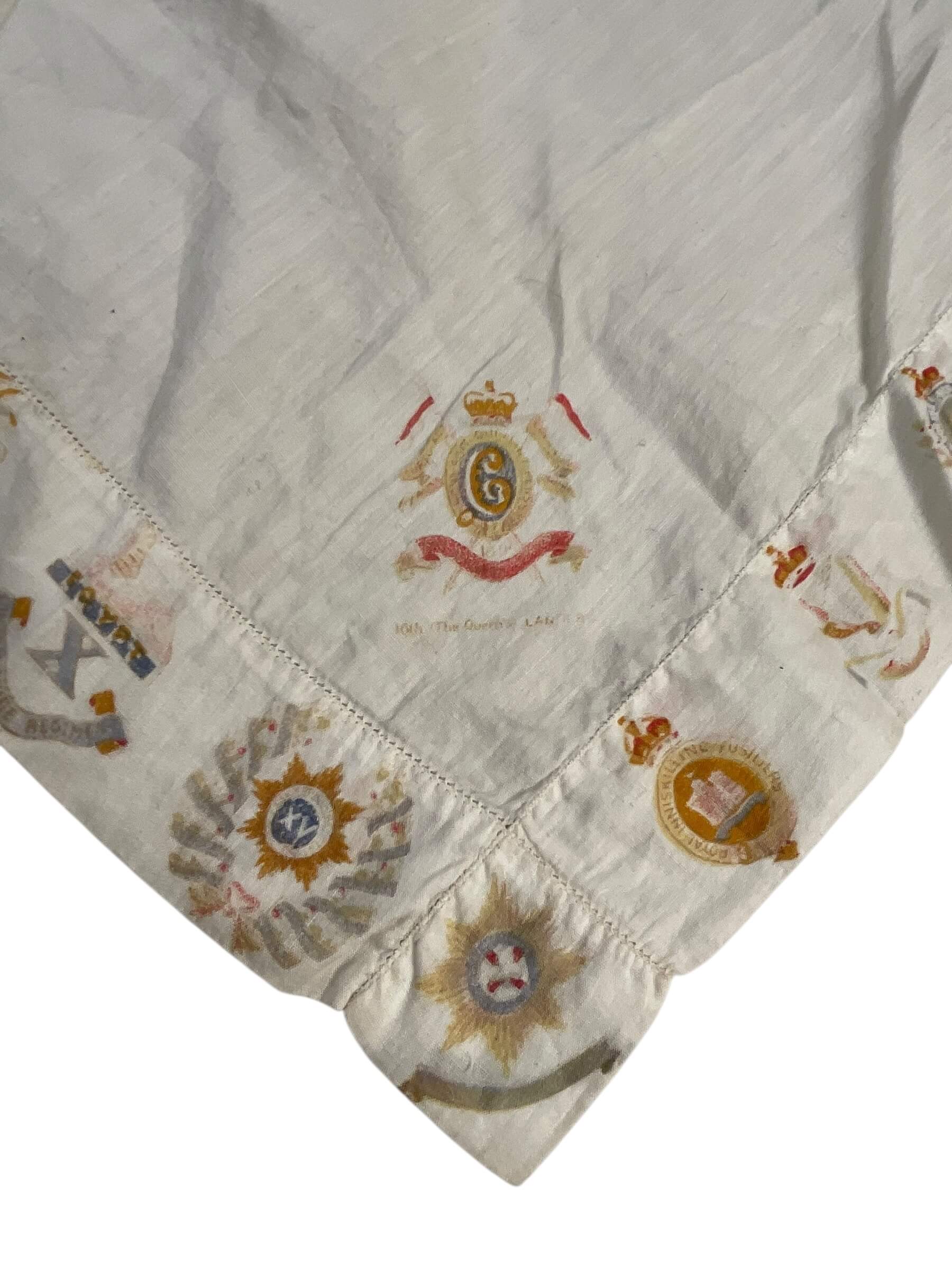 The WW1 British BEF Regimental Small Table Placemat measures approximately 19 inches by 18 inches and was utilized by British forces during the First World War. Such placemats were typically used in officers’ messes or field environments by members of the British Expeditionary Force (BEF). Crafted from durable textiles suitable for repeated use, these mats often featured regimental insignia or patterns specific to certain units, serving both functional and identification purposes. The placemat provided a practical barrier for protecting surfaces from utensils and food during meals. Examples from this period reflect the broader practices of the British Army concerning organization, regiment cohesion, and field accommodations. The dimensions and appearance of individual placemats might vary slightly based on issue and manufacturer. This item represents an aspect of daily military life, illustrating the measures taken to maintain order, cleanliness, and morale even in wartime conditions.