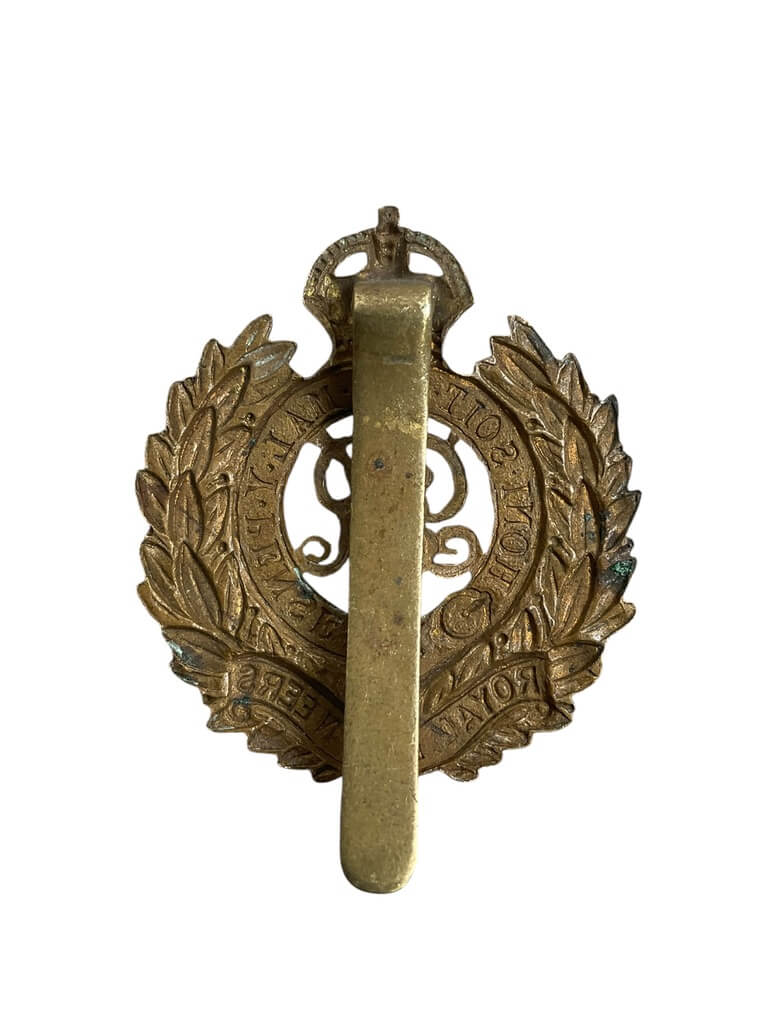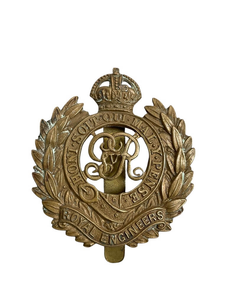 This WW1 British BEF Royal Engineers Cap Badge is a precious symbol of history and military heritage, representing the British Expeditionary Force’s Royal Engineers. Crafted in the intense period of the First World War, it bears the emblem of the Royal Engineers, signifying their pivotal role in warfare. The badge features the George Rex (GR) insignia, representative of King George V’s reign. Its distinct design has the Royal Crown at the top, the regiment’s motto “Ubique” (Everywhere) and “Quo Fas Et Gloria Ducunt” (Where Right And Glory Lead) at the bottom. Made of high-quality metal, it was worn on the military cap as a badge of honor and recognition, signifying the wearer’s affiliation to the esteemed Royal Engineers. Collectors and history enthusiasts alike would appreciate this artifact for its historical significance and the unparalleled craftsmanship of the bygone era.