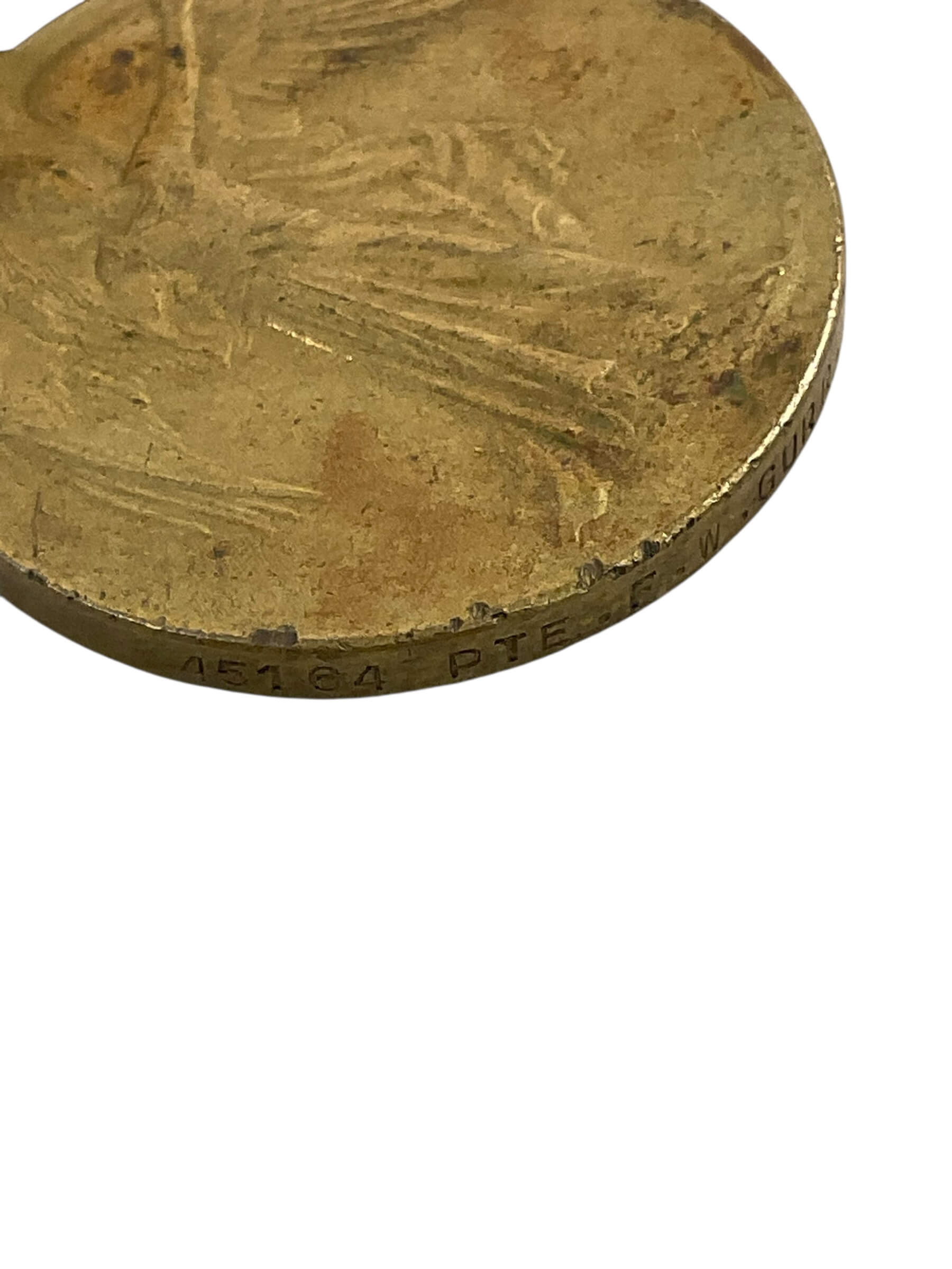 The WW1 British BEF Victory Medal, named to 45164 Private F.W. Gurr of the Loyal Lancashire Regiment, is a full-size campaign medal awarded to those who served in the British and Imperial forces during the First World War. Instituted in 1919, the Victory Medal was issued alongside the British War Medal to commemorate service between 5 August 1914 and 11 November
