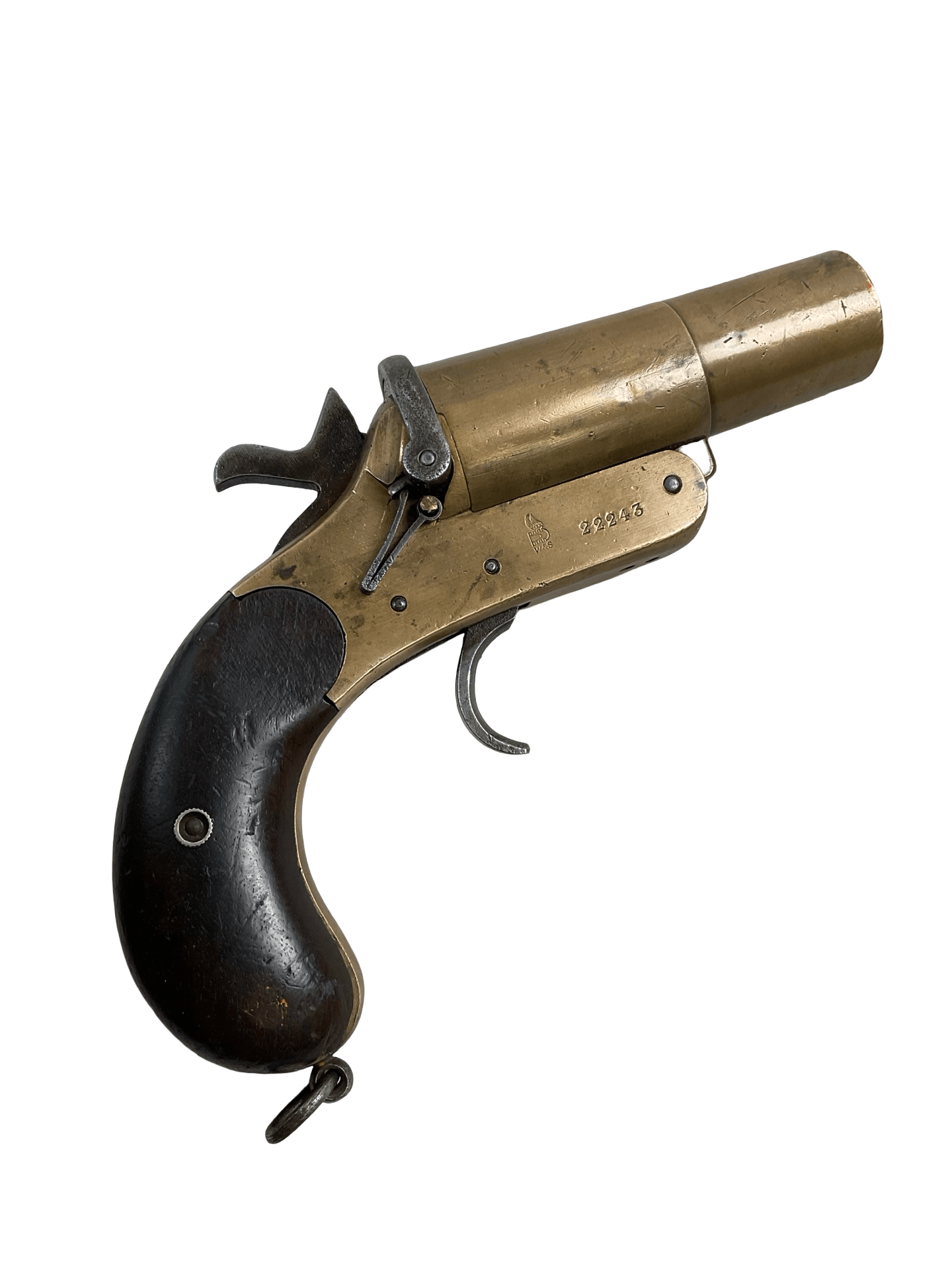 The WW1 British BEF Webley and Scott Flare Pistol, dated 1916, is an authentic example of military signaling equipment issued during the First World War. Manufactured by Webley and Scott, these pistols were widely used by the British Expeditionary Force (BEF) for communication and illumination on the battlefield. The pistol features a break-action mechanism, robust steel construction, and a single-shot design suited to firing signal flares. Original examples are distinct for their manufacturer markings, date stamp—1916 in this case—and characteristic military finish. Such pistols played a key role in trench warfare, allowing troops to send signals, call for support, or mark positions under combat conditions. Classified as an antique, this flare pistol can be owned in the United Kingdom without a firearms permit, in accordance with current legal standards. It provides significant historical insight into the material culture and practical tools employed by British forces during the First World War.
