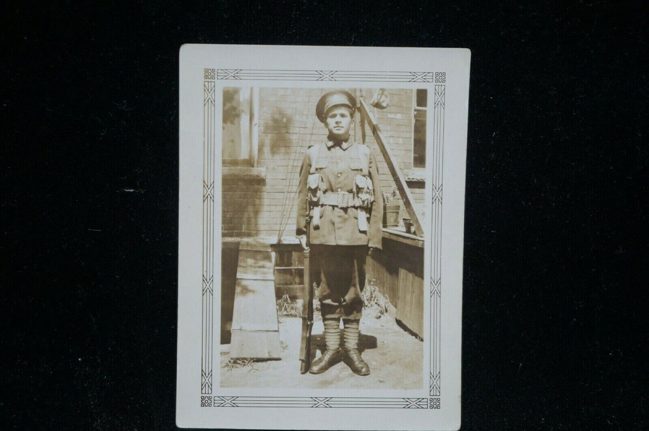 A used WW1 British Canadian BEF CEF Soldier With Rifle and Webbing Photo. Approx size is 3 x 4 inches. I am unable to make out what the cap badge is.