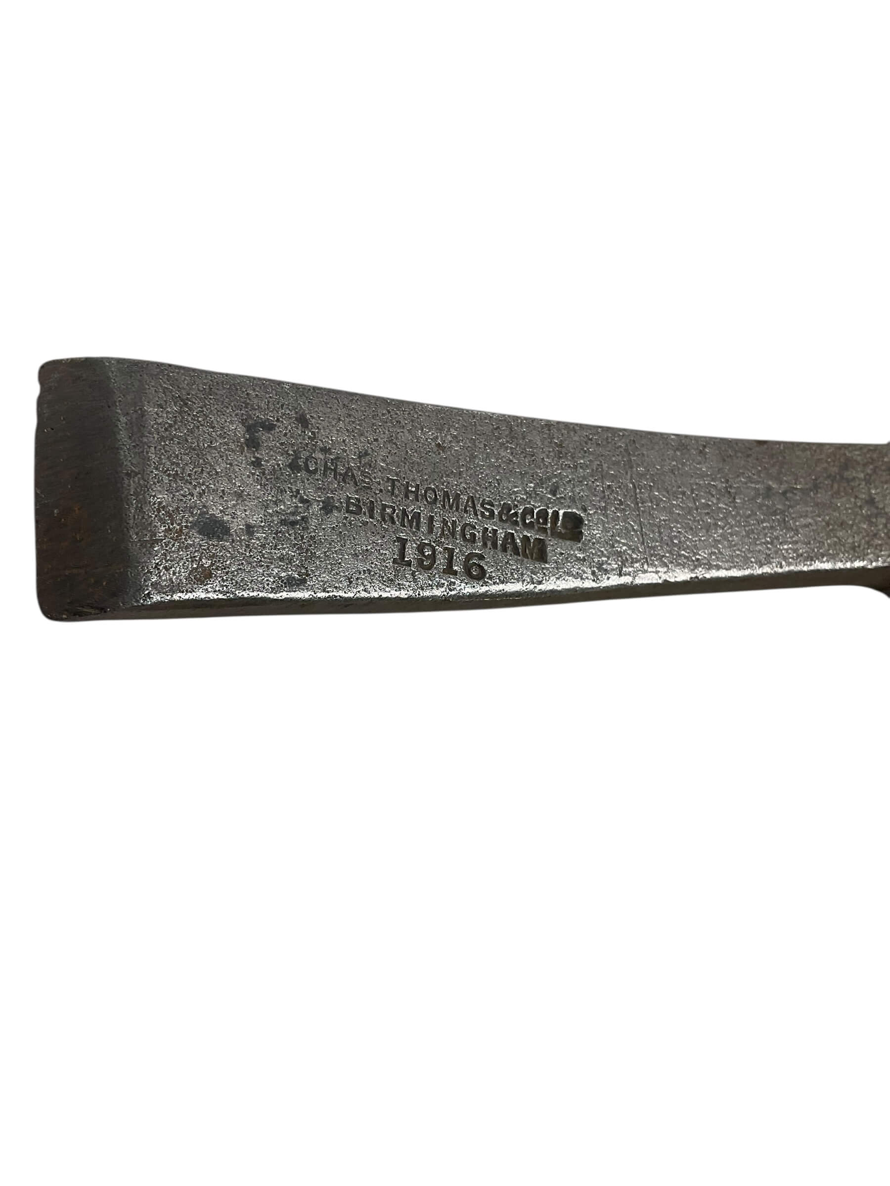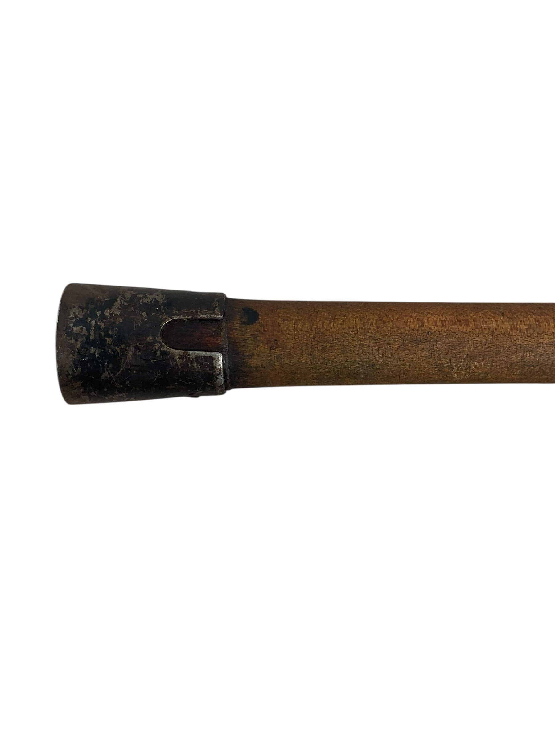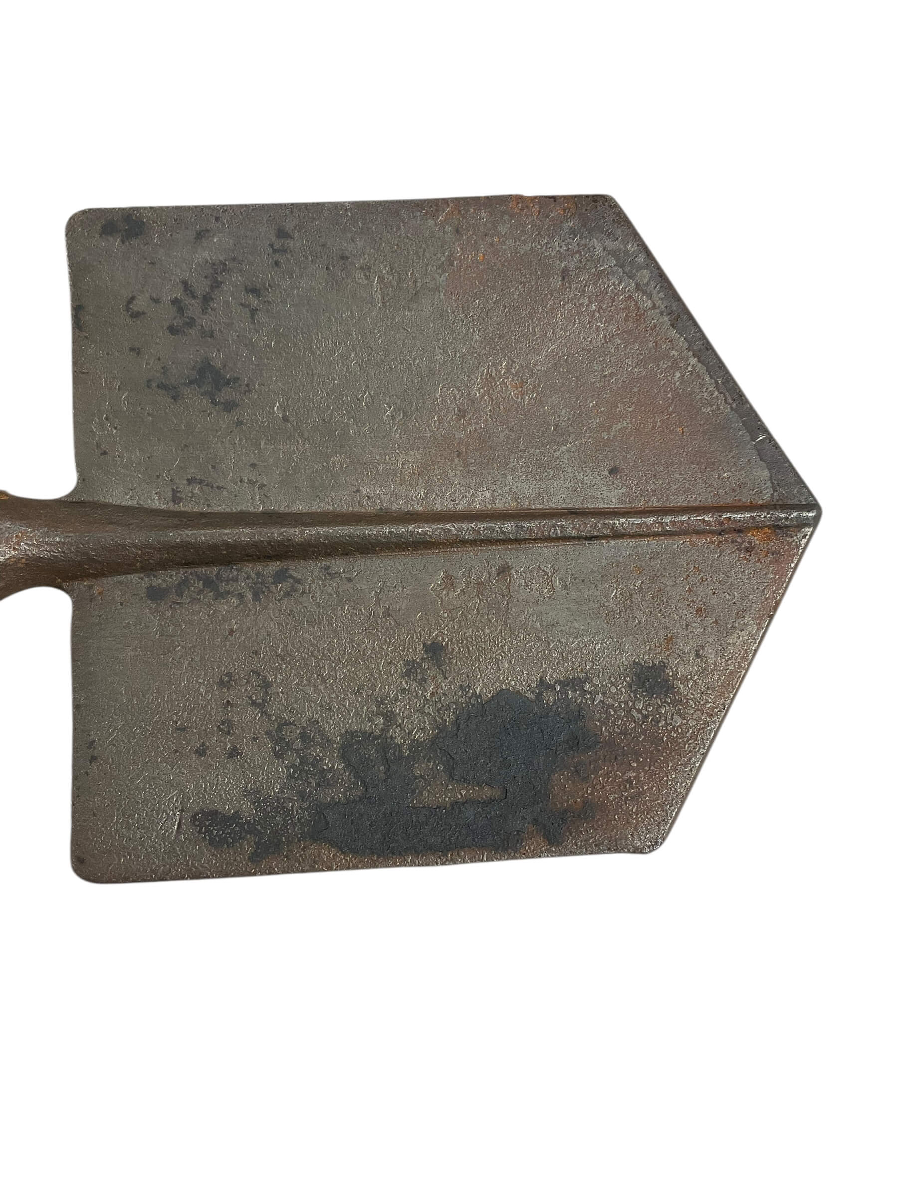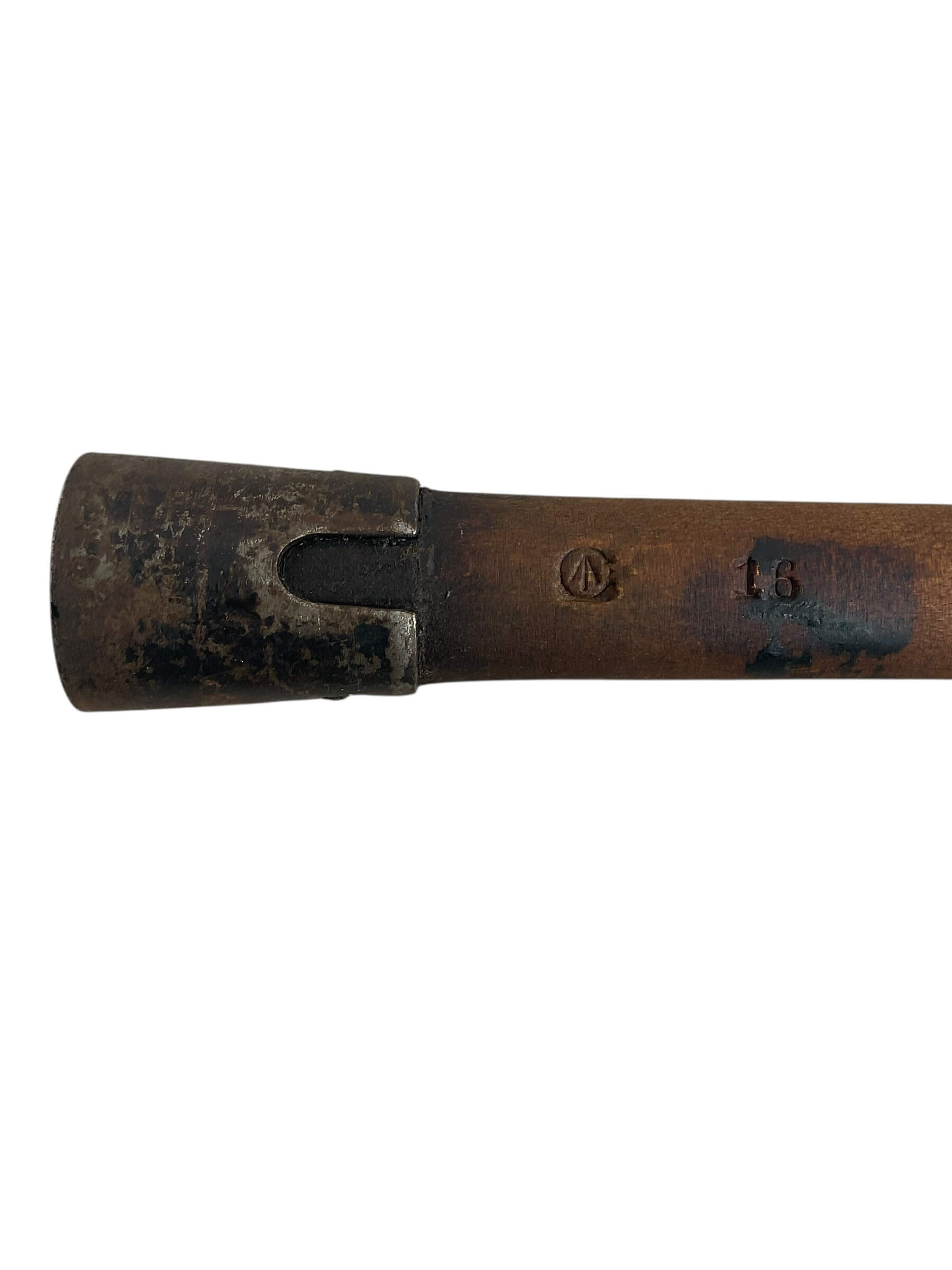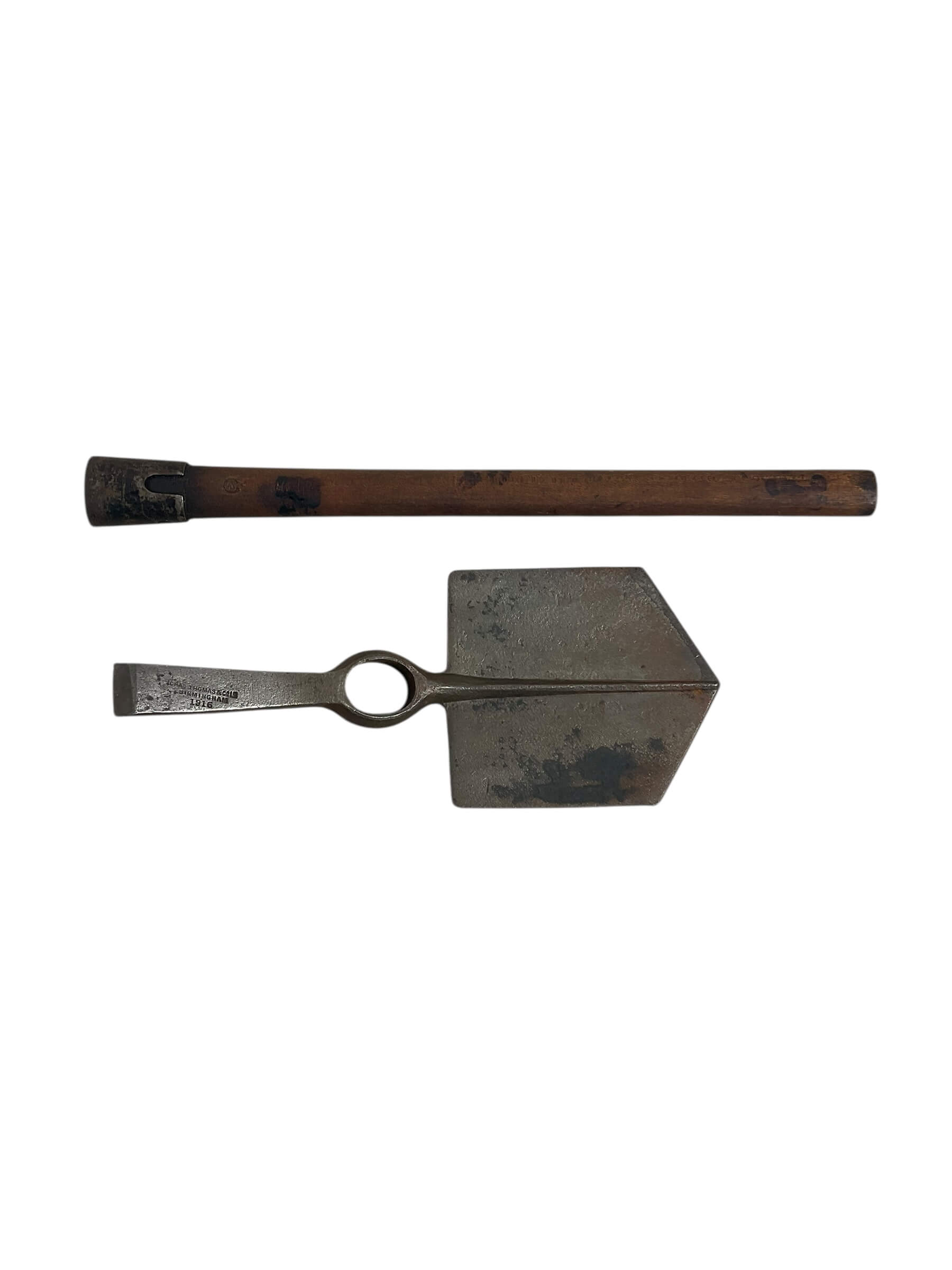 The WW1 British Canadian P08 Entrenching Tool Head and Handle is a vintage military artifact originally manufactured for the British and Canadian forces during World War I. It consists of a compact shovel head and corresponding handle, often used for trench digging. This military essential, approximately the size of a modern day gardening spade, was crafted from durable steel and wood materials to withstand harsh battlefield conditions. The P08 Entrenching tool follows the design standard of the Pattern 1908 (P08) webbing equipment, illustrating early 20th century military technology. Tools like these remain valuable for collectors, historians, and military enthusiasts. Authentic P08 entrenching tool heads and handles are identifiable through distinct manufacturing Marks and the wear patterns characteristic of usage in the field. Presence of these Marks distinguishes them from reproductions.
