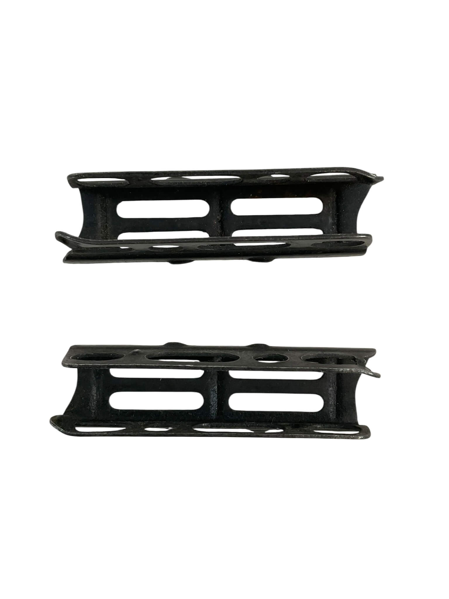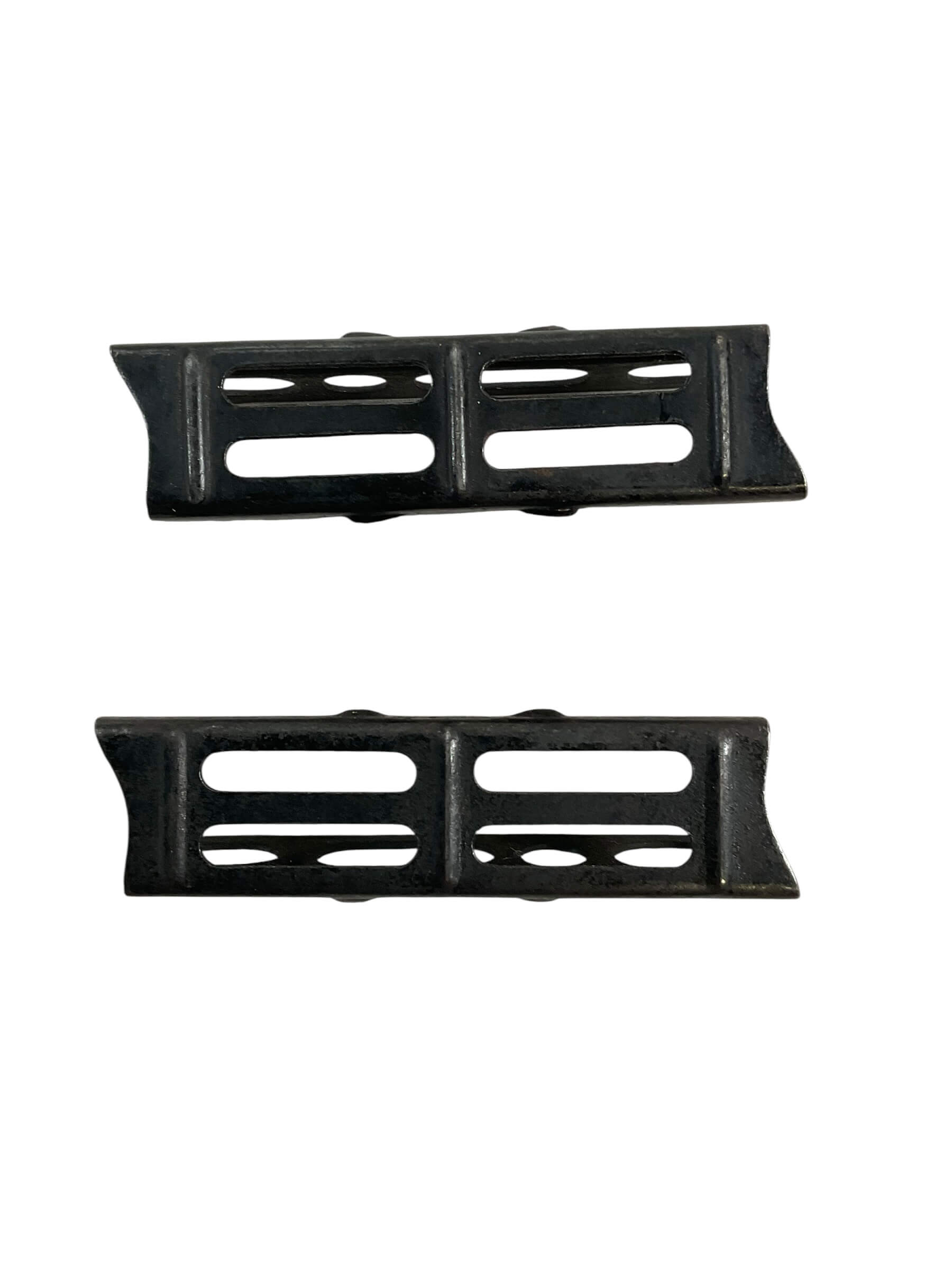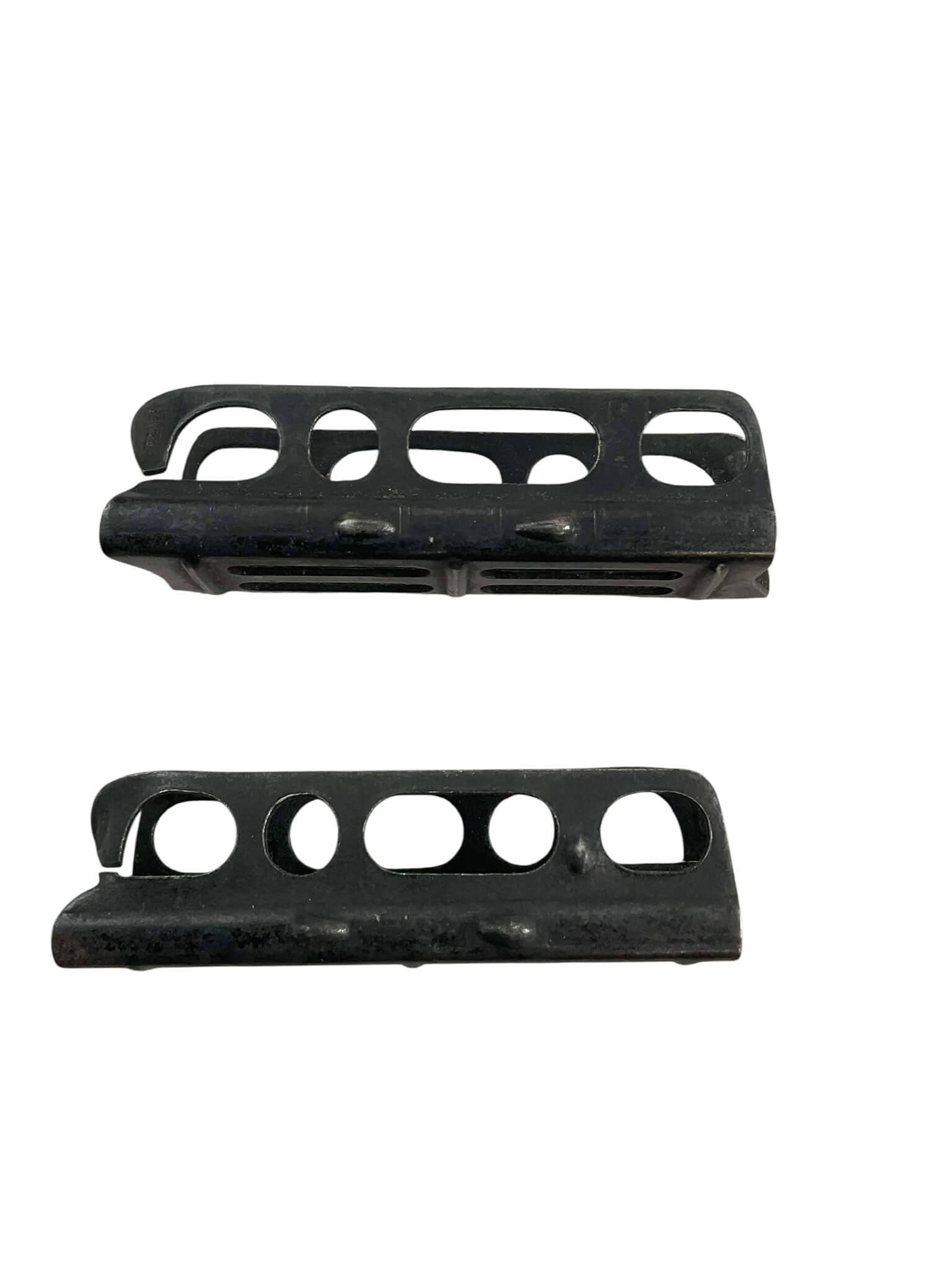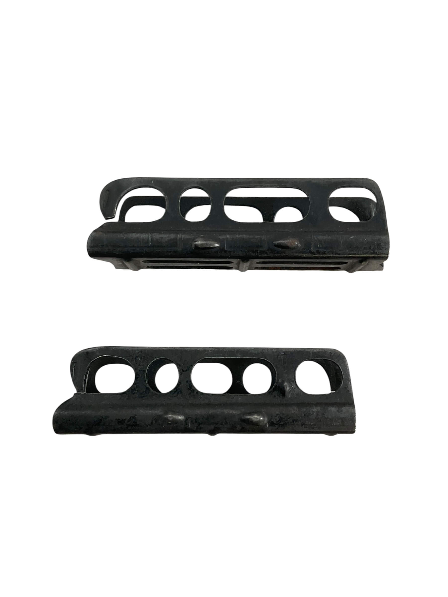 The WW1 British No 1 Mk3 .303 Stripper Clips are designed for use with the Short Magazine Lee-Enfield (SMLE) rifle series. This lot consists of two original clips, each fabricated from blued steel, intended for loading five rounds of .303 British ammunition rapidly into the rifle’s magazine. Stripper clips significantly improved reloading efficiency in combat conditions, enabling soldiers to quickly replenish their firearms during engagements. The No 1 Mk3 designation refers to the specific model of both the rifle and its compatible loading clip, widely issued to British and Commonwealth forces during the First World War. These clips exhibit characteristic construction details such as side cut-outs and spring tension to securely hold cartridges. As functional components of military small arms equipment, original stripper clips represent an important aspect of logistical support in early 20th-century infantry tactics. This set includes two authentic period examples suitable for collection or historical study.