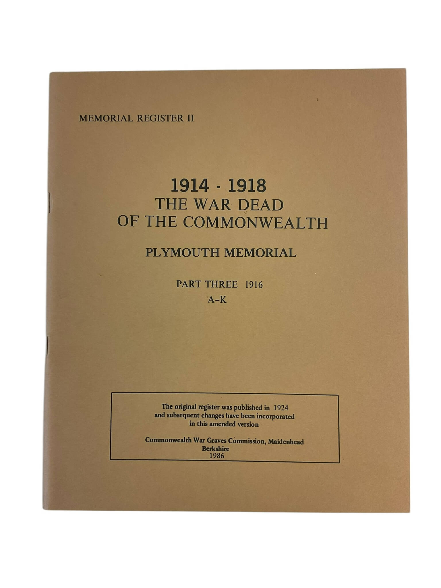 WW1 British Plymouth Memorial Part 3 1916 A-K Used Softcover Reference Book