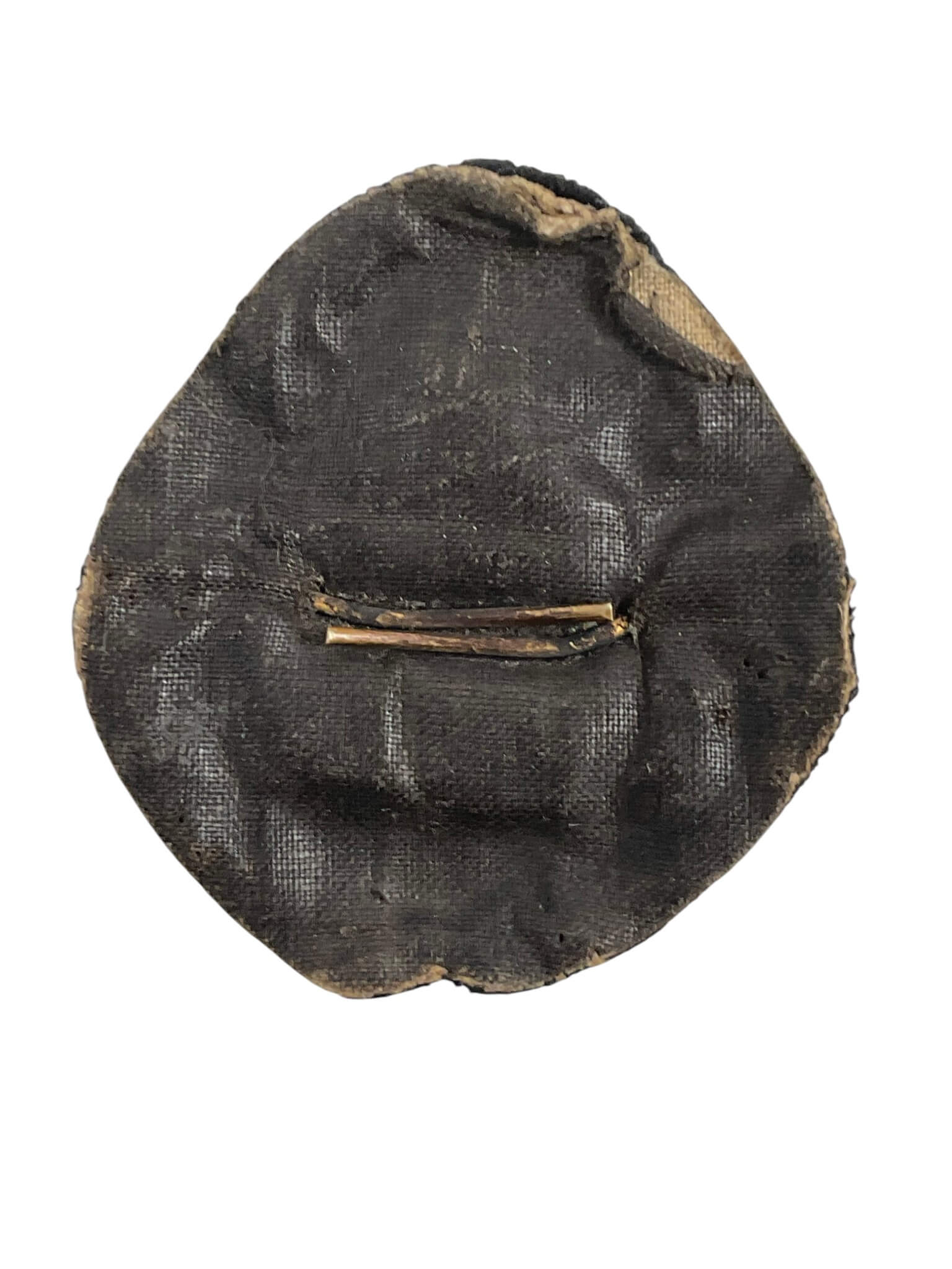 This item is a World War I era British Royal Air Force (RAF) officer’s cap badge, constructed with bullion wire. The badge features the interwoven “RAF” monogram in gilt wire at the center, surrounded by a laurel wreath of gold bullion thread. Above the central motif sits a representation of the King’s Crown, also rendered in bullion wire. The overall design is mounted on a dark blue or black fabric backing, consistent with RAF uniforms of the period. These bullion wire cap badges were worn by commissioned officers as part of the service dress cap, serving as a distinctive insignia for members of the newly established RAF, formed in 1918. The intricate wirework reflected the wearer’s rank and status. Bullion badges were hand-embroidered, leading to minor variations among examples. This badge is considered an example of British military insignia from the First World War, representing early RAF uniform standards.
