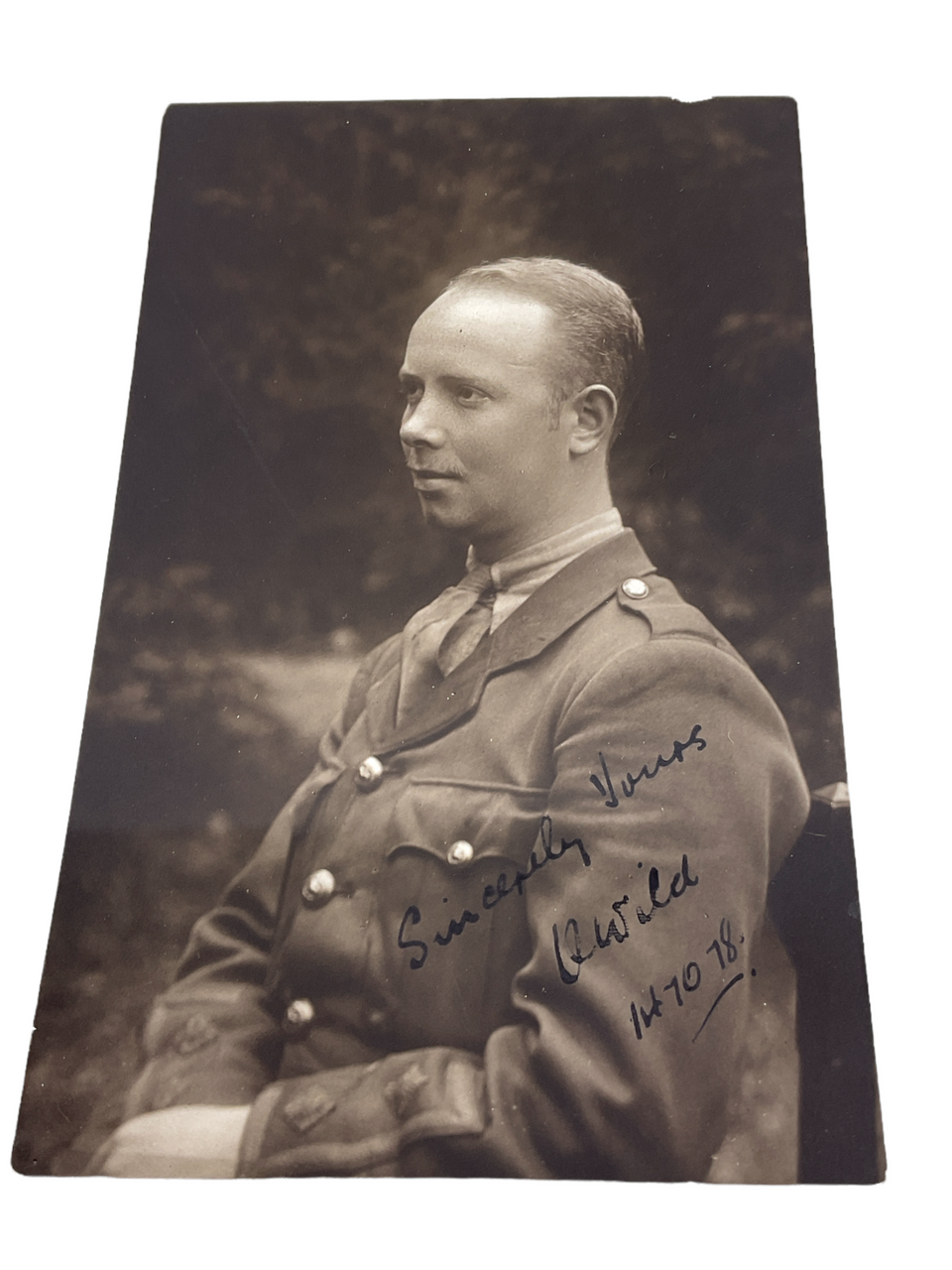The ‘WW1 British RFC POW Photo Postcard’ is a captivating piece of historical memorabilia from the First World War. This postcard features a poignant photograph of a British Royal Flying Corps (RFC) officer who was captured and held as a prisoner of war (POW) by enemy forces. The image provides a rare and intimate glimpse into the lives and experiences of those who served in the air force during WW1, highlighting the personal and often overlooked human side of the conflict. The postcard may also include handwritten messages, dates, and locations that offer further insights into the officer’s circumstances and sentiments during captivity. As both a visual record and a personal artifact, this photo postcard serves as a valuable and evocative reminder of the courage, resilience, and sacrifice of RFC personnel during one of the most challenging times in modern history. Collectors and historians alike will find this item to be an invaluable addition to their collections, shedding light on the personal stories woven into the broader tapestry of the Great War.