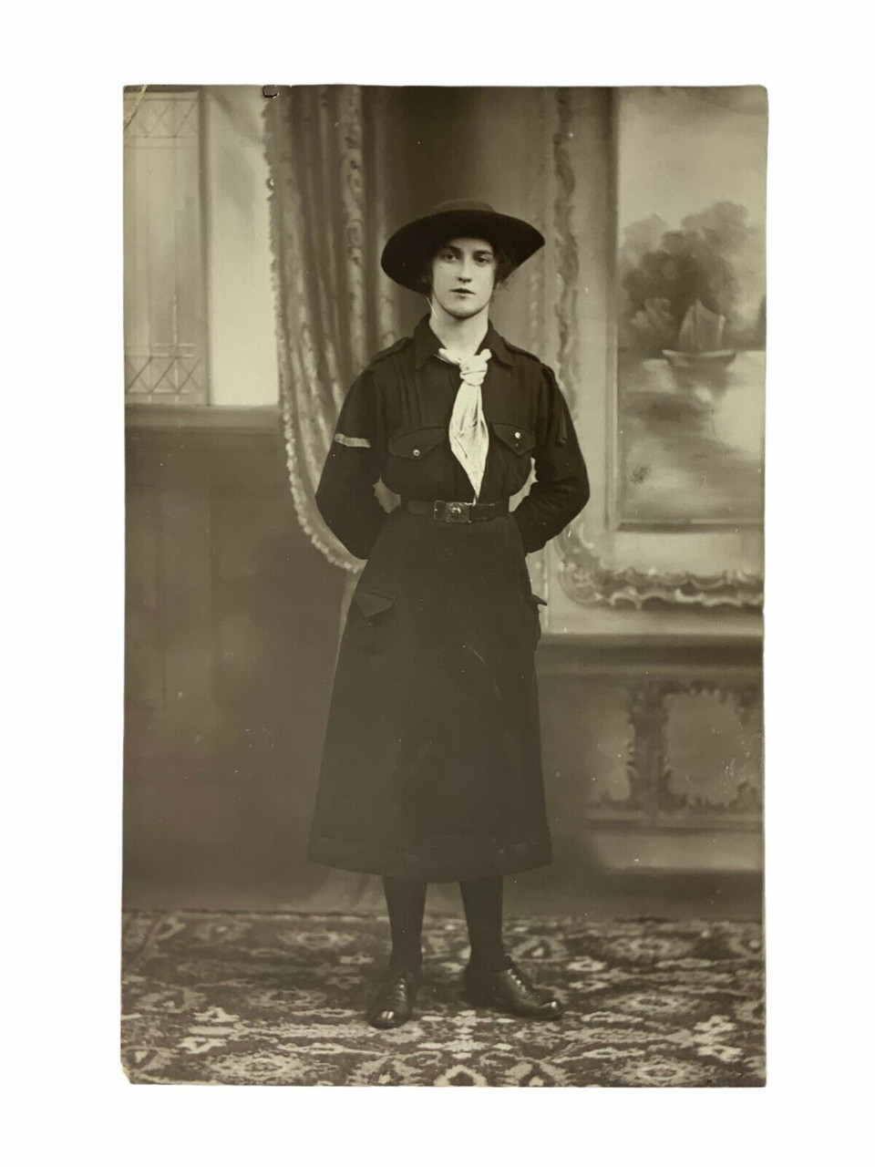 This compelling portrait photograph, measuring 5 x 3.5 inches, captures a distinguished Canadian British Scout Guide Leader during World War I in 1914. The image offers a poignant glimpse into the period, highlighting the steadfast dedication and resolute spirit of those who served their communities in the face of global conflict. The Scout Leader is impeccably dressed in a traditional uniform, complete with badges and insignia that signify his rank and achievements. The photograph not only serves as a personal memento but also as a historical artifact, reflecting the values of leadership, bravery, and service that were integral to the Scout movement during the early 20th century. A valuable addition for collectors of wartime memorabilia or those interested in the heritage of scouting, this photograph preserves a moment of history, encapsulating the essence of an era and the individuals who shaped it.