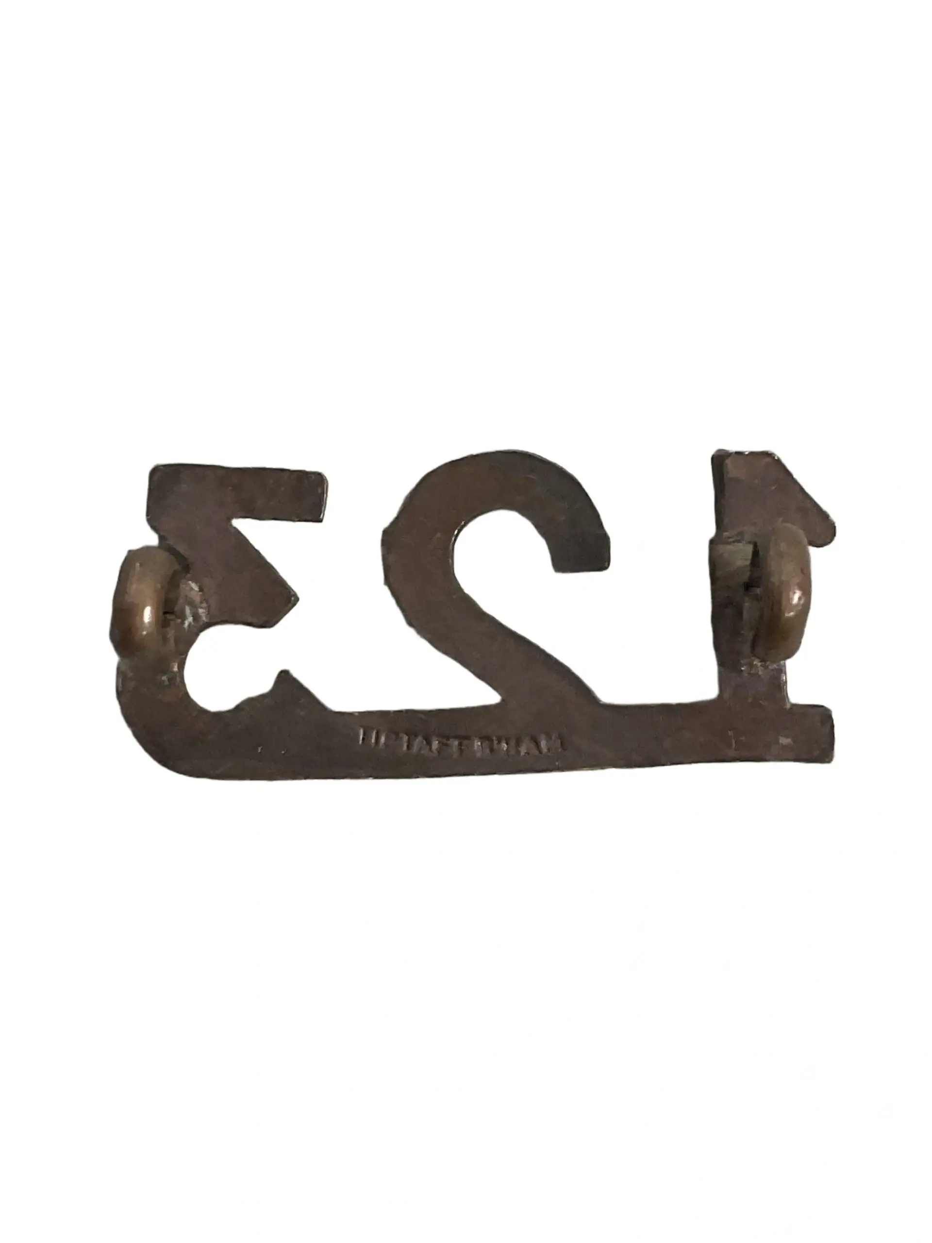 The WW1 Canadian CEF 123rd Battalion Shoulder Number Insignia Single is an original piece of military insignia used by members of the 123rd Battalion, Canadian Expeditionary Force during the First World War. Typically worn on the uniform’s epaulettes, this metal insignia features the number “123” in stamped numerals, denoting the battalion’s unique designation within the Canadian forces. Units such as the 123rd Battalion, which was formed in late 1915 and also known as the 123rd Pioneer Battalion, contributed to construction, engineering, and front-line operations on the Western Front. Shoulder titles like this were standard issue for identification and unit cohesion and helped distinguish battalions within large divisions. The insignia is made of metal, commonly brass or gilded brass, with lugs or slider fittings for attachment to the uniform. As an authentic piece, it represents the distinctive organizational structure and personal identification system of the CEF during the First World War.