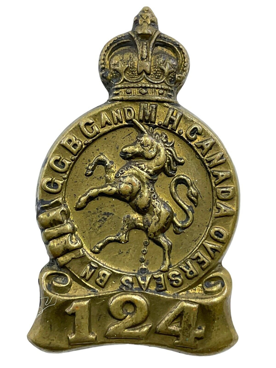 The WW1 Canadian CEF 124th Battalion Collar Insignia is a historic military artifact from the First World War. This single collar badge represents the 124th Battalion, part of the Canadian Expeditionary Force, known as the Governor General’s Body Guard. Formed in 1915, this battalion played a crucial role in the war efforts of the Allied forces. The insignia is typically made of brass or bronze and features intricate detailing that reflects the craftsmanship of the era. It often includes the battalion’s emblem, motto, and other distinctive symbols. Collectors and historians alike value such items for their historical significance and the glimpse they offer into Canada’s military heritage. This single collar insignia not only represents the bravery and commitment of the soldiers who served in the 124th Battalion but also serves as a tangible connection to the past, preserving the legacy of those who fought in WW1.