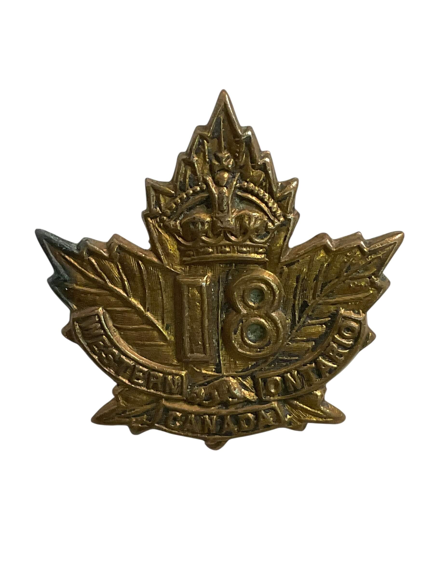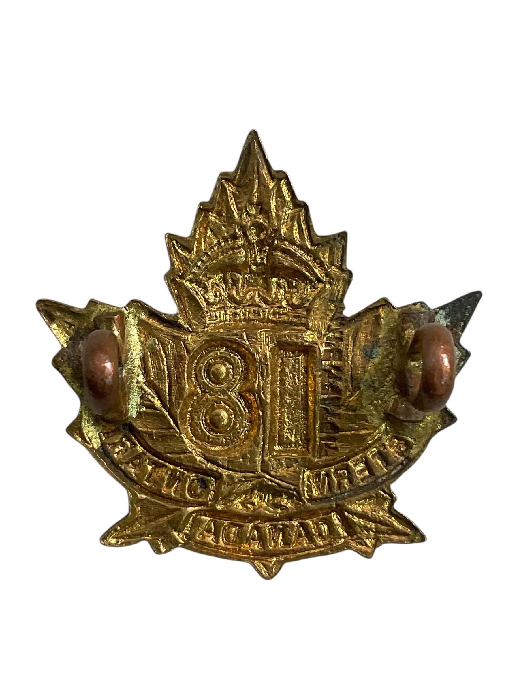 The WW1 Canadian CEF 18th Battalion Collar Insignia Single is an original military artifact from Canada’s participation in the First World War. Issued to members of the 18th Battalion, Canadian Expeditionary Force (CEF), this collar badge was part of the official regimental insignia worn on the uniform. The insignia typically features the battalion number and relevant regimental symbols, reflecting the unit’s identity. Constructed from brass or similar metals, the collar badge measures approximately 25 mm in diameter and has lugs or pins to attach it securely to the collar of the service dress. The 18th Battalion was an infantry unit raised in Ontario and engaged in major battles throughout the war. Collar badges such as this one served both practical and symbolic purposes, denoting regimental affiliation and fostering unit pride. This single example would have been part of a pair, with one worn on each side of the collar by a battalion member.