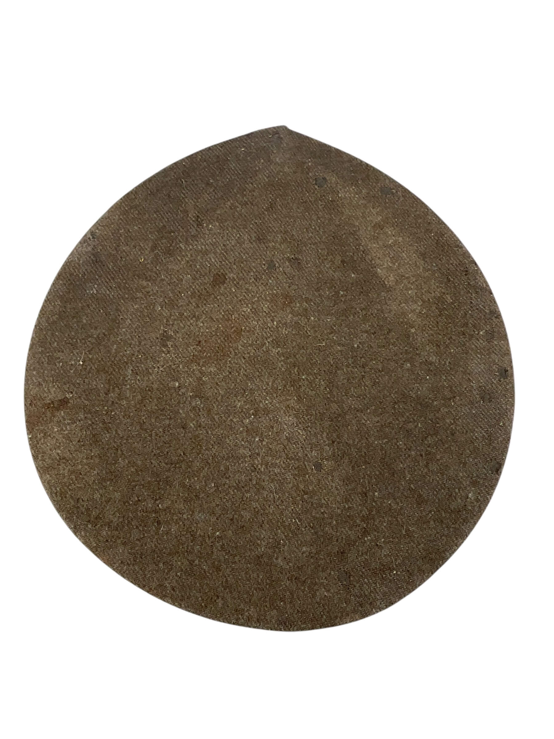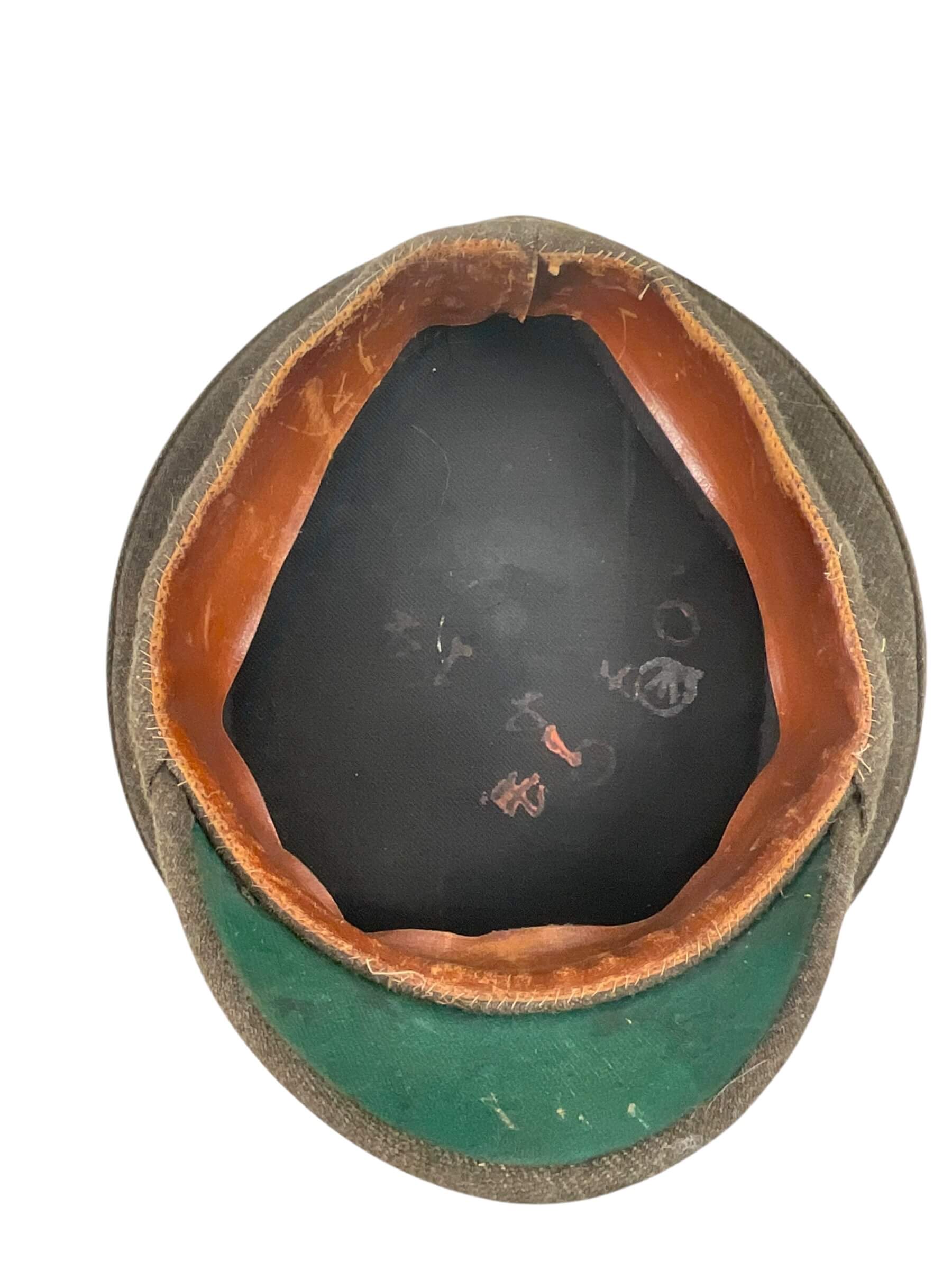 The WW1 Canadian CEF 1902 Pattern Other Ranks Peak Cap is a standard issue headgear item worn by non-commissioned personnel of the Canadian Expeditionary Force during the First World War. The cap is constructed from khaki wool serge, featuring a stiffened peak and a leather sweatband. Its design follows the 1902 British pattern adopted by Commonwealth forces, characterized by a rounded crown, six-panel construction, and a prominent front peak. Ventilation is provided by a pair of small brass eyelets on each side. The cap badge and chin strap, common to this type, are not present, with this item missing its original chin strap. The hat is marked as size 7, indicating its fitted circumference. Such caps were standard field and walking-out wear for Canadian soldiers throughout the conflict and into the early postwar years. This artifact offers insight into the standard issue equipment of Canadian other ranks during the Great War.