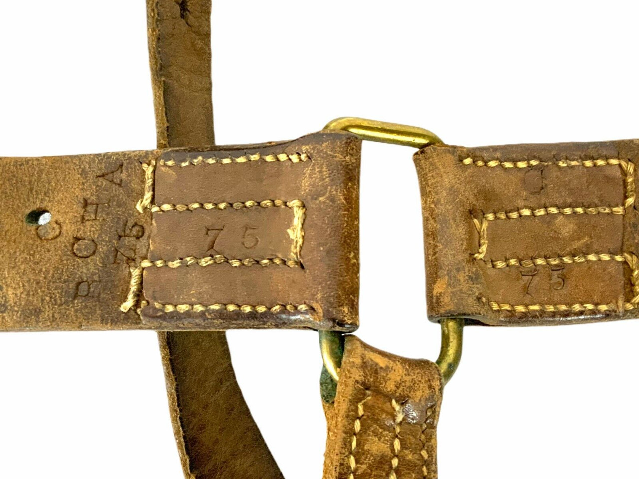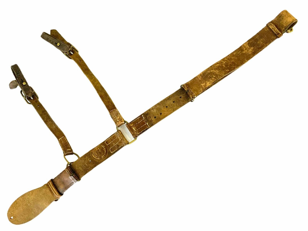 This historic World War I artifact is a Canadian Expeditionary Force (CEF) officer’s leather belt and sword hangers set, dated 1917. Measuring 33 inches in length, the belt is crafted from durable leather, exhibiting the wear and character typical of items from this era. The set retains its original markings, including “PLDG” and “RCHA,” signifying its affiliation with the Princess Louise Dragoon Guards and the Royal Canadian Horse Artillery, respectively. These markings add to the item’s historical significance, offering a tangible connection to Canadian military history. Ideal for collectors and history enthusiasts, this well-preserved set provides a vivid insight into the equipment used by Canadian officers during one of the most pivotal conflicts of the 20th century.