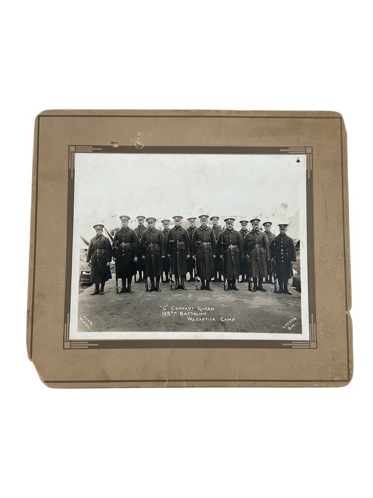 The WW1 Canadian CEF 199th Battalion C Company Photograph Valcartier is a historical item, sized at 12″ X 13 1/4″. It features the Canadian Expeditionary Force’s Battalion C Company in Valcartier, from WW1 era. This pristine photograph showcases the soldiers in uniform, providing a distinct look into Canada’s military past. Authentic, not a reproduction.