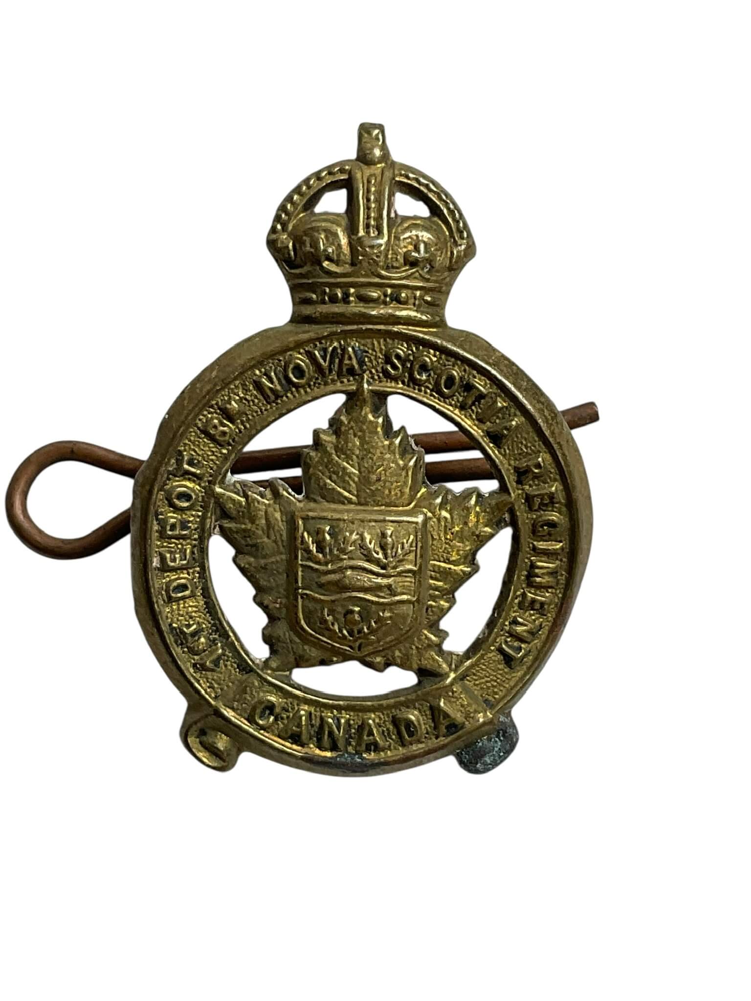 This item is a unique piece of military history: a WW1 Canadian CEF 1st Depot Battalion Nova Scotia Regiment Collar Insignia Single. This insignia belonged to the Canadian Expeditionary Force, specifically the 1st Depot Battalion from Nova Scotia. The battalion was an integral part of Canada’s overseas forces during the First World War, providing reinforcements for the Canadian Corps. The collar insignia is a distinctive emblem that would have been worn on the uniform of soldiers in this battalion, symbolizing their affiliation and commitment. Its design includes specific references to the Nova Scotia Regiment, making it a rare find for collectors. This single insignia is not just a military relic, but also a direct link to the past, allowing us to remember the brave soldiers who served in the Great War.