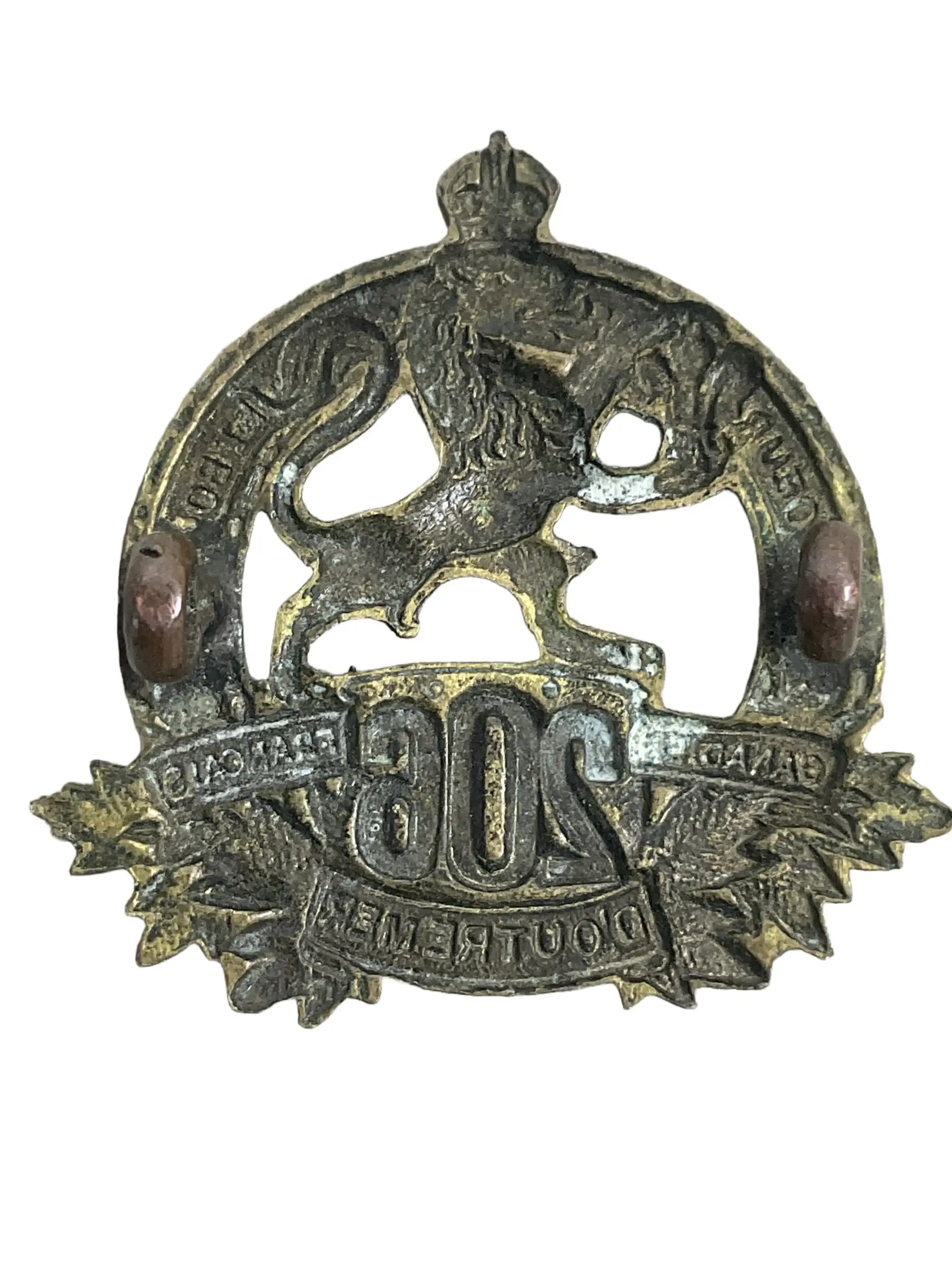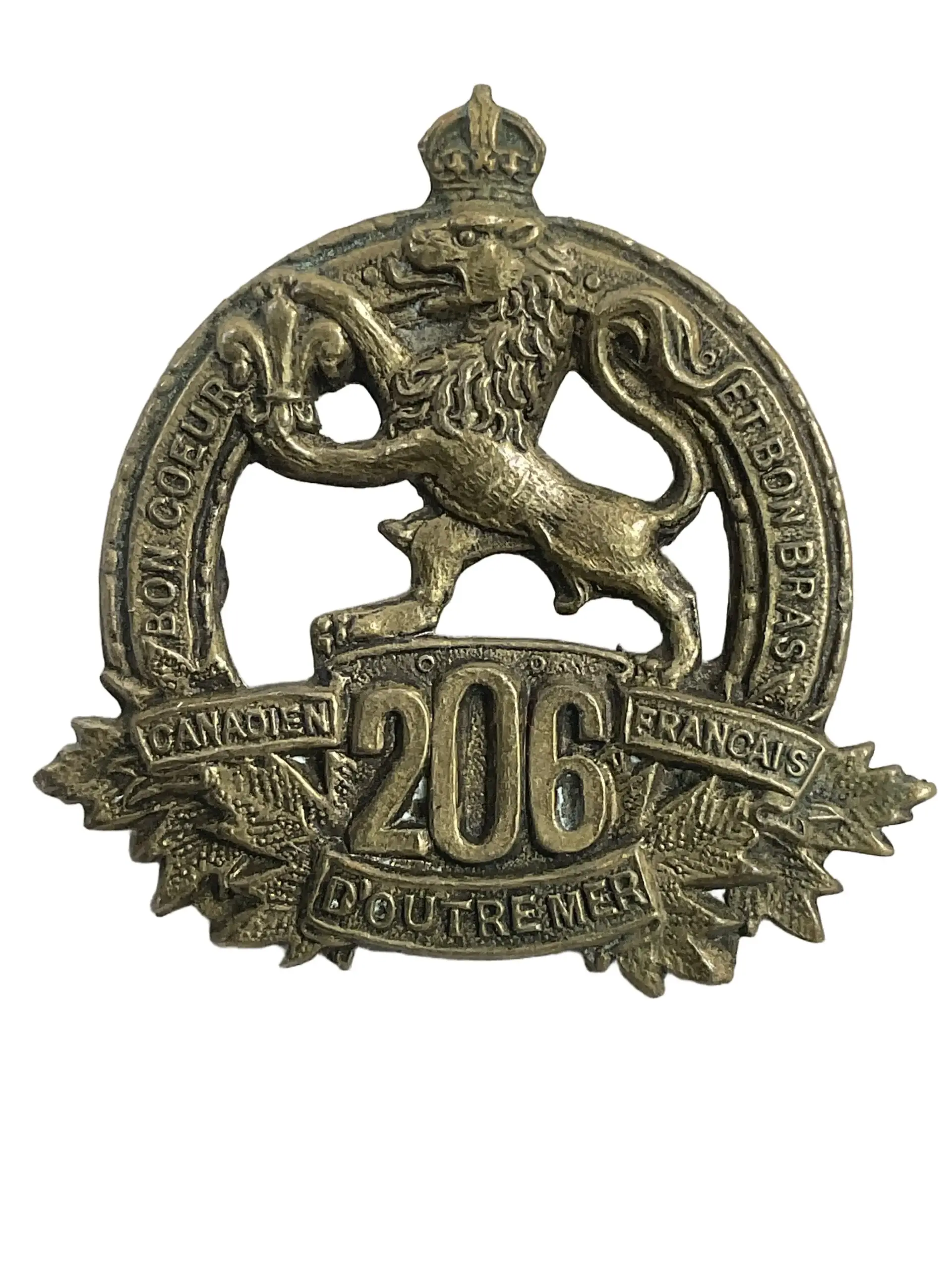 The WW1 Canadian CEF 206th Battalion Collar Insignia is a single original badge issued to members of the 206th (Canadien-Français) Battalion, part of the Canadian Expeditionary Force during the First World War. The 206th Battalion was based in Montreal, Quebec, and began recruiting in the winter of 1915-16, primarily drawing its members from French-Canadian communities in the region. The collar insignia typically features a maple leaf motif, with the battalion number “206” and relevant regimental details incorporated into the design, and was worn on the uniform collar to denote unit affiliation. Constructed from brass, the badge was used to distinguish personnel of the 206th within the broader context of the CEF. Although the 206th Battalion was absorbed into the 23rd Reserve Battalion upon arriving in England in 1917, collar insignia from this unit remain representative artifacts of Canada’s military involvement in the Great War.