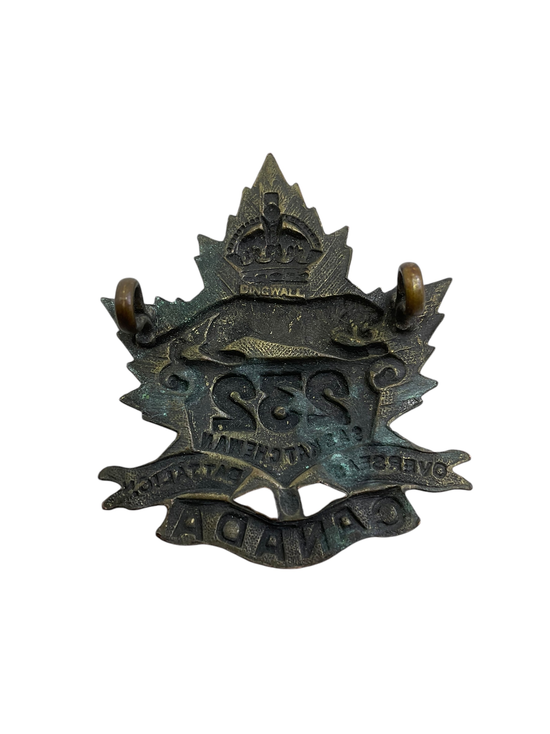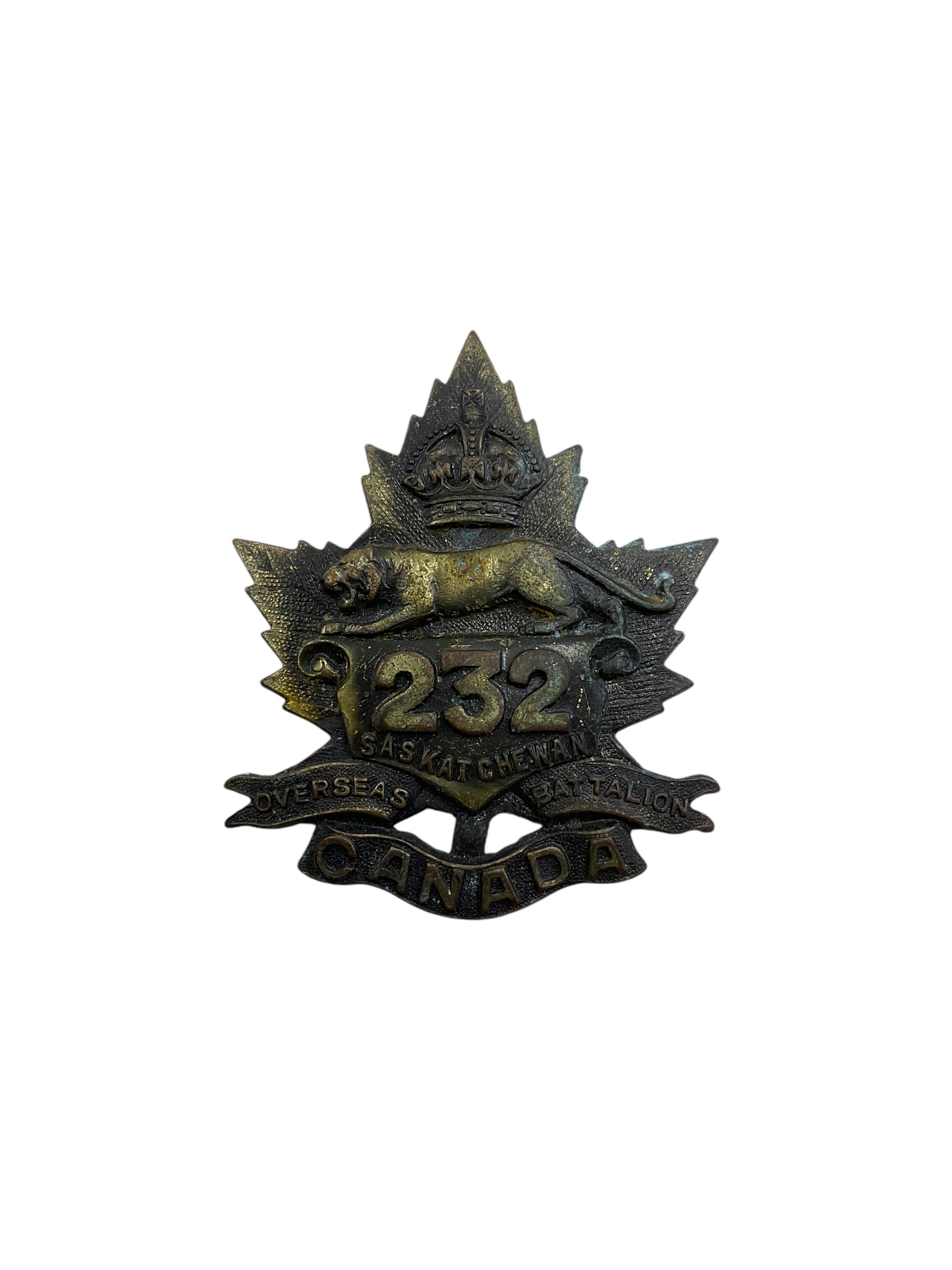 This WW1 Canadian CEF 232nd Battalion Cap Badge is a remarkable piece of military history. It belonged to the Canadian Expeditionary Force’s 232nd Battalion, which served with distinction during the First World War. Crafted from brass, this badge features the iconic Canadian maple leaf design, with the battalion number ‘232’ prominently displayed. A crown sits atop the badge symbolizing loyalty to the monarchy. The badge is in excellent condition, retaining its original lugs on the back for secure attachment to a cap. This unique piece is not only a symbol of Canadian pride and military heritage, but it also offers a tangible connection to the brave soldiers who served in one of the most significant global events of the 20th century. It’s a must-have for military collectors or history enthusiasts.