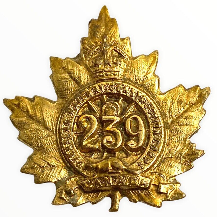WW1 Canadian CEF 239th Battalion Collar Insignia Single The WW1 Canadian CEF 239th Battalion Collar Insignia Single is a captivating piece of military history. Representing the 239th Battalion, Canadian Expeditionary Force (CEF), this insignia is a testament to the bravery and dedication of Canadian soldiers who served during the First World War. Precision-crafted, it features distinct regimental insignias and intricate detailing, reflecting the pride and identity of the battalion. Such insignias were typically worn on the collar, signifying the wearer’s association with the 239th Battalion, a unit known for its contributions to the Canadian military efforts during the war. This particular piece is a single collar insignia, making it an intriguing find for collectors and historians alike. Its condition and craftsmanship offer a tangible link to the past, honoring the legacy of those who served with honor and distinction. The WW1 Canadian CEF 239th Battalion Collar Insignia Single is not just a collectible, but a cherished artifact that narrates the enduring story of courage