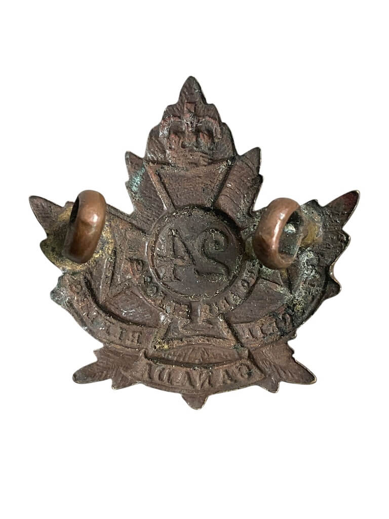 The WW1 Canadian CEF 24th Battalion Collar Insignia Single is an authentic collectible item representing Canada’s military history. It was a distinguishing mark of the 24th Battalion, which was part of the Canadian Expeditionary Force during World War I. The badge, typically fastened to the collar of a soldier’s uniform, communicated one’s battalion affiliation. This particular insignia has the essential characteristics of original items from the period. It’s designed according to traditional specifications, featuring the iconic ’24’ symbol encircled by a wreath. Materials traditionally used include brass or bronze, which could patinate over time—an effect that can further attest to the insignia’s authenticity. Collectors and military history enthusiasts can appreciate the item for its historical value and its role in relation to the overall history of the Canadian armed forces. Please note that any resemblance to replicas should be judged on an individual basis and is not guaranteed in this description.