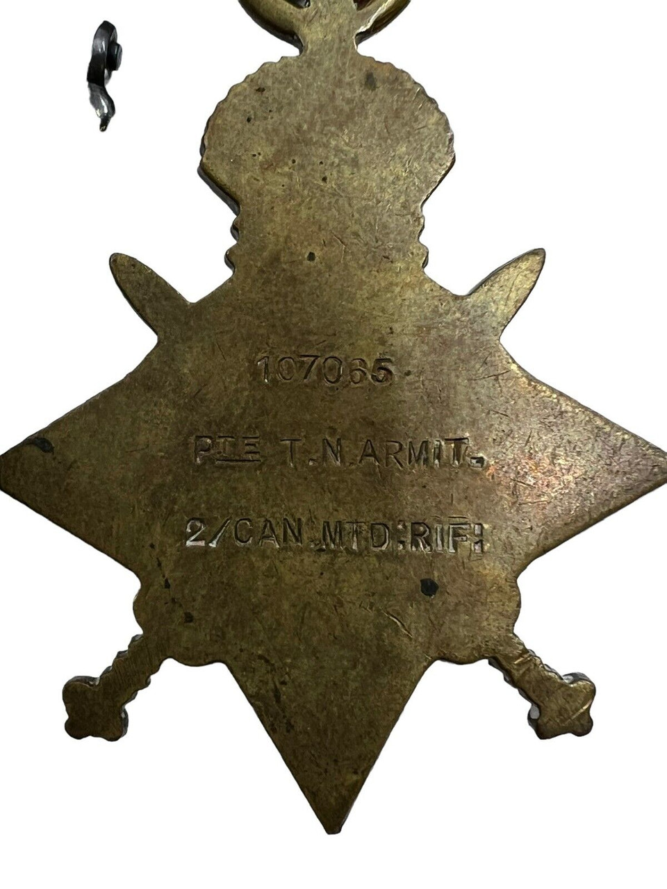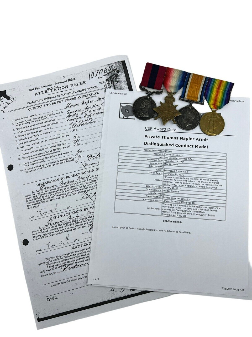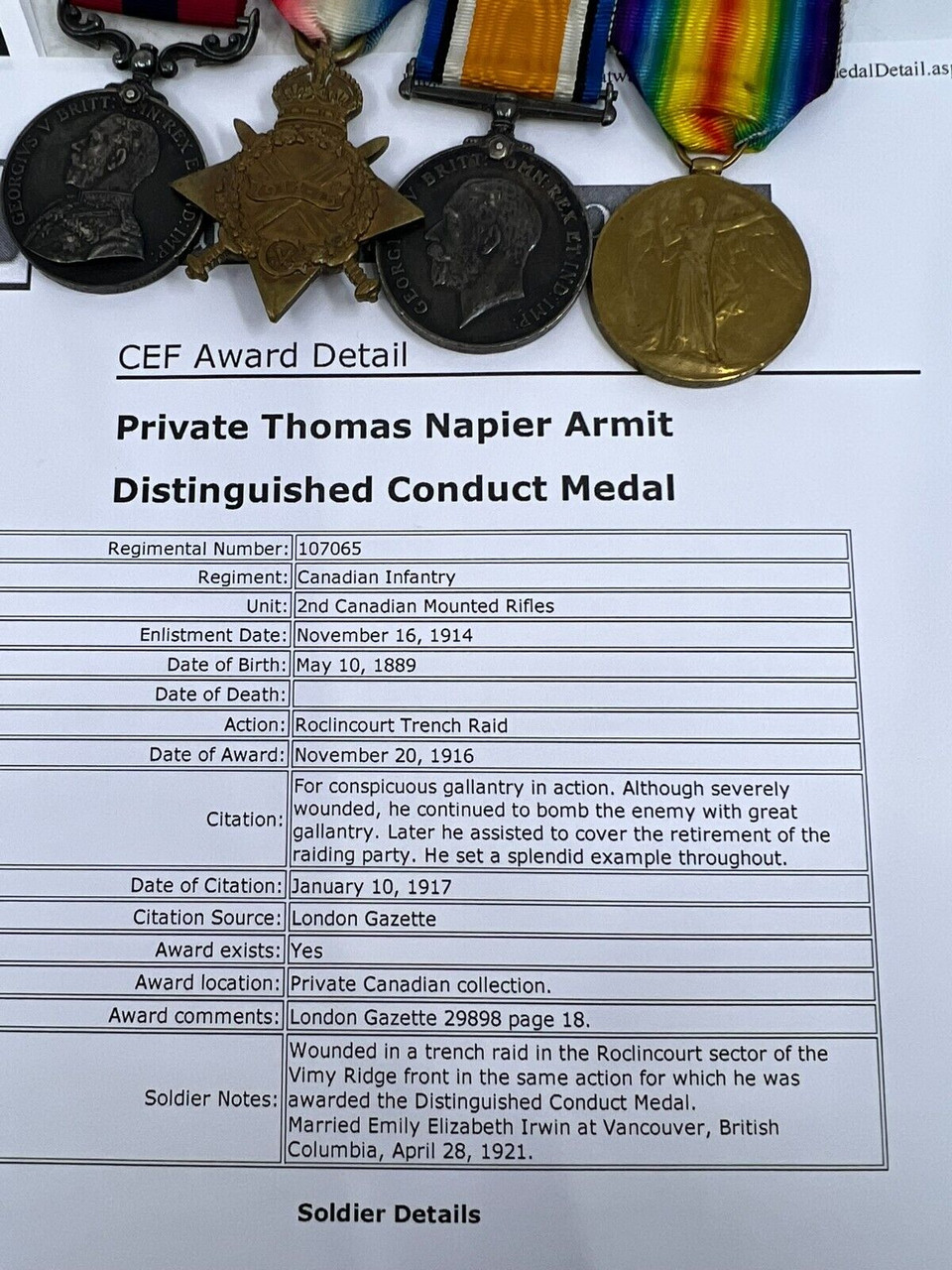 WW1 Canadian CEF 2nd CMR DCM Trio Medal Group 107065 Pte TN Armit with Research