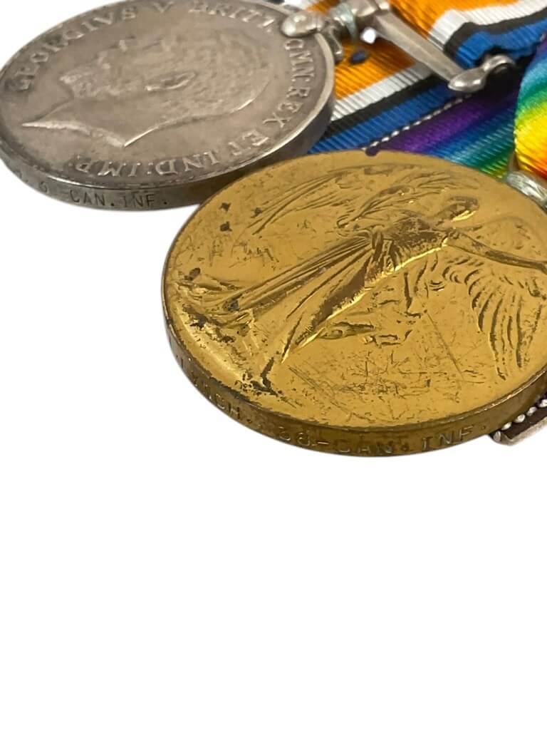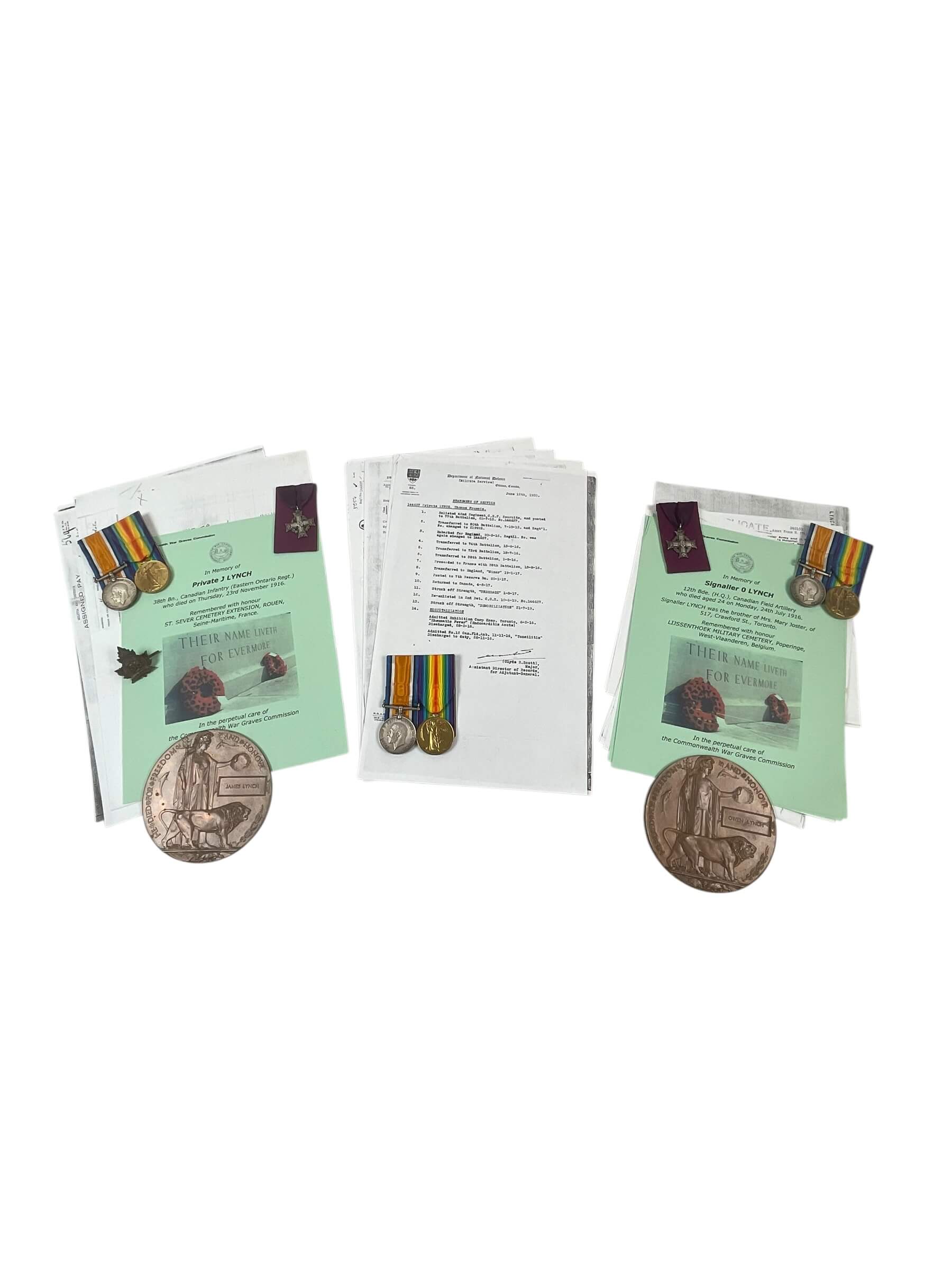 This item is a World War I Canadian Expeditionary Force (CEF) group representing three brothers who served with the 38th Battalion. Two of the brothers were killed in action. The grouping consists of original medals, documentation, and related service records that reflect their military histories. The 38th Battalion, also known as the Ottawa Battalion, was raised in 1915 and served on the Western Front in France and Flanders. Units like the 38th Battalion played a significant role in several major battles involving the Canadian Corps. The inclusion of two KIA (killed in action) members underscores the significant losses faced by families during the conflict. This grouping provides a focused perspective on the impact of the war on Canadian families and highlights the service and sacrifice of soldiers in the CEF. All items are attributed and related to the named individuals, offering valuable research potential within the context of Canadian military history.