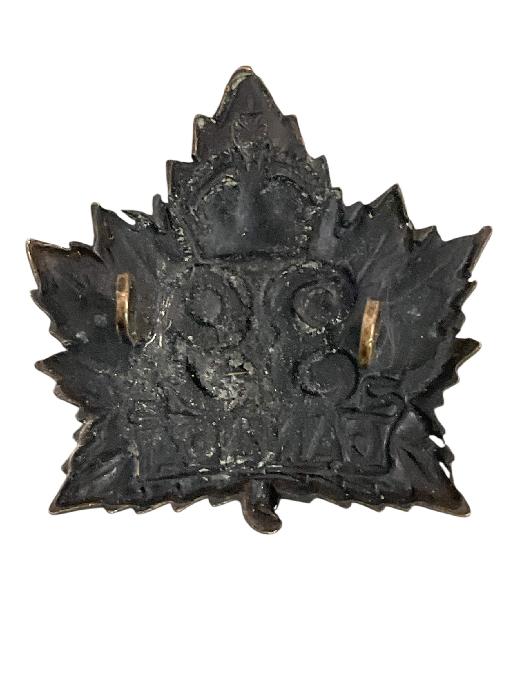 The WW1 Canadian CEF 39th Battalion Cap Badge is an original insignia associated with the 39th Battalion of the Canadian Expeditionary Force during the First World War. The badge typically features a maple leaf design, a standard motif for Canadian military emblems of the era, with the battalion’s identifying number “39” prominently displayed at the center. Above the number, “Canada” is inscribed, signifying the unit’s national affiliation, while a scroll beneath often reads “39th Battalion.” This cap badge was worn by members of the 39th Battalion on their service caps as part of their official uniform, serving both as a means of identification and unit pride. The 39th Battalion was raised in Ontario and primarily served in a reinforcement role, providing trained soldiers for front-line Canadian units in Europe. Constructed from brass or bronze, such badges are collectable relics from Canada’s participation in the First World War.