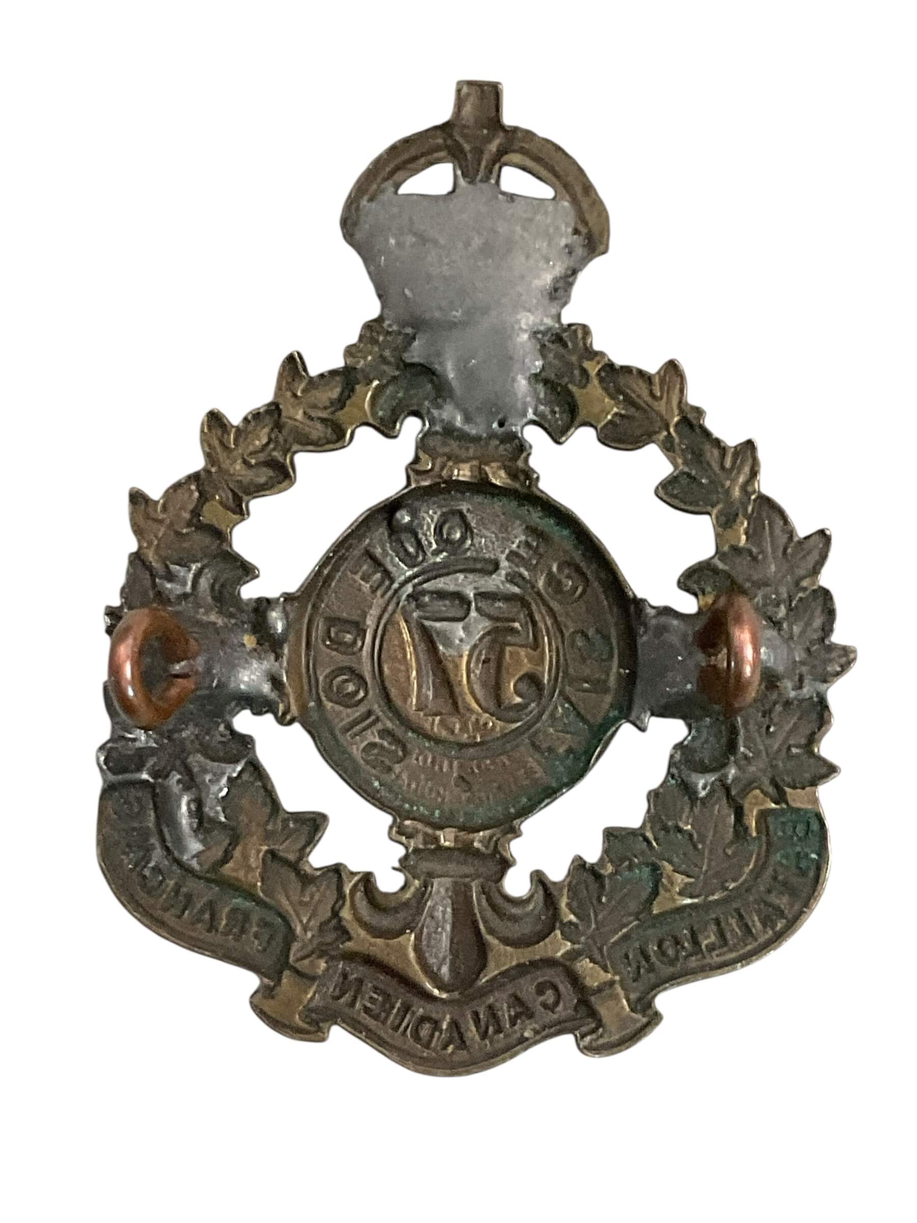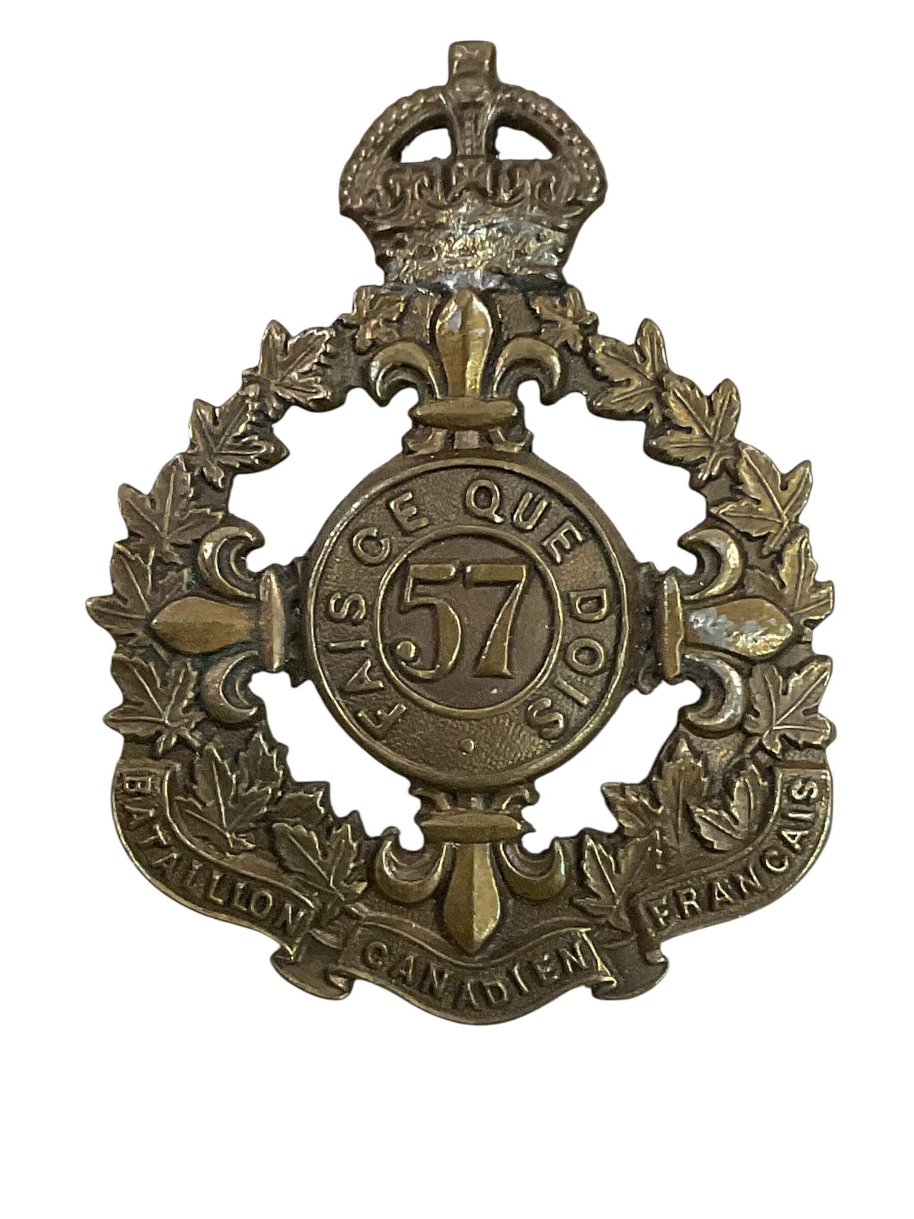 The WW1 Canadian CEF 57th Battalion Cap Badge is a historical military insignia issued to members of the 57th Battalion of the Canadian Expeditionary Force during the First World War. This brass badge features the battalion’s identifying number, “57,” prominently displayed on a maple leaf design, which symbolizes Canada. The badge also includes a crown at the top, signifying service under the British Empire, and commonly incorporates a scroll at the base inscribed with “CANADA” or the full unit title. The 57th Battalion was authorized in 1915 and recruited primarily from Quebec, contributing reinforcements for Canadian forces on the Western Front. Cap badges such as this were worn on the front of the service cap, serving both as a mark of identity and unit pride. This artifact represents the organizational structure and distinctive heritage of Canadian forces during the Great War period. It is of interest to collectors and historians studying Canadian military history.