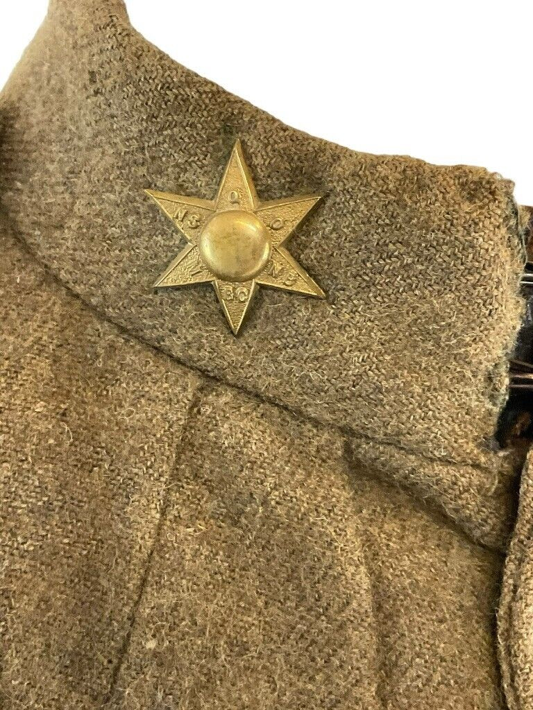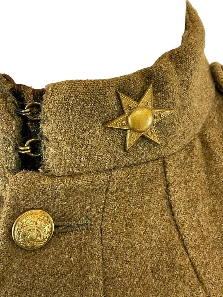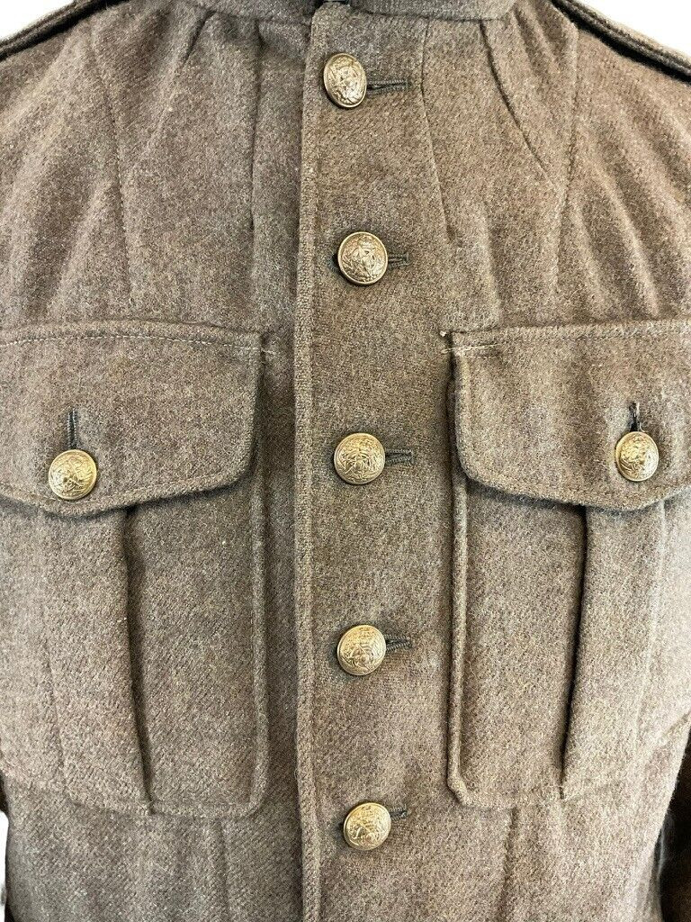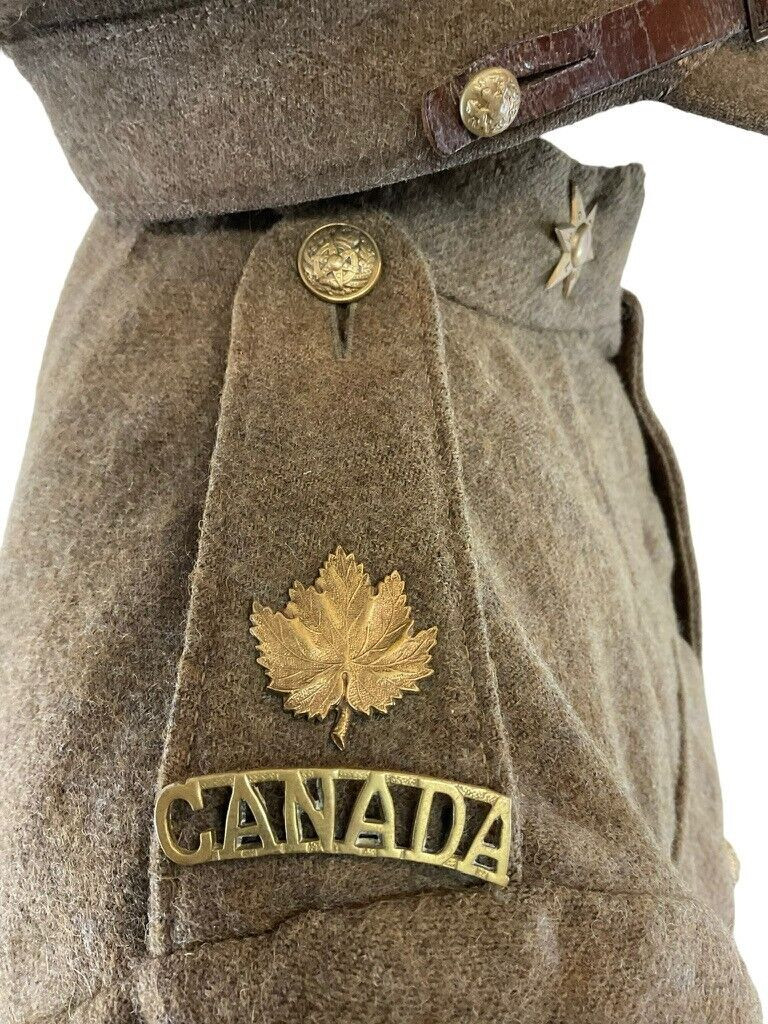 WW1 Canadian CEF 7 Button 1903 Ptn Tunic 1905 Pattern Peak Cap GGFG Ex Clive Law This collection piece includes a historically significant WW1 Canadian CEF 7 Button 1903 Pattern Tunic paired with a 1905 Pattern Peak Cap. Worn by members of the Canadian Expeditionary Force, the tunic features a classic seven-button front design. The 1905 Pattern Peak Cap complements the tunic, adhering to the Canadian military dress codes of the early 20th century. Originating from the Governor General’s Foot Guards (GGFG), this set exemplifies the distinctive uniforms worn by Canadian soldiers during the Great War. Remarkably, this collection piece comes from the esteemed collection of Clive Law, a renowned military historian whose expertise lends additional historical credibility and value. This duo offers a tangible connection to Canada’s military heritage, making it an invaluable acquisition for collectors and historians alike.