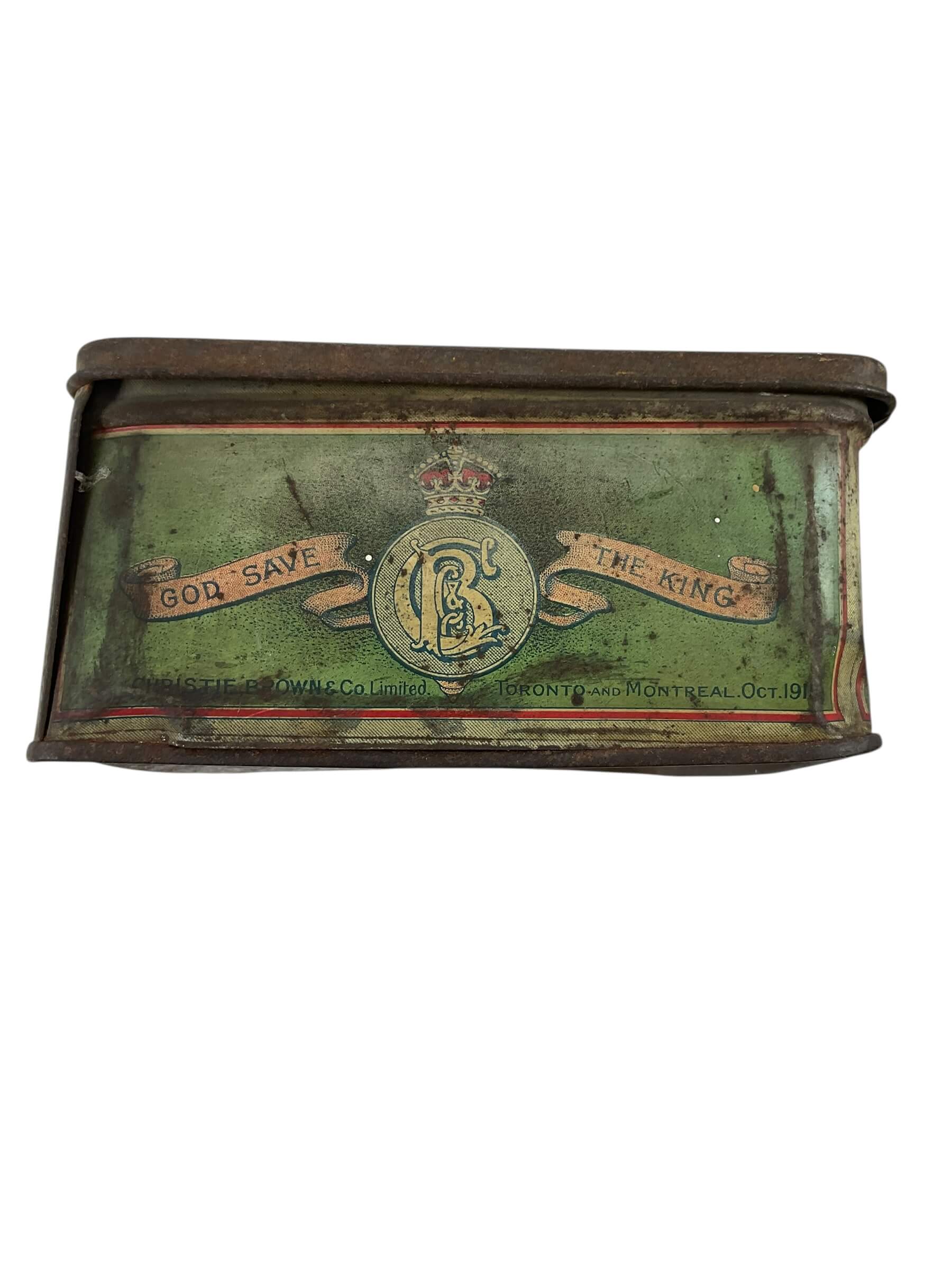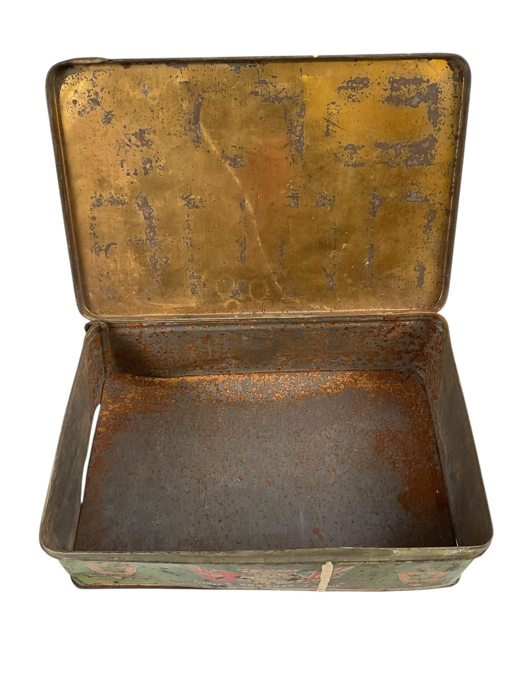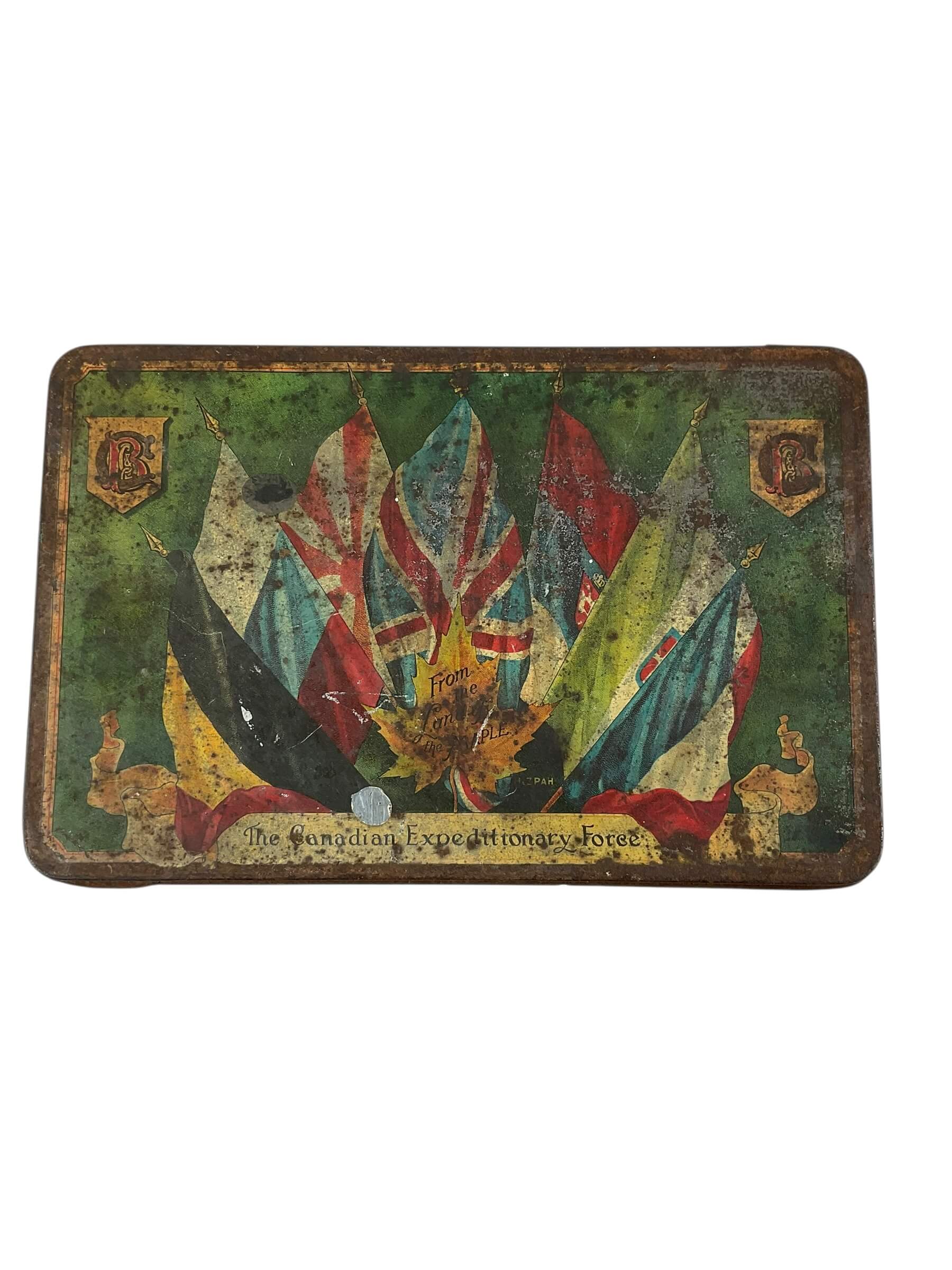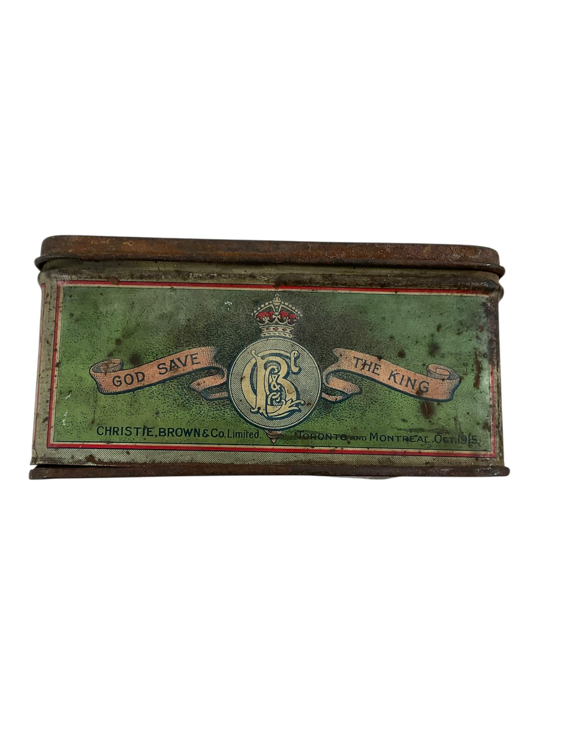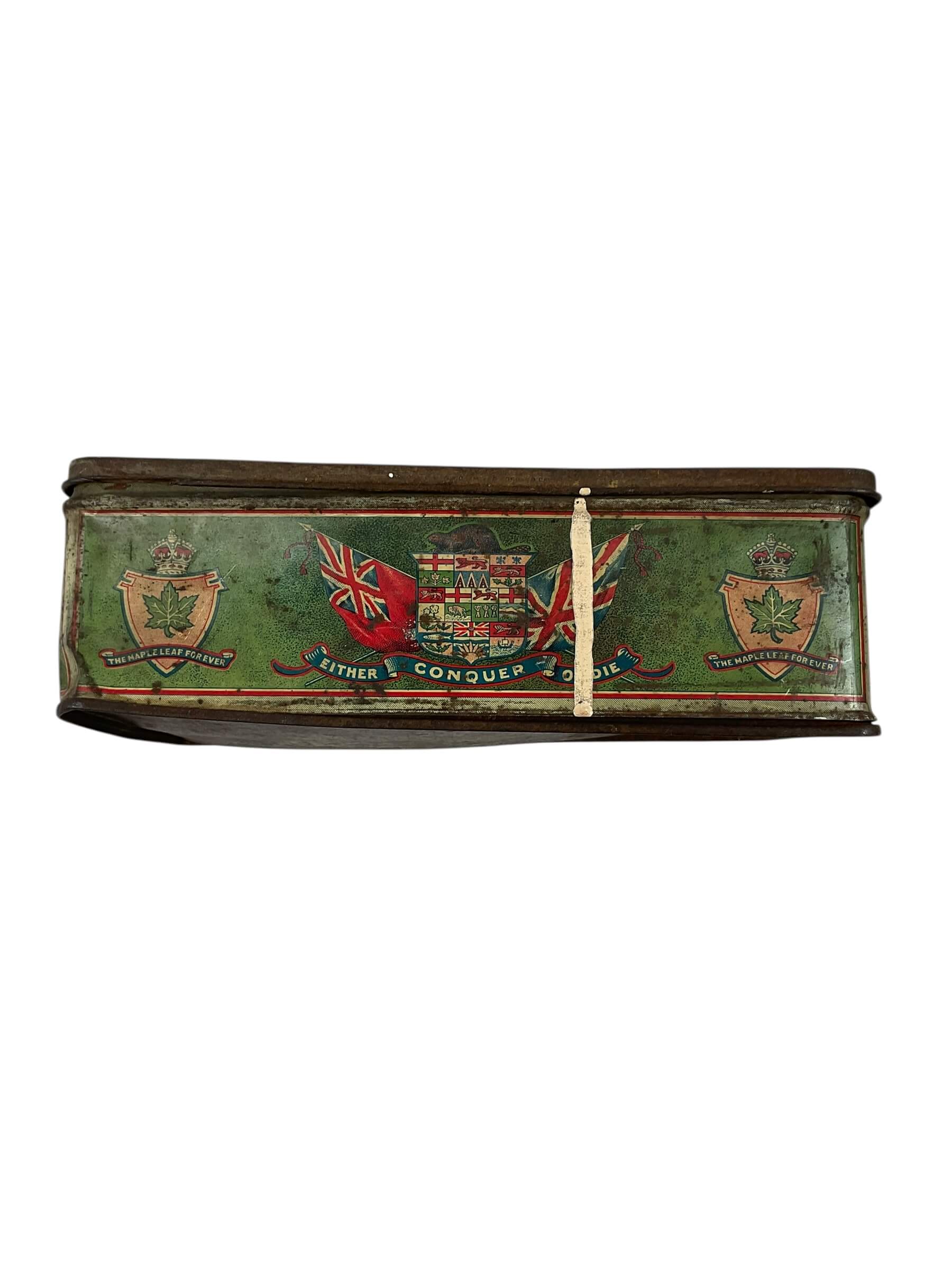 This item is a WW1 Canadian CEF Biscuit Tin, dated 1915, and currently empty. The tin is an authentic piece of Canadian military memorabilia, designed to hold biscuits for soldiers in the Canadian Expeditionary Force (CEF) during the First World War. Despite its age, the tin is in good condition, showing only the expected wear and tear from its use in the trenches and on the battlefield. Made from sturdy metal, it is rectangular in shape and features a hinged lid. The tin is marked with the date 1915, providing a tangible link to the past. The tin is empty, allowing it to serve as a unique storage space or as a collector’s display piece. With its rich history and character, this WW1 Canadian CEF Biscuit Tin is a fascinating artifact from one of the most pivotal periods in world history.