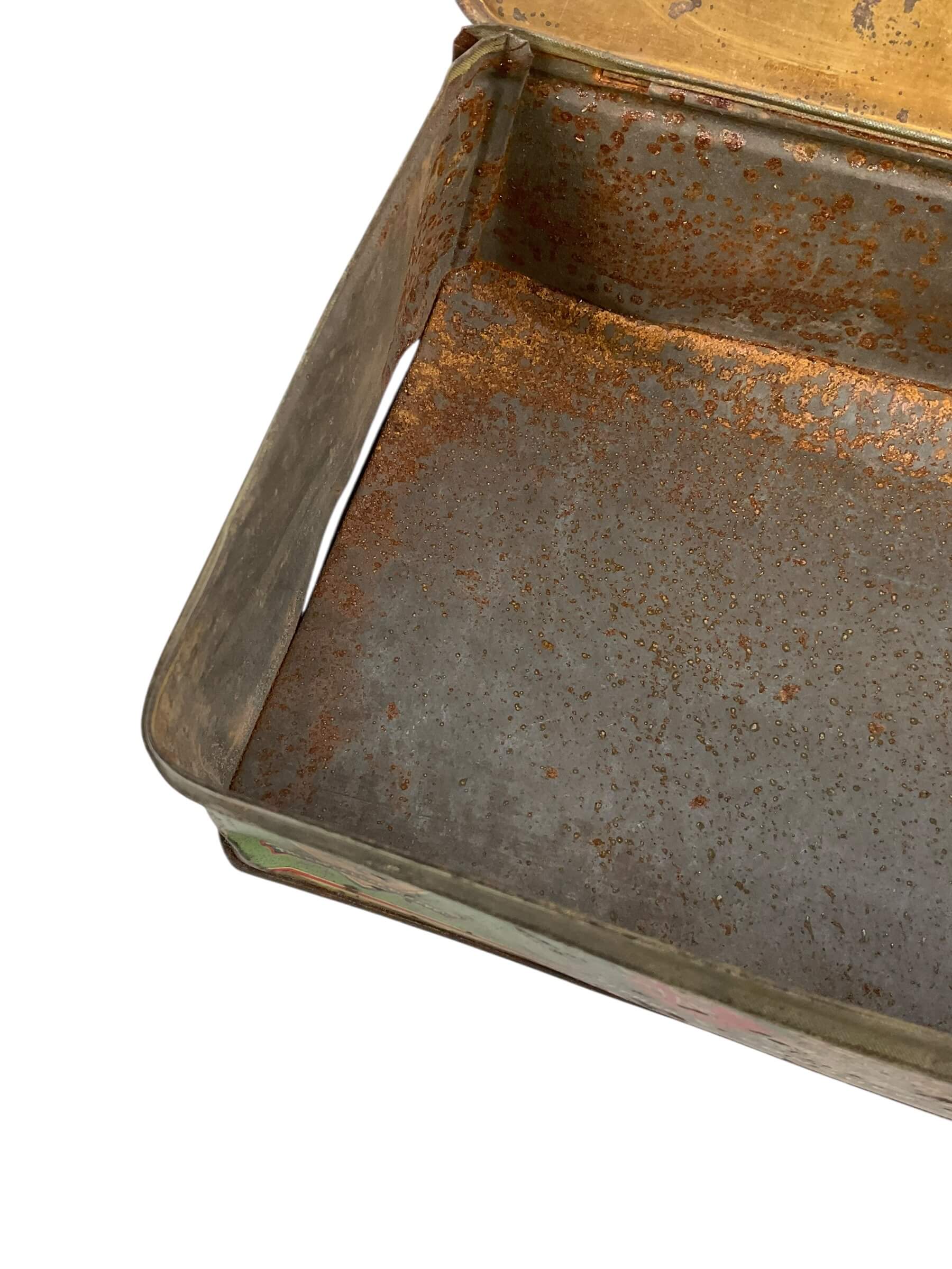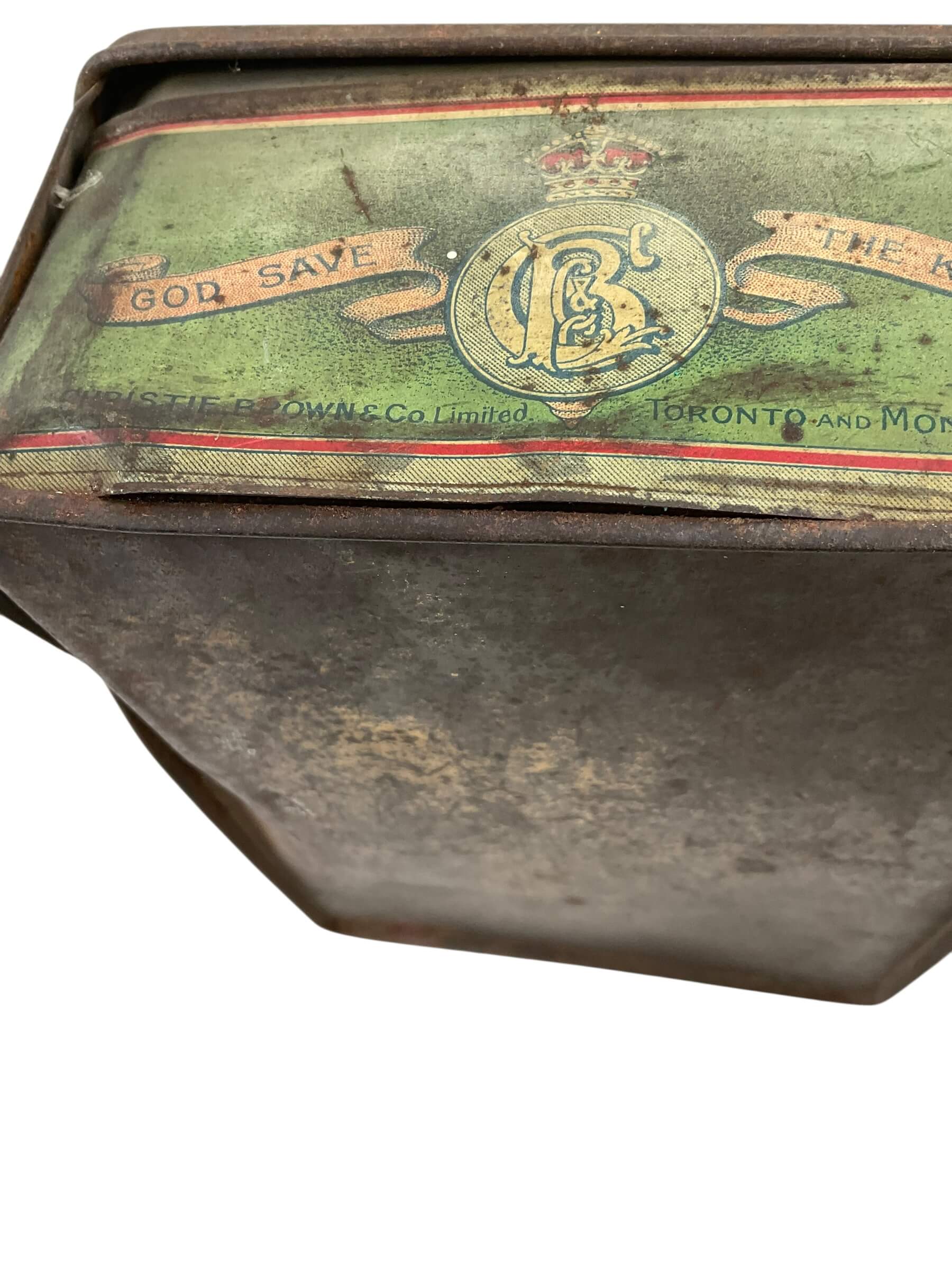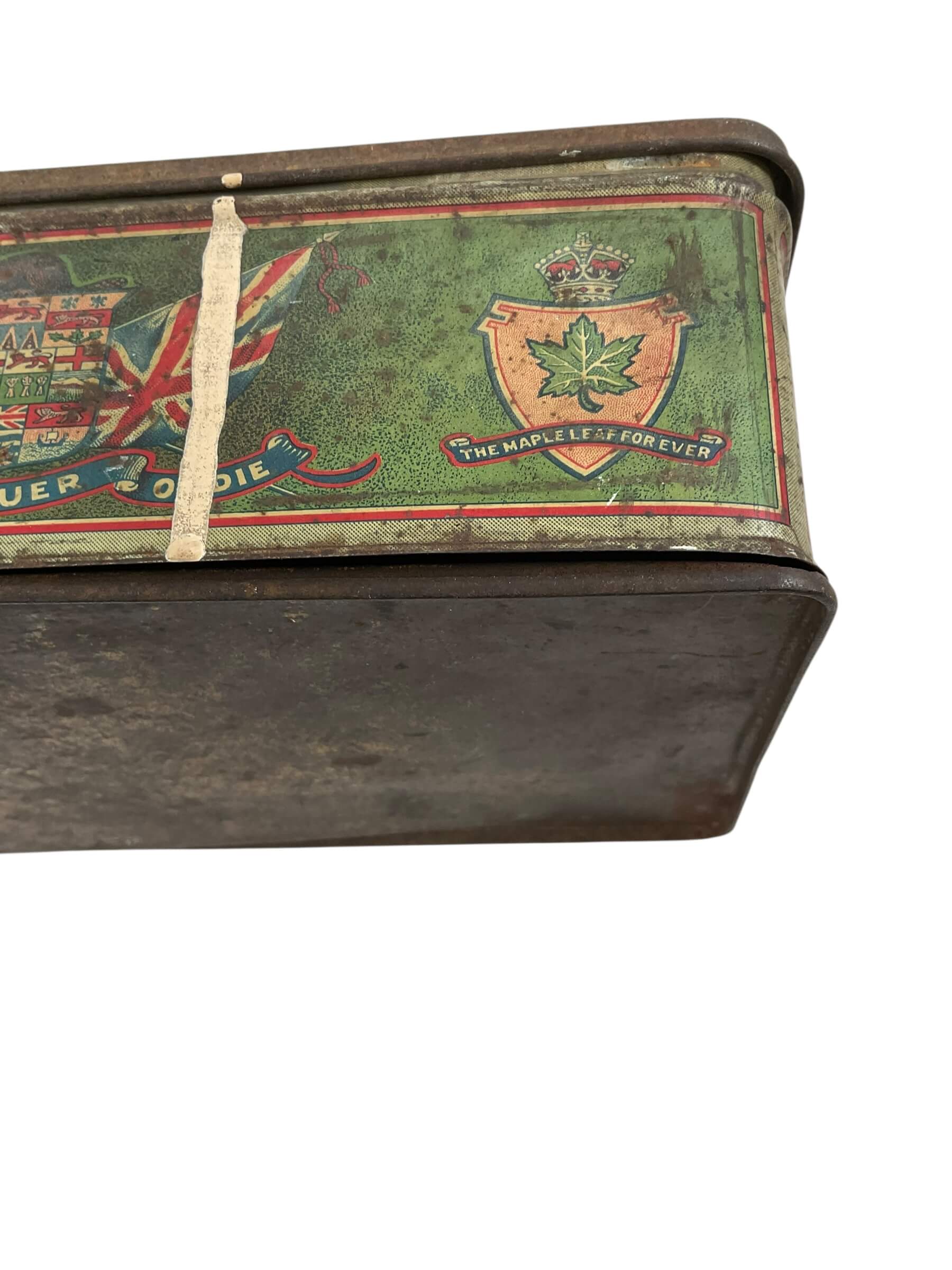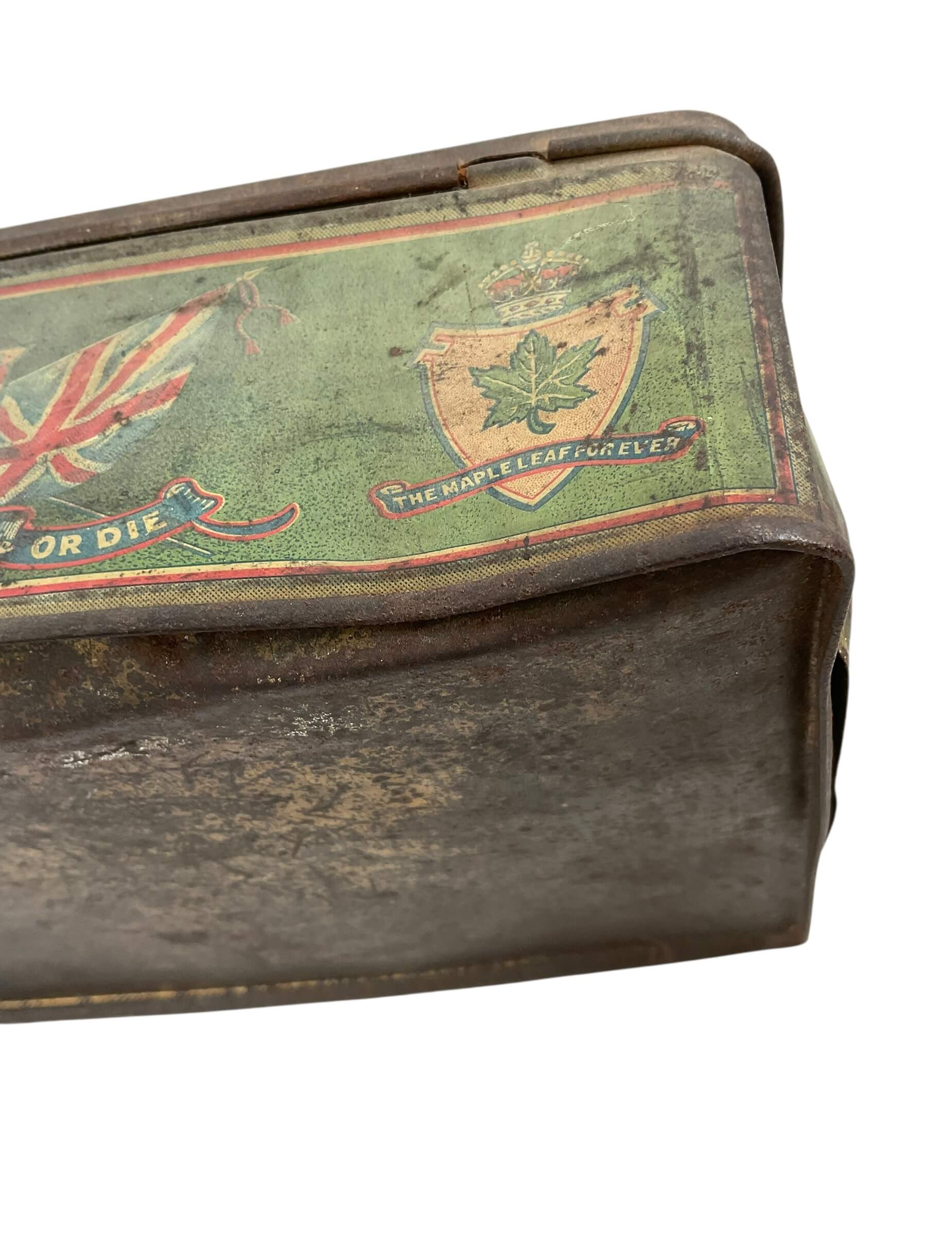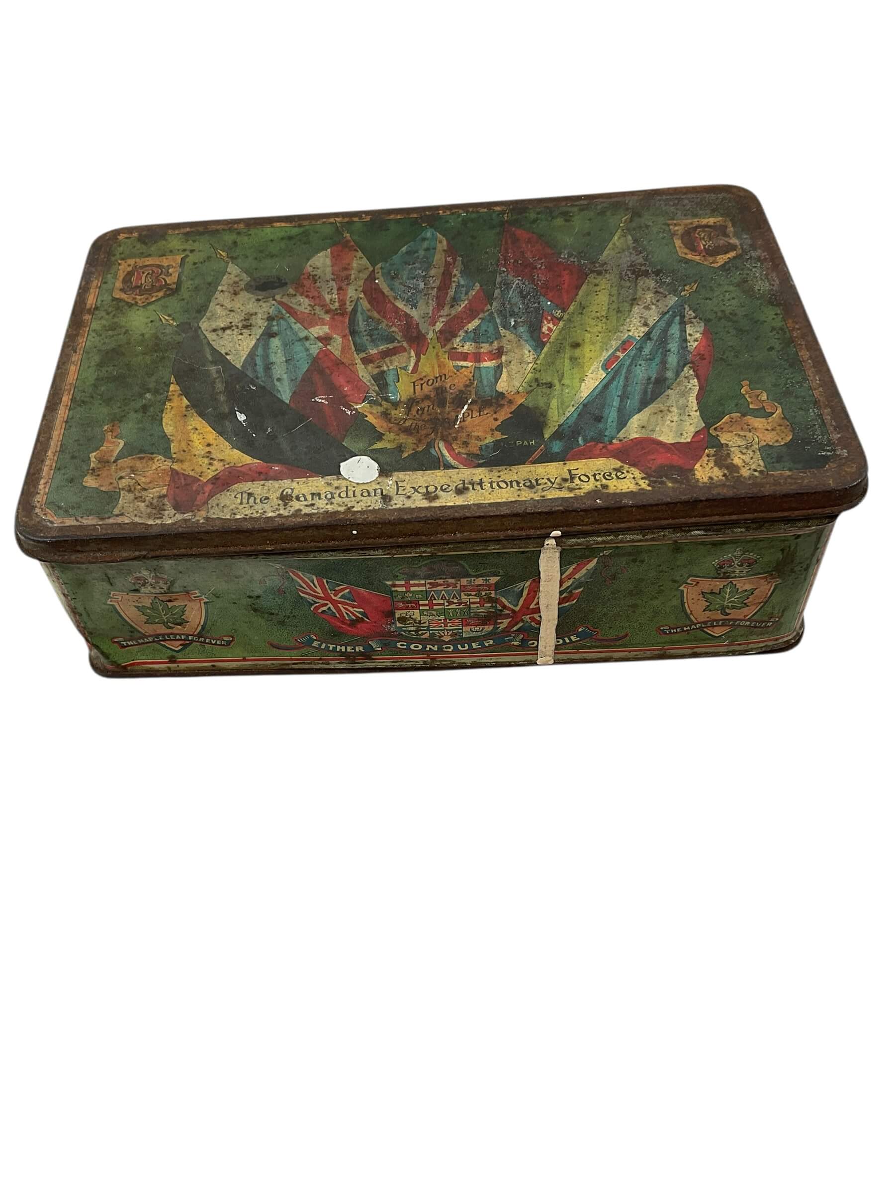 This item is a WW1 Canadian CEF Biscuit Tin, dated 1915, and currently empty. The tin is an authentic piece of Canadian military memorabilia, designed to hold biscuits for soldiers in the Canadian Expeditionary Force (CEF) during the First World War. Despite its age, the tin is in good condition, showing only the expected wear and tear from its use in the trenches and on the battlefield. Made from sturdy metal, it is rectangular in shape and features a hinged lid. The tin is marked with the date 1915, providing a tangible link to the past. The tin is empty, allowing it to serve as a unique storage space or as a collector’s display piece. With its rich history and character, this WW1 Canadian CEF Biscuit Tin is a fascinating artifact from one of the most pivotal periods in world history.