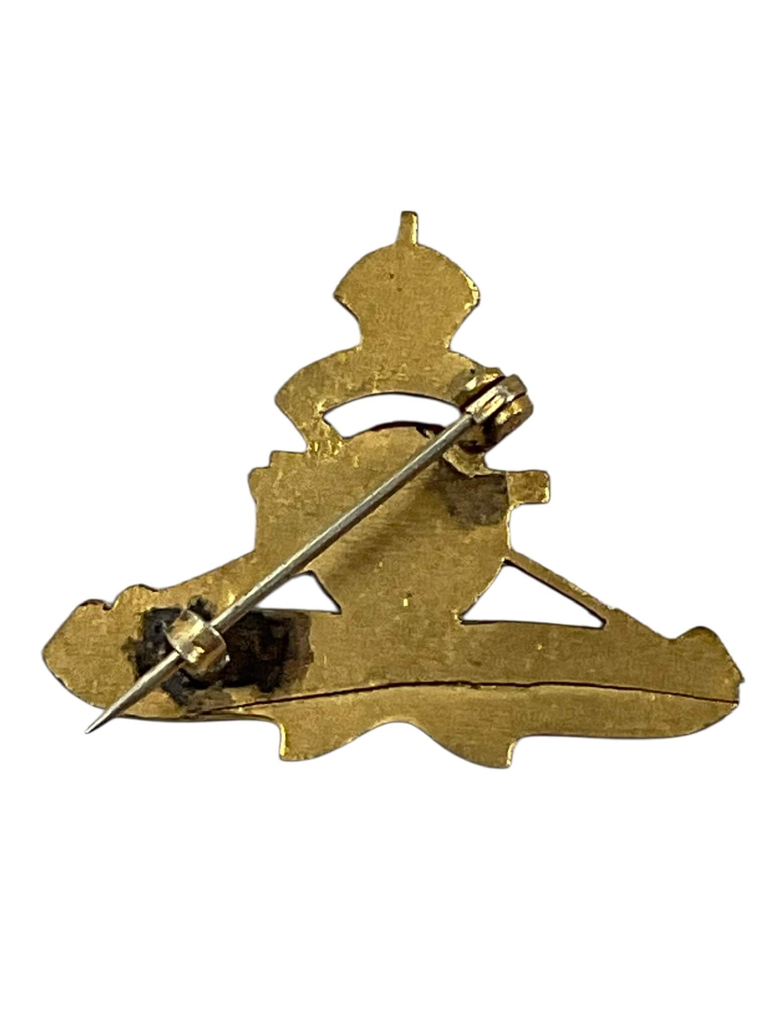 This WW1 Canadian CEF CFA Artillery Sweetheart Badge is an original piece dating from the First World War, associated with the Canadian Expeditionary Force (CEF) and the Canadian Field Artillery (CFA). Sweetheart badges were commonly given by servicemen to family members or loved ones as a memento during their deployment. The badge typically features symbolic elements such as the artillery gun and insignia indicative of the CFA, and may include the phrases “Canada” or regimental mottos, depending on the variation. Constructed from base metal with a pin-back attachment, these badges were designed for civilian wear, most often by women as a token of connection to a serving relative. The item reflects personal, wartime traditions and the role of military emblems in supporting morale on the home front. This badge serves as a historical artifact representative of early twentieth-century Canadian military and social history.