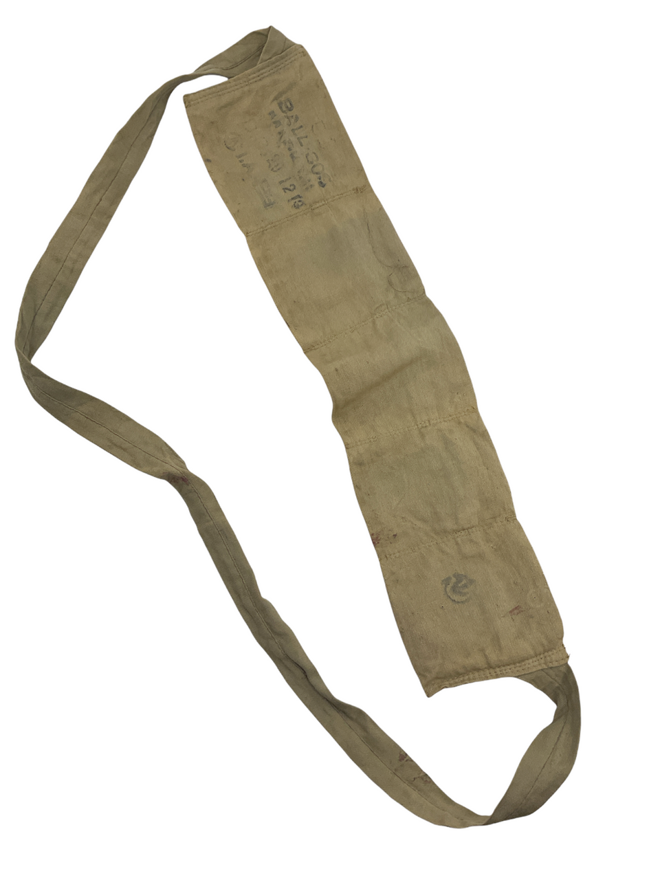 The WW1 Canadian CEF Cloth .303 Bandolier 2 is a historic military artifact from the First World War, specifically utilized by the Canadian Expeditionary Force (CEF). Constructed from durable cloth, this bandolier was designed to hold .303 caliber rifle ammunition, crucial for the soldiers on the front lines. The bandolier features multiple pouches, each capable of securely carrying several rounds, ensuring that troops had quick and easy access to their ammunition during combat. The design not only highlights the practical needs of the time but also reflects the resourcefulness and resilience of the Canadian forces. As a collectible, it offers a tangible connection to the bravery and sacrifices of those who served, providing a poignant reminder of the rich military heritage and the pivotal role Canada played in the Great War. This artifact is of great interest to historians, collectors, and anyone fascinated by military history.
