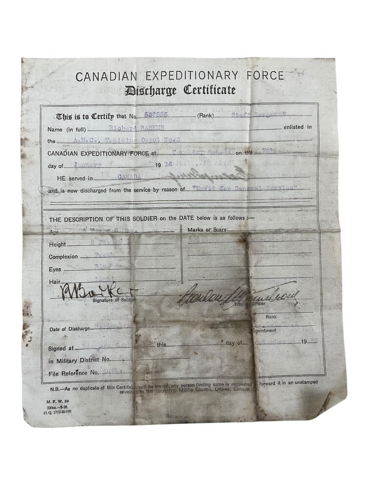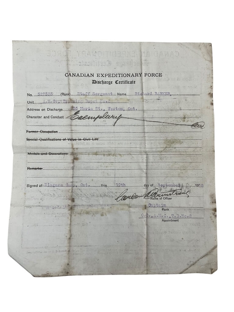 WW1 Canadian CEF Discharge Certificate CAMC Staff Sergeant Barker