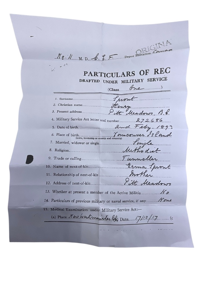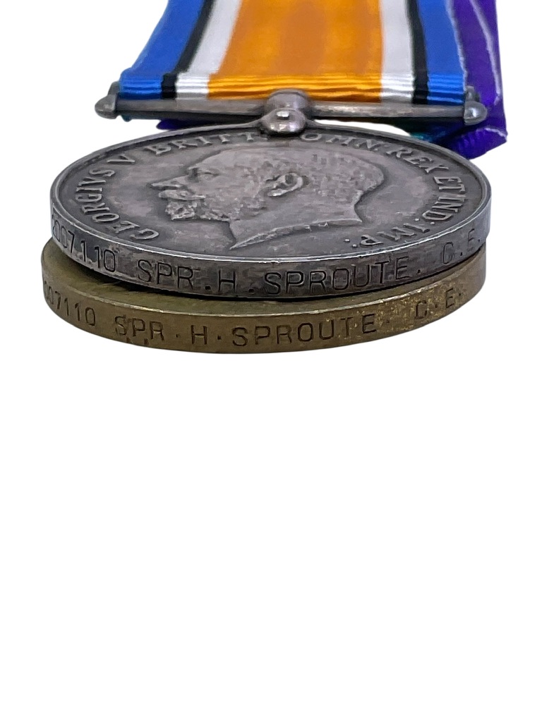The WW1 Canadian CEF Medal Group Pair 2007110 H. Sproute Canadian Engineers Tunneller is a set of two medals awarded to Sapper H. Sproute, service number 2007110, who served with the Canadian Engineers Tunnelling Companies during the First World War. The group typically consists of the British War Medal and the Victory Medal, each officially impressed with the recipient’s service details: “2007110 SAPR. H. SPROUTE. CAN. ENG.” Tunnelling companies were specialized units responsible for underground operations, including mining and counter-mining beneath enemy lines. These roles were vital to the war effort, particularly on the Western Front. Sapper H. Sproute’s participation in the Canadian Expeditionary Force highlights the varied technical and combat roles undertaken by Canadian engineers during the conflict. The medals are preserved with their original naming and represent both individual service and a significant aspect of Canadian military history in the First World War.