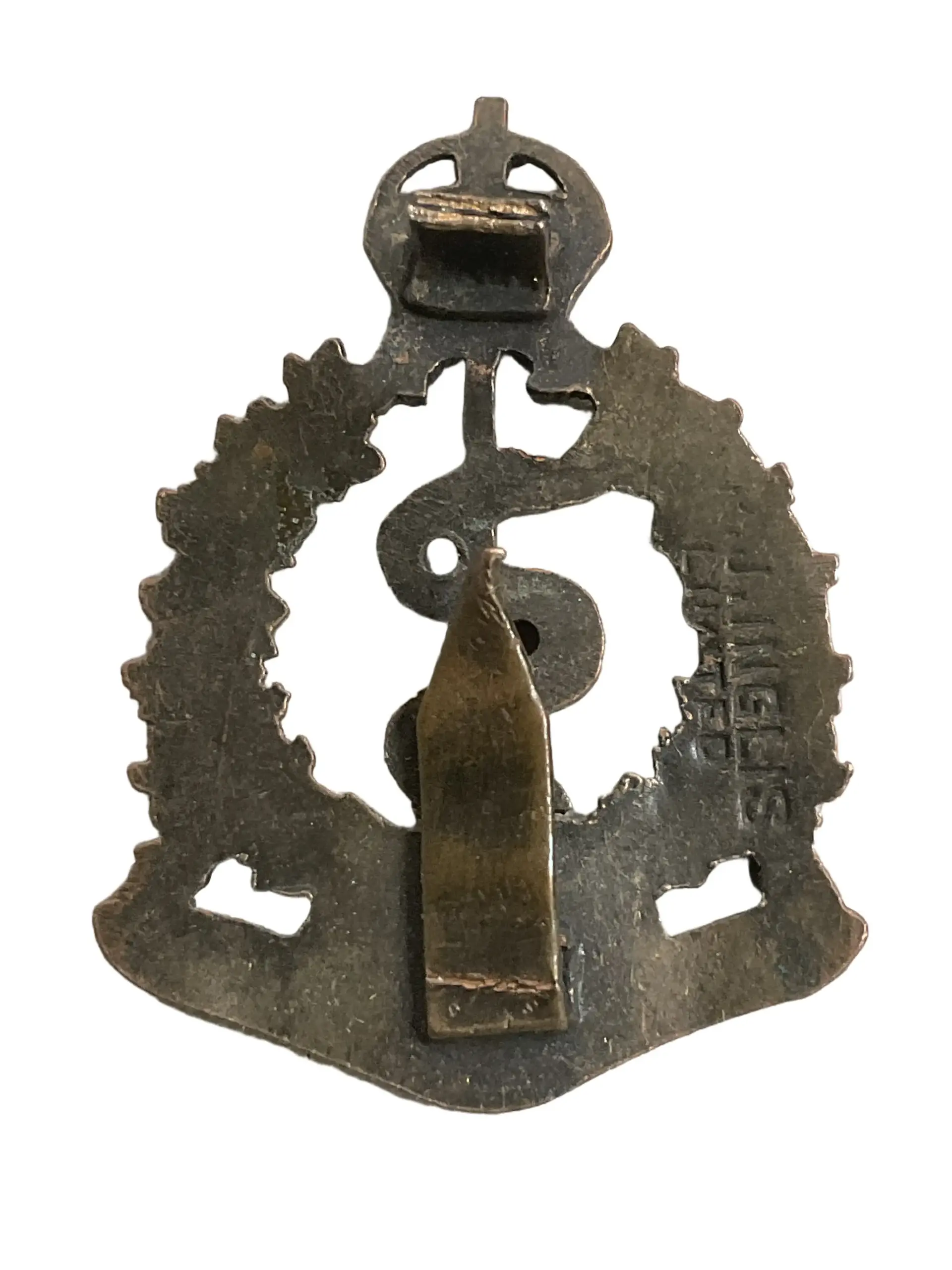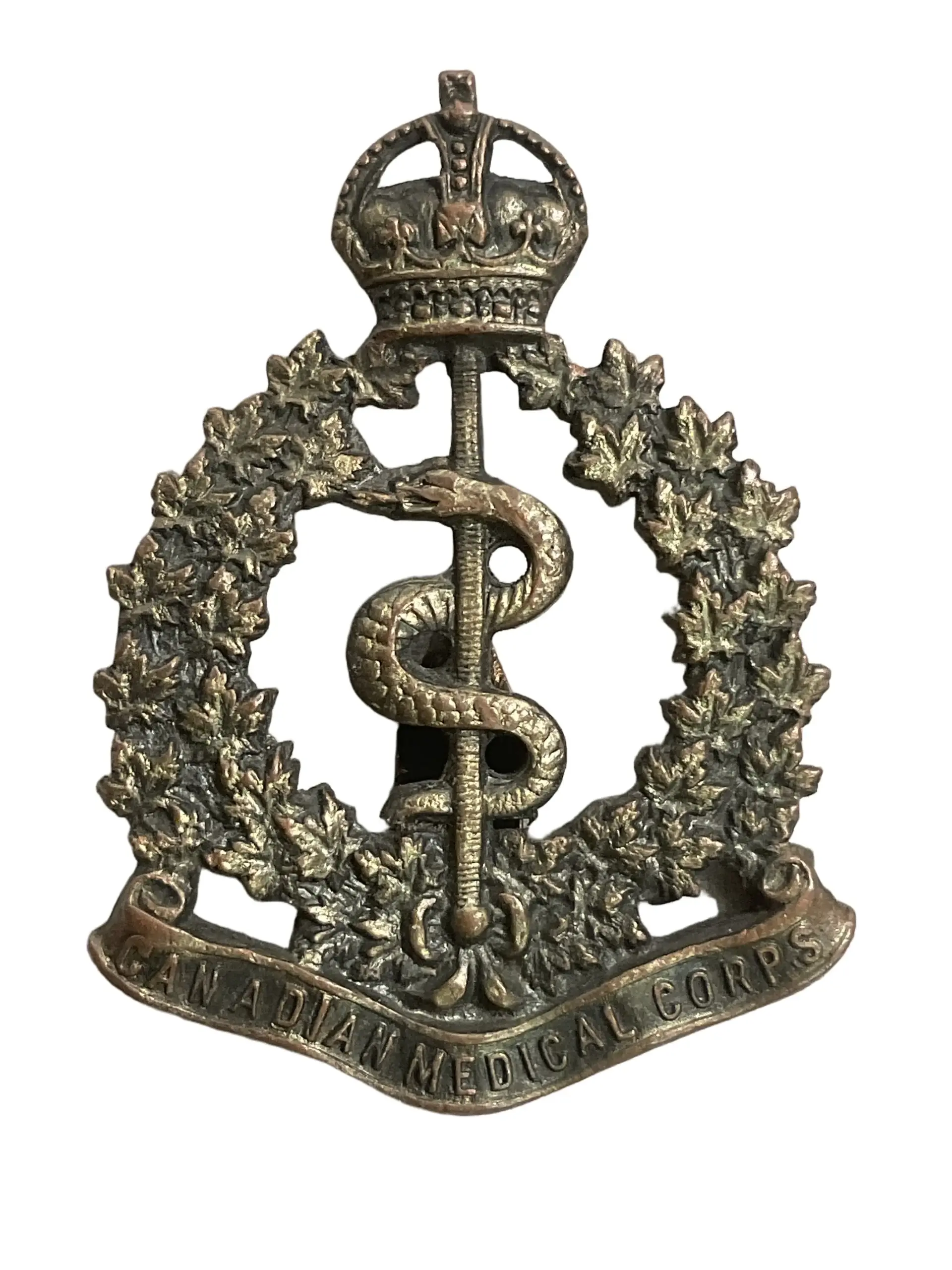 This item is a World War I-era Canadian Expeditionary Force (CEF) Medical Corps Officer’s bronze collar insignia, offered as a single piece. The insignia features the traditional design adopted by the Canadian Army Medical Corps during the First World War. It is constructed from bronze, which was commonly used for officer’s insignia during this period. The design typically consists of the Geneva Cross superimposed over a laurel wreath, with a scroll or banner displaying the corps designation. Collar badges like this were worn in pairs on the service dress uniform, positioned on the collar tabs to signify the wearer’s branch and rank. Such insignia were issued to officers serving in medical roles within the CEF, providing both identification and an element of regimental pride. This artifact reflects the organization and distinction of Canadian military medical personnel during the 1914–1918 conflict.